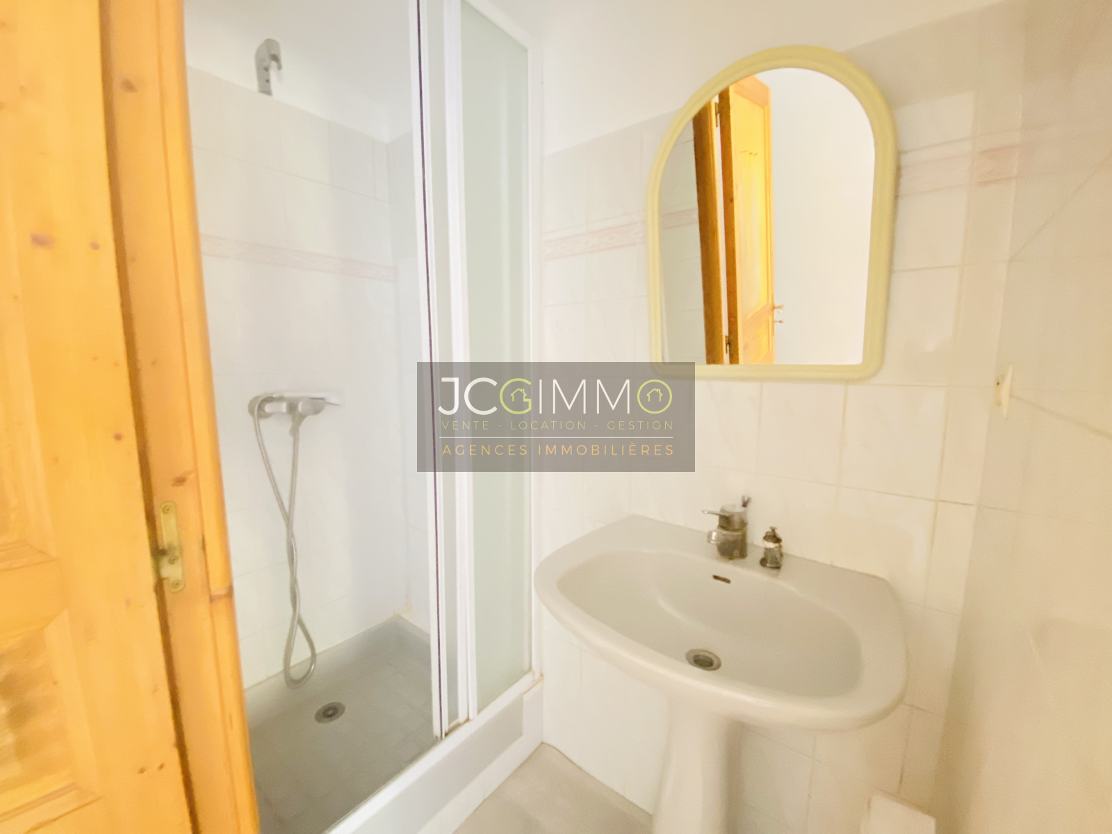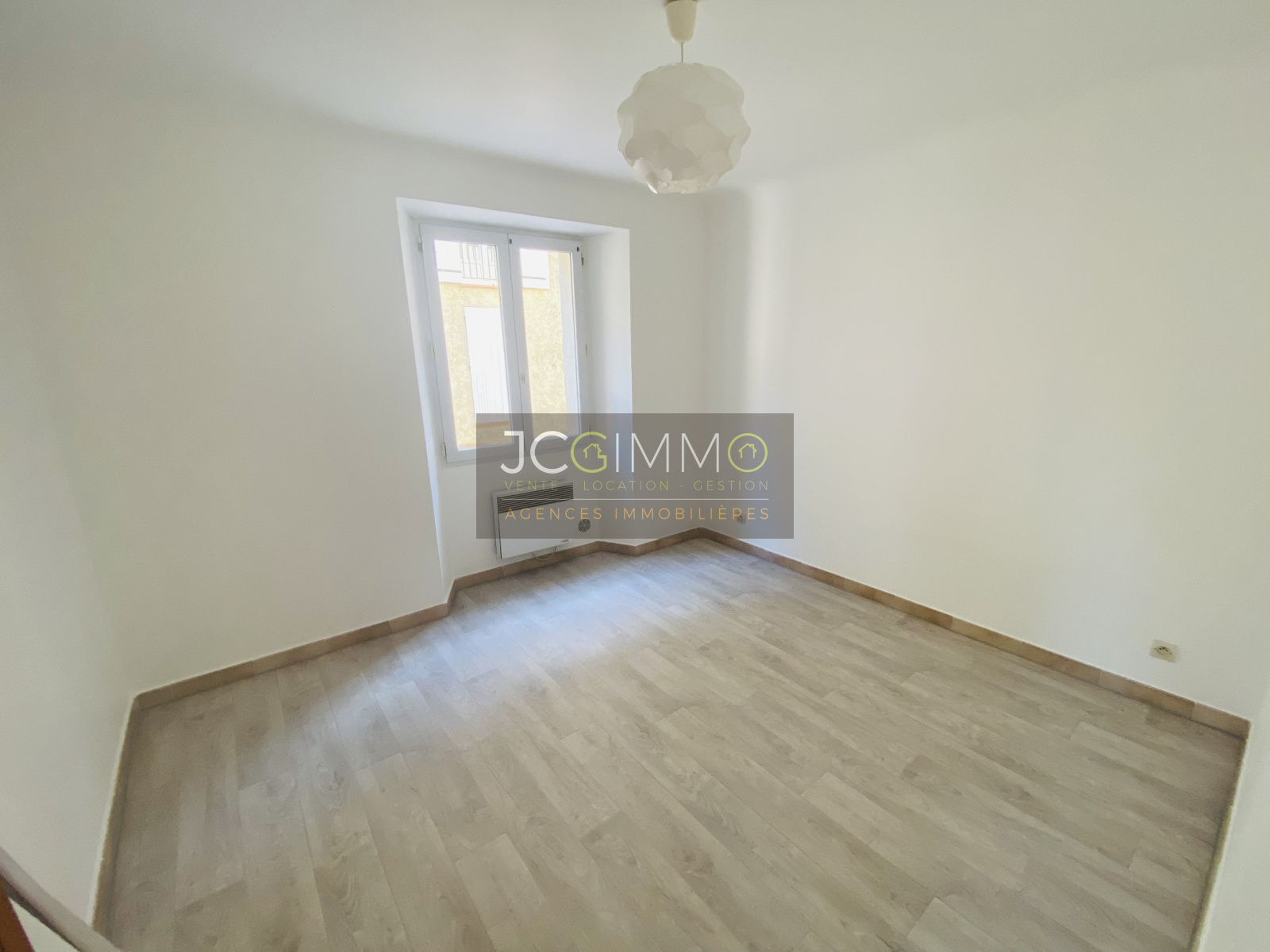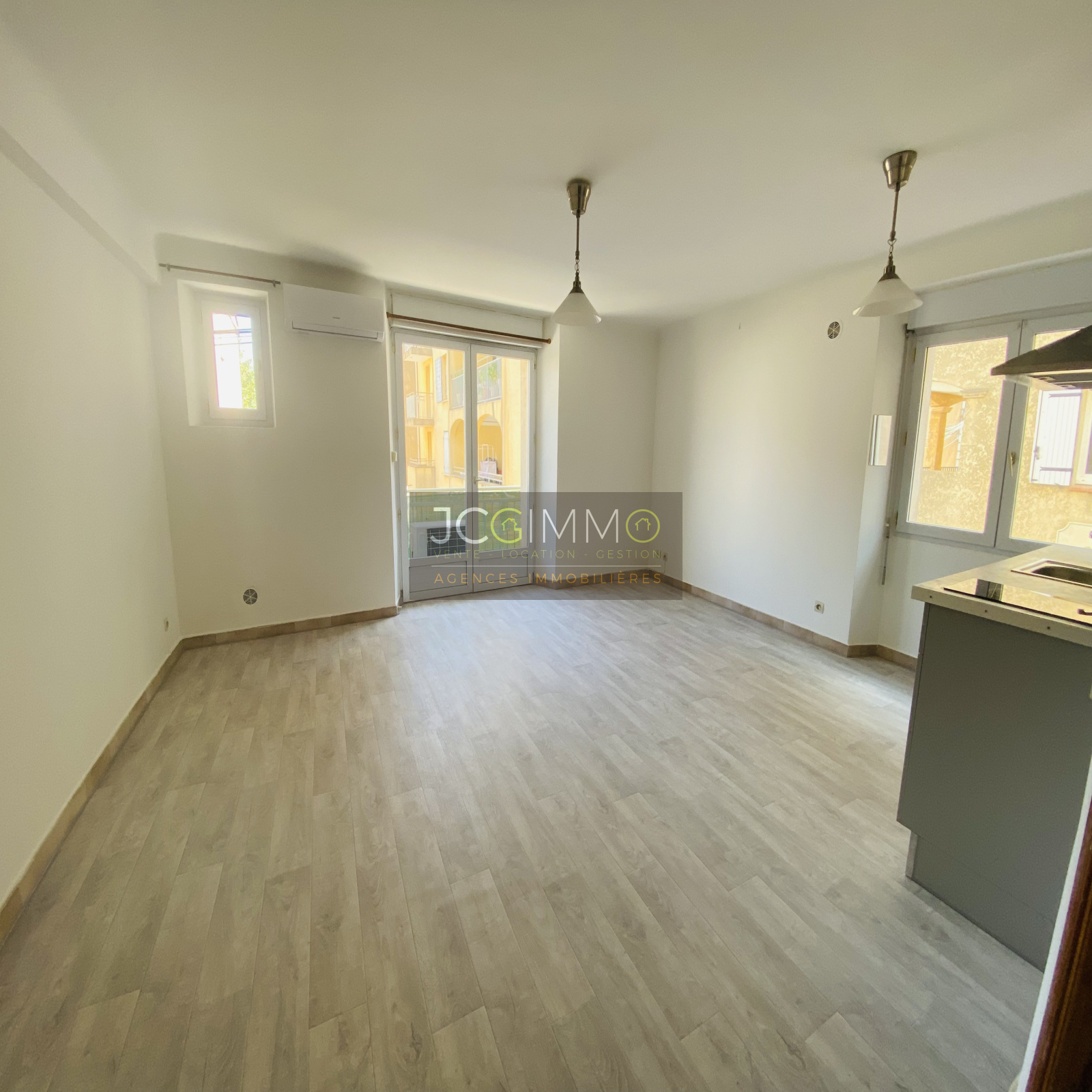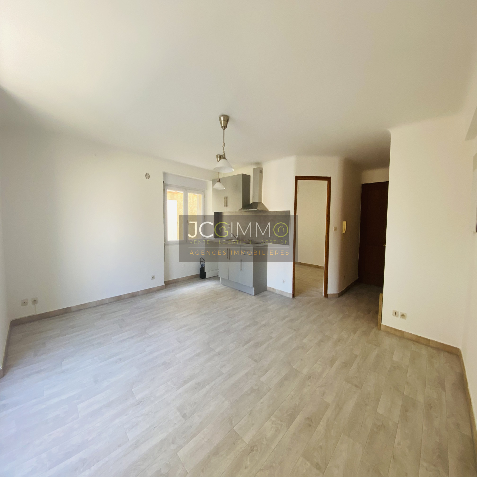 L'appartement se compose de la manière suivante : une entrée 2.87m2 qui dessert une pièce à vivre de 22,85 m2 avec cuisine américaine aménagée et équipée (plaque de cuisson et hotte), une chambre de 9.62m2, une salle d'eau et un wc.