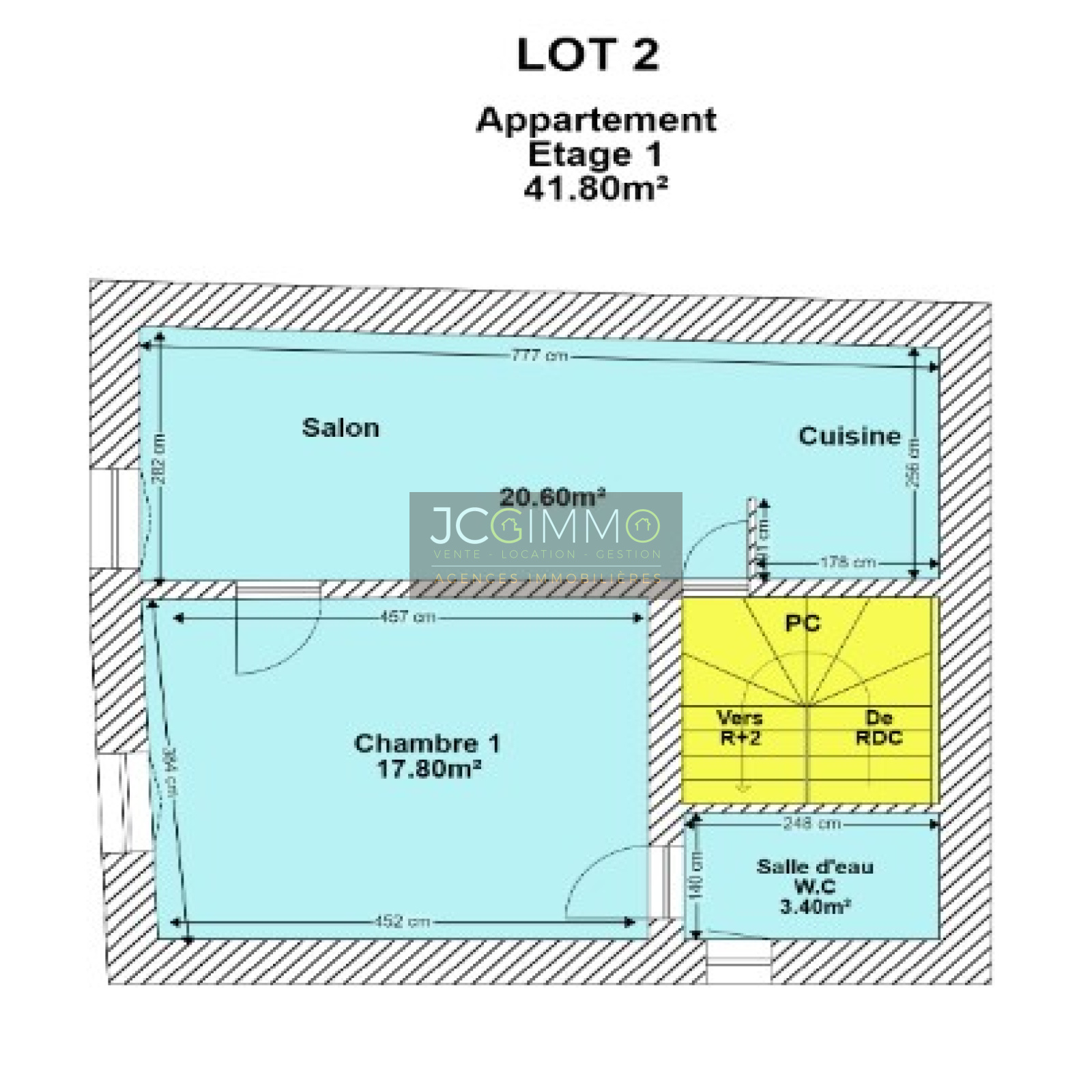 Il se compose d'un séjour/cuisine de 20,60m², d'une chambre de 17,80m² et d'une salle de bains (avec wc) de 3,40m².
