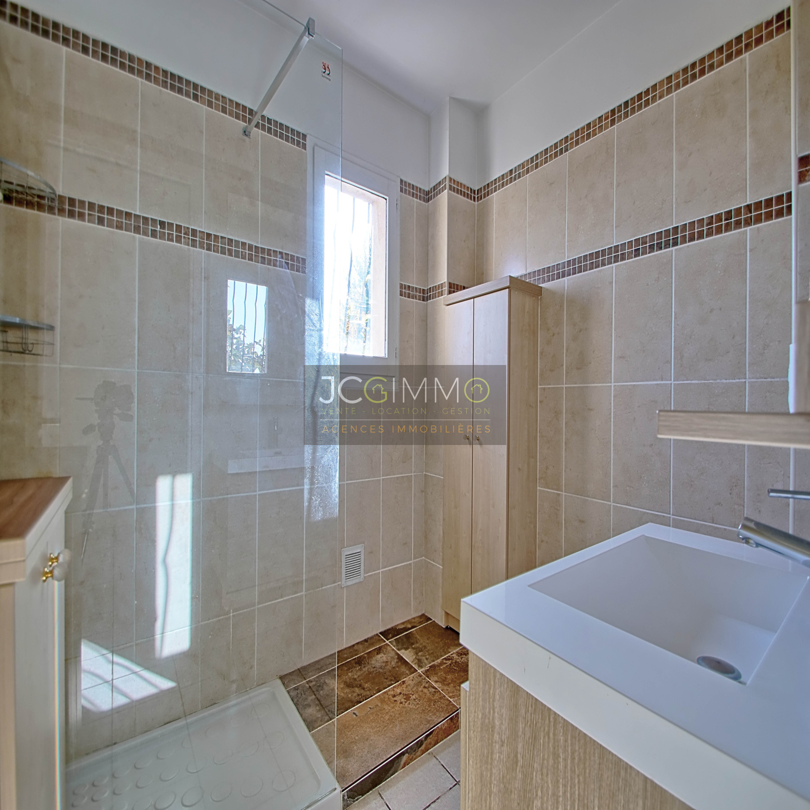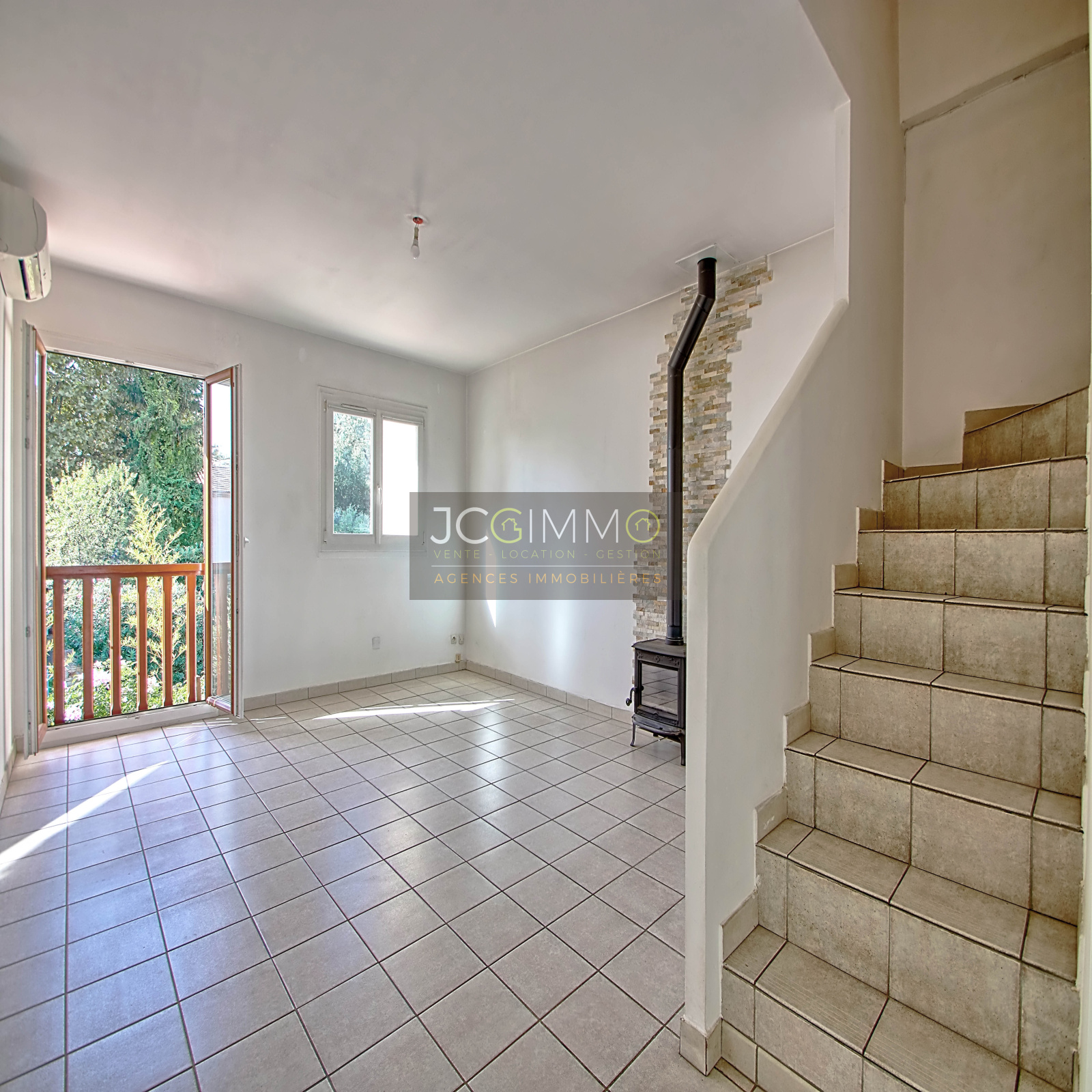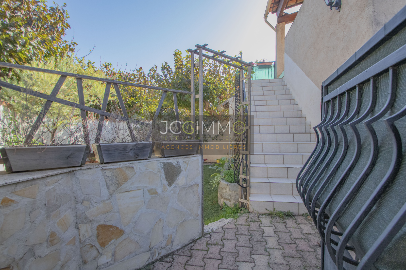 Le terrain est clos par portillon qui s'ouvre sur le jardin privé de 20 m² pouvant accueillir une piscine hors sol local à vélos (4m² env), le large escalier extérieur vous donne accès à la grande terrasse couverte et au haut de villa duplex.