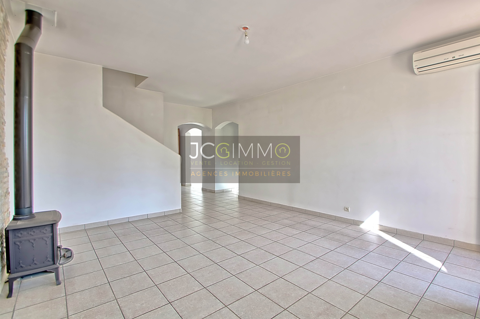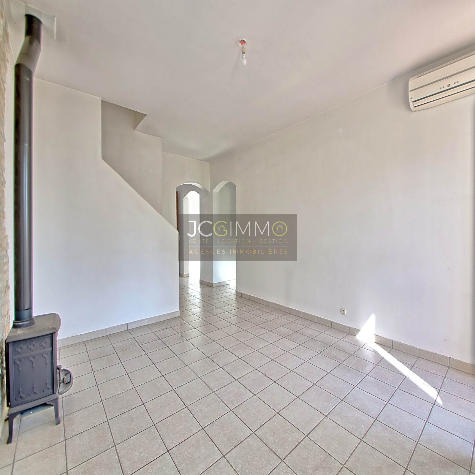 PRESTATIONS : Fenêtres/porte fenêtre PVC double vitrage, chauffage par climatisation réversible et poêle à bois, Cuisine aménagée et équipée (four, plaques, hotte), salle de bains et salle de douches aménagées, sols carrelés haut et bas.