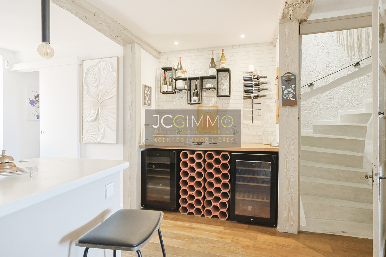 PRESTATIONS : Double vitrage PVC, volets roulants électriques (terrasse), store-banne électrique (terrasse), climatisation réversible (salon/salle à manger/cuisine), radiateurs électriques connectés (chambres), parquet en chêne massif (1er étage), parquet stratifié (2ème étage), béton ciré (escalier 1er/2ème étage), massif eau de ville, assainissement tout à l’égout, fibre internet.