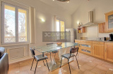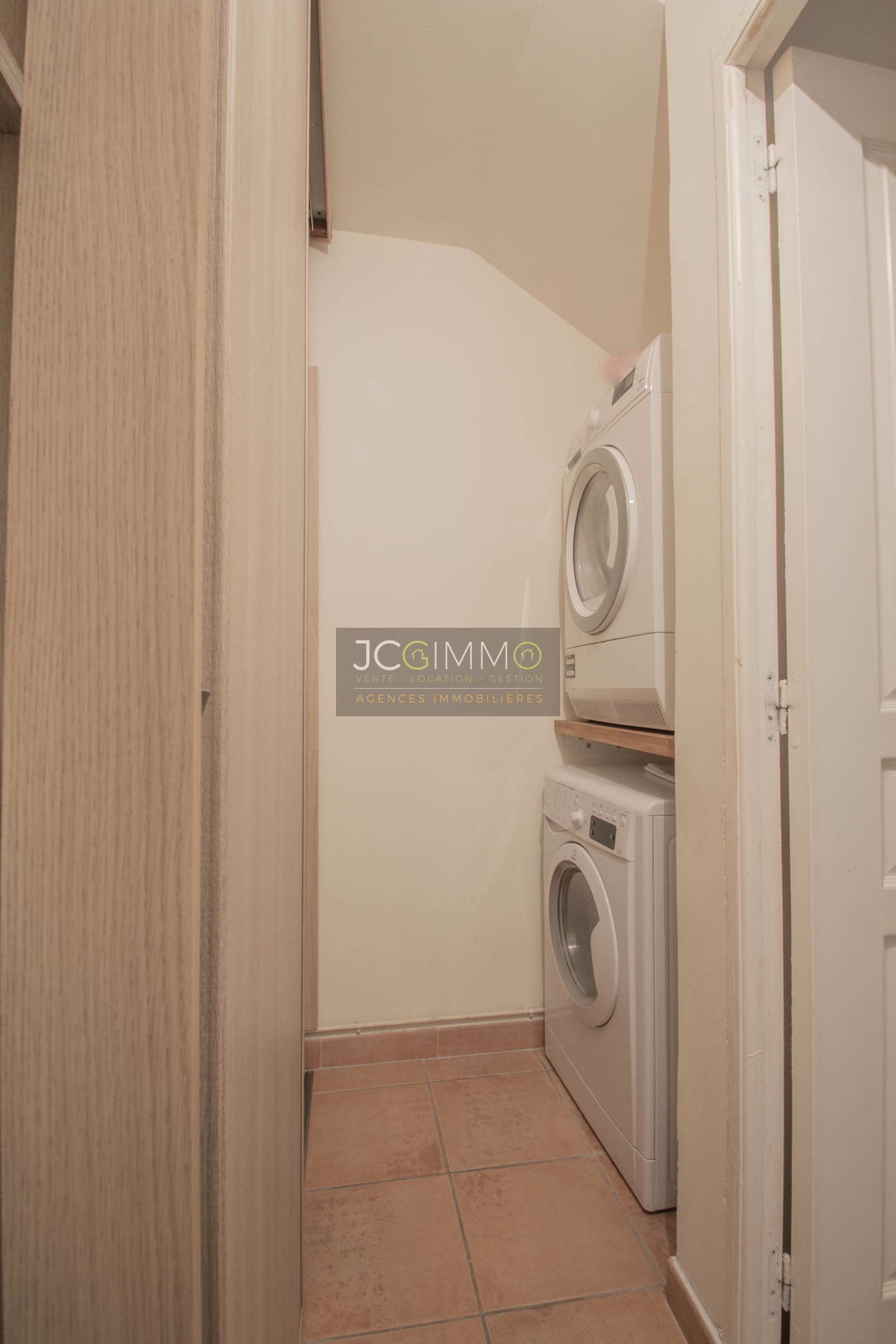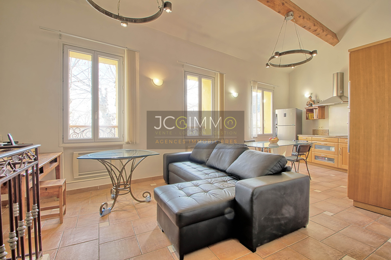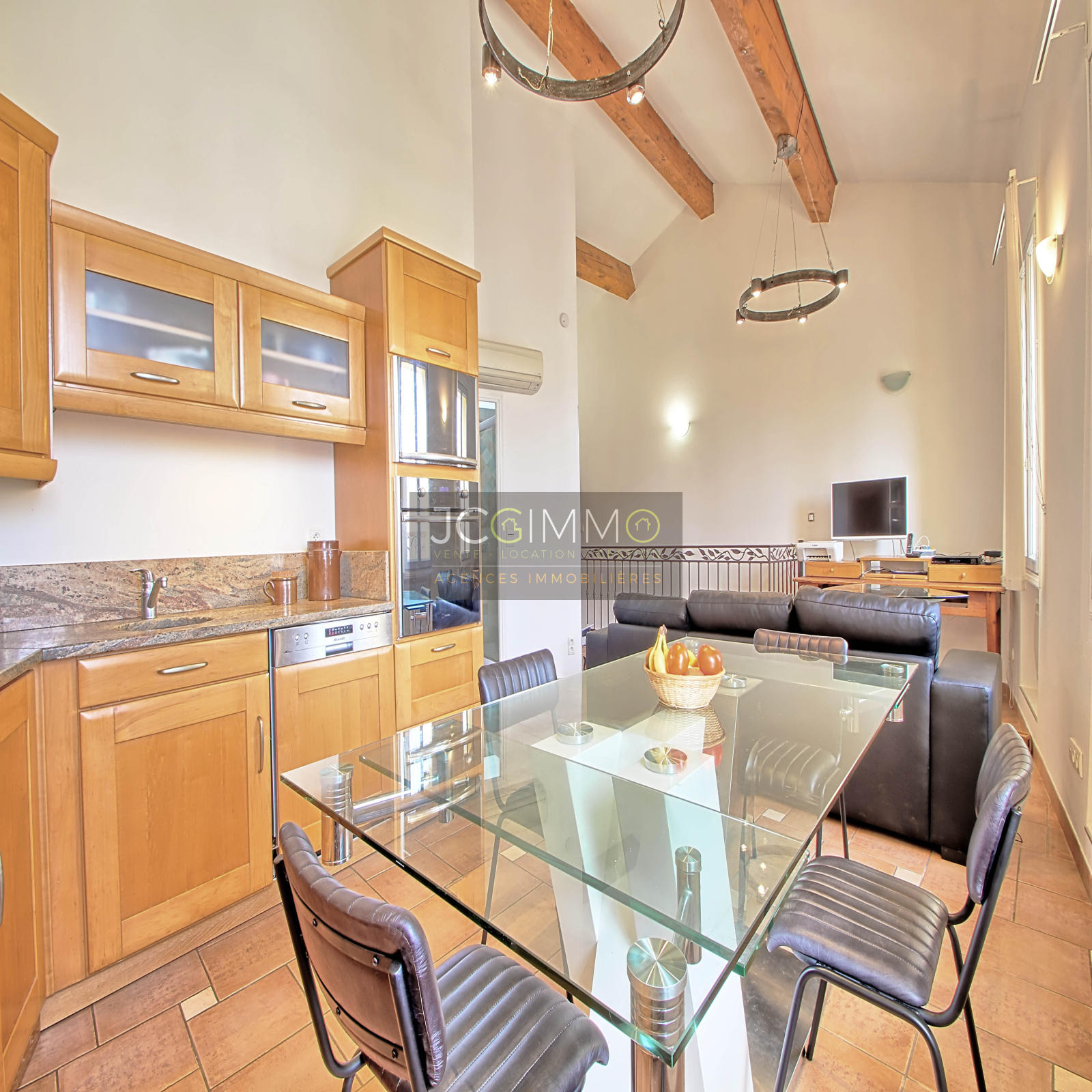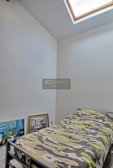 À l’étage grand salon/salle à manger de 30 m² avec cuisine intégrée entièrement équipée, 1 chambre avec placard et 1 Salle de douches avec WC intégré.