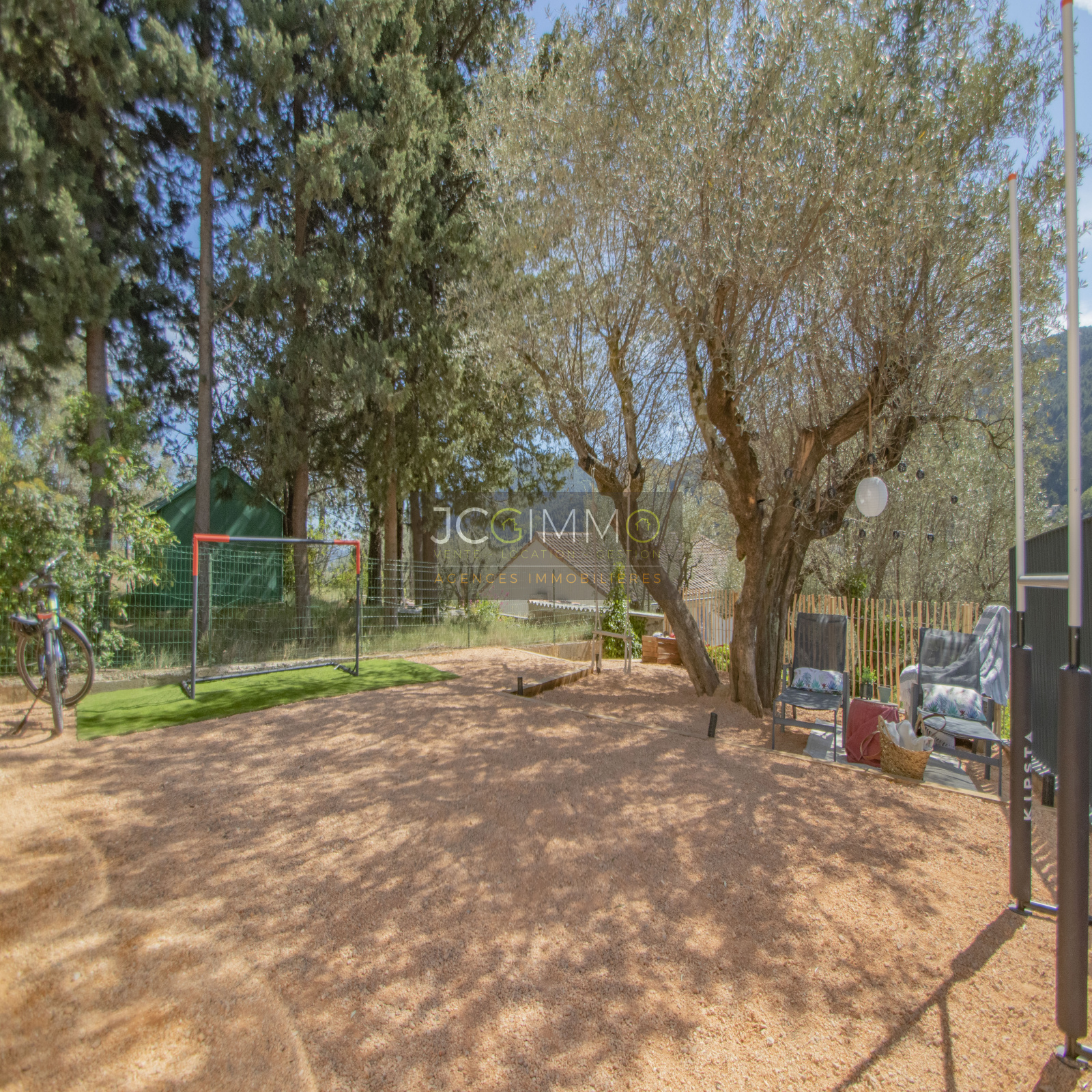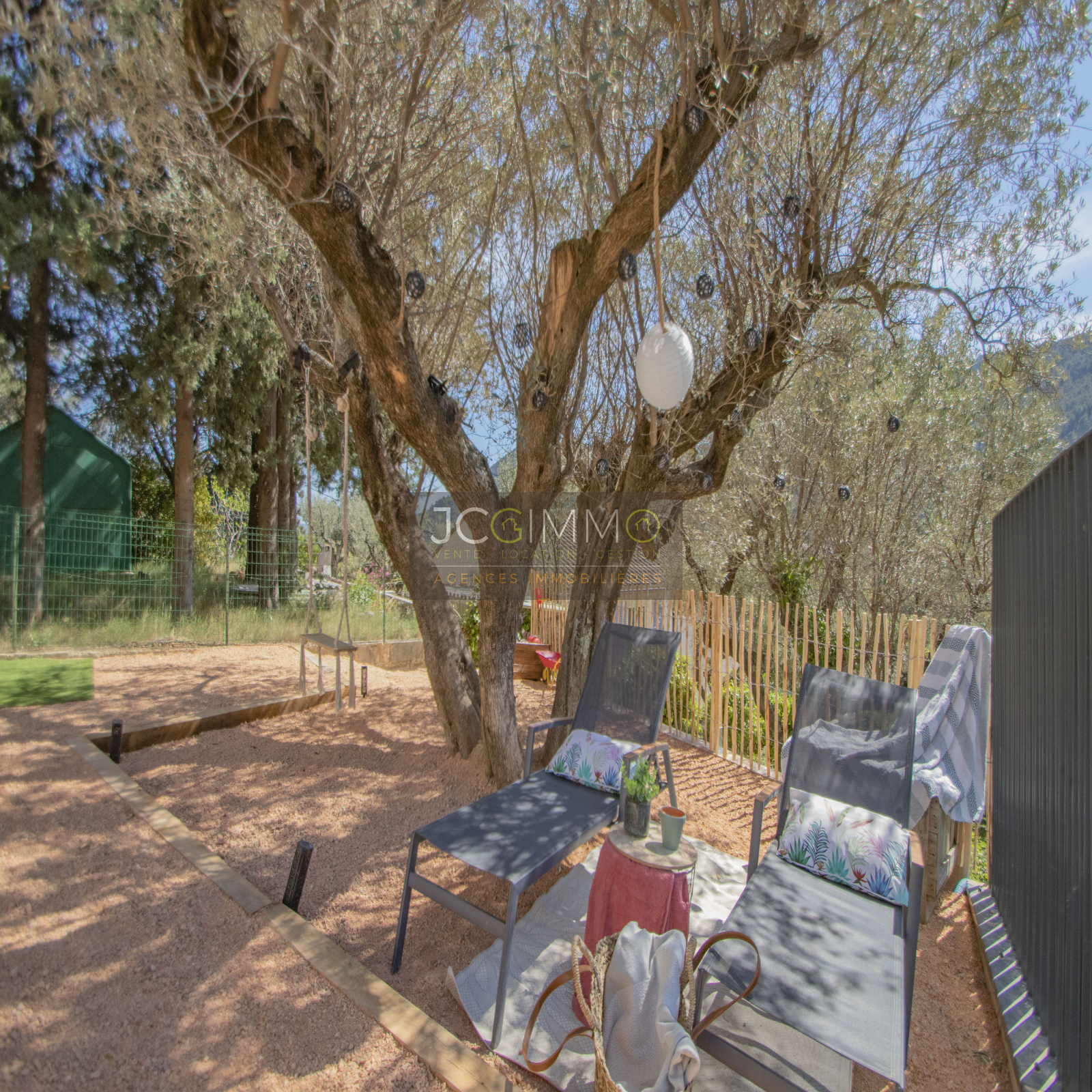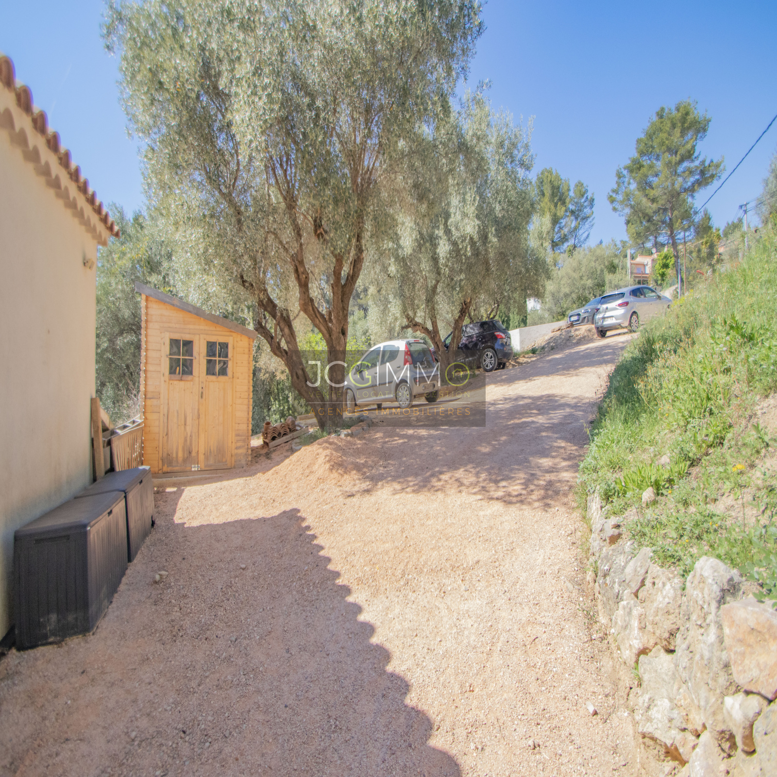 A l'extérieur : Un espace de vie extérieur avec une grande terrasse et un superbe jardin baigné par le soleil et agrémenté d'un très bel olivier pour vous garantir une ombre tant recherchée durant les belles journées d'été. A l’avant de la villa vous trouverez un petit cabanon de rangement très pratique et un espace ouvert pour garer aisément tous vos véhicules sous de superbes oliviers.