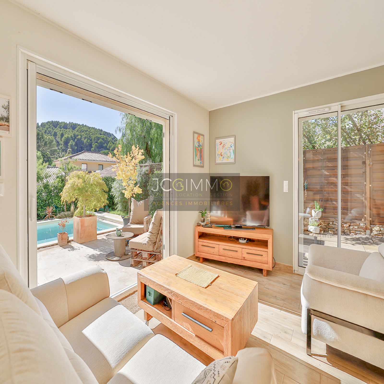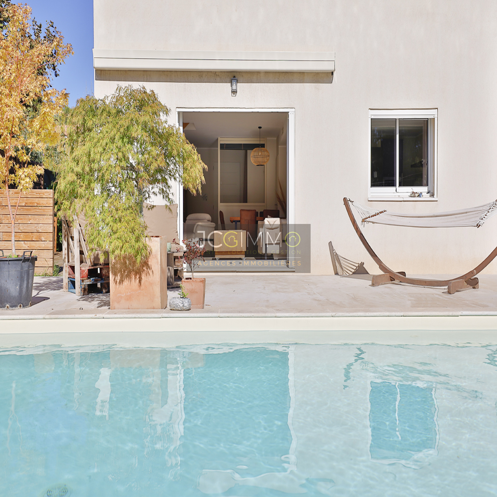La villa est totalement individuelle (on en fait le tour complet), elle totalise 109 m² dont 15m² de garage directement communicant avec la villa + une superbe PISCINE traditionnelle, chauffée par PAC, le tout sur un terrain de 604 m².