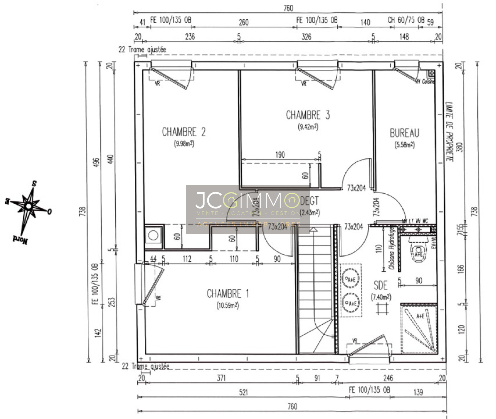 A L'ETAGE : 3 chambres chacune avec placard (9,2m², 9,6m² et 12m²), une salle de douches à l'italienne/WC (7,54m² avec coin buanderie) et un bureau de 5,6m².
