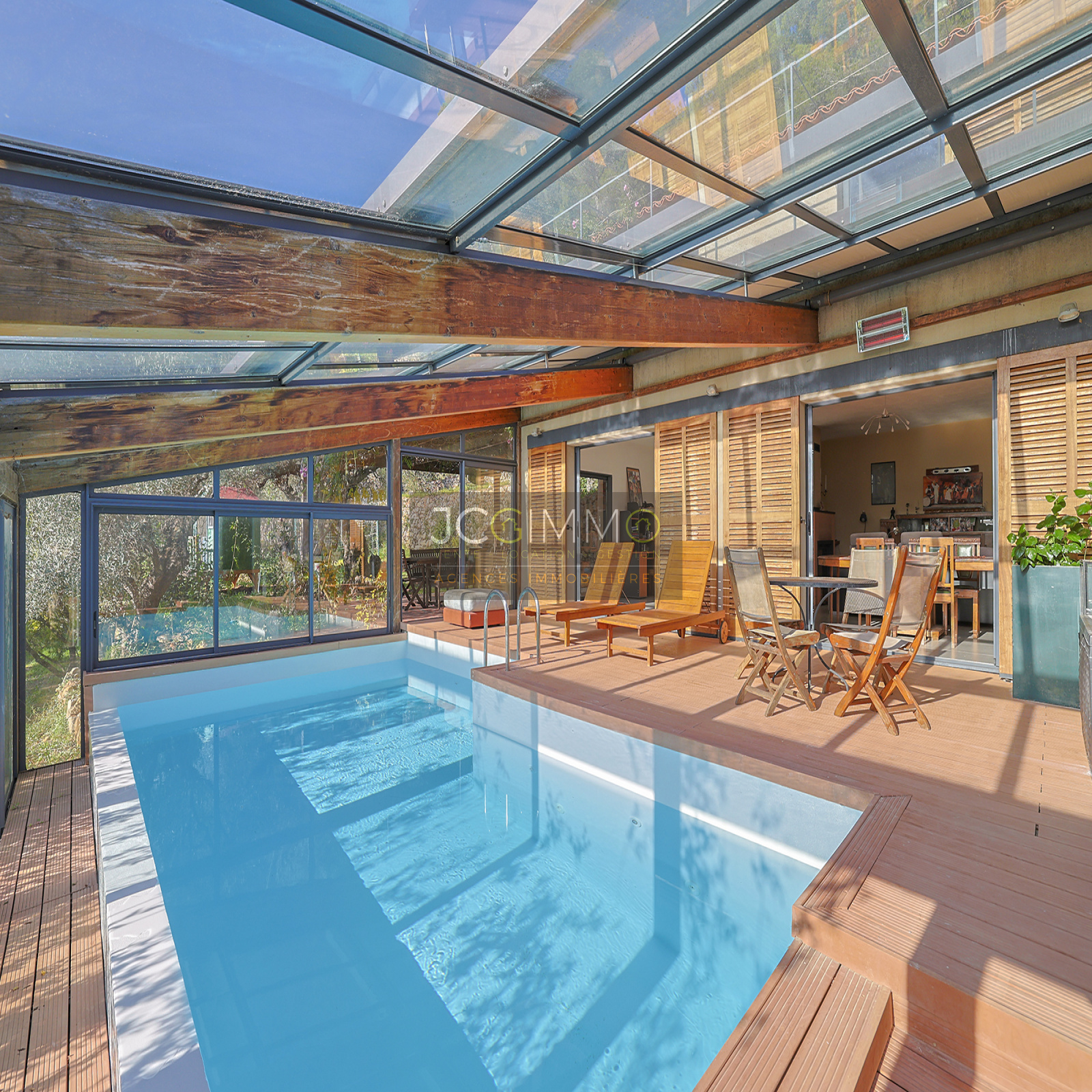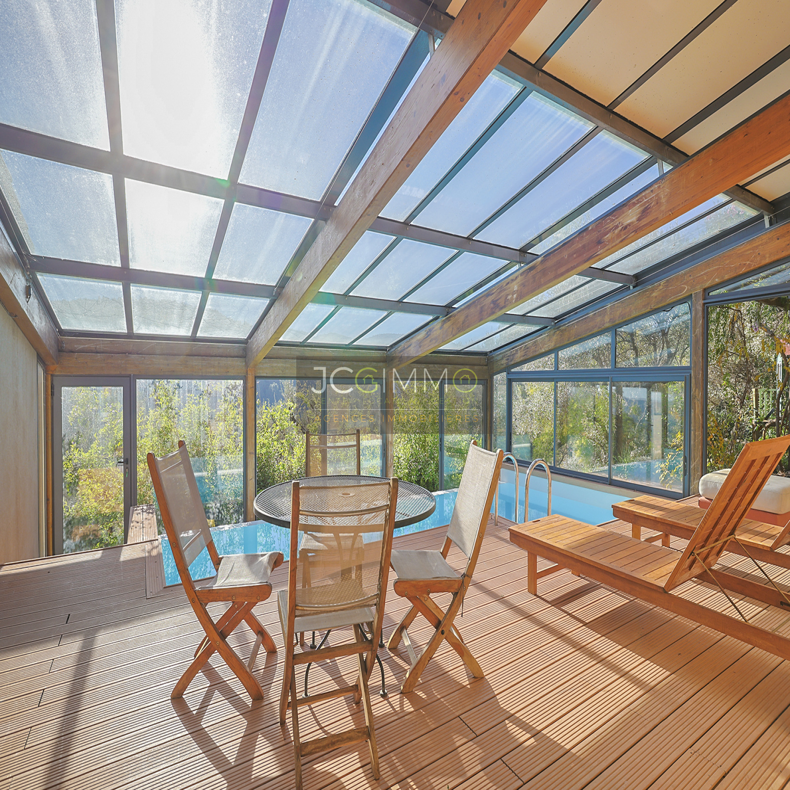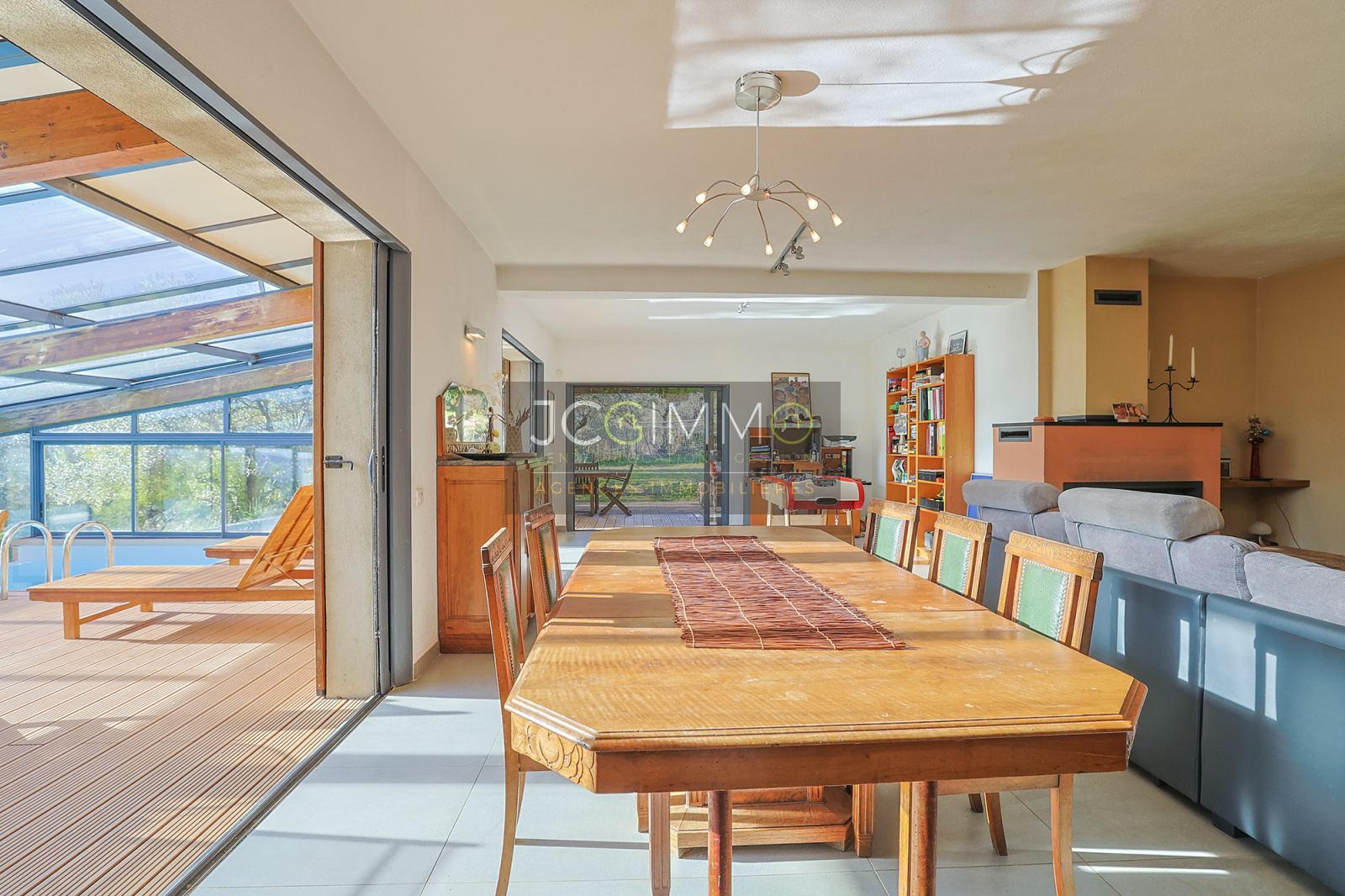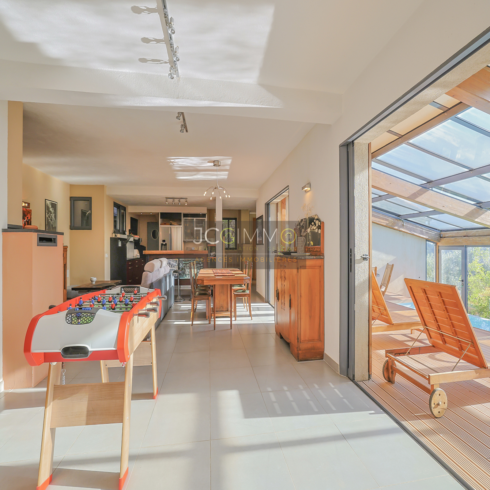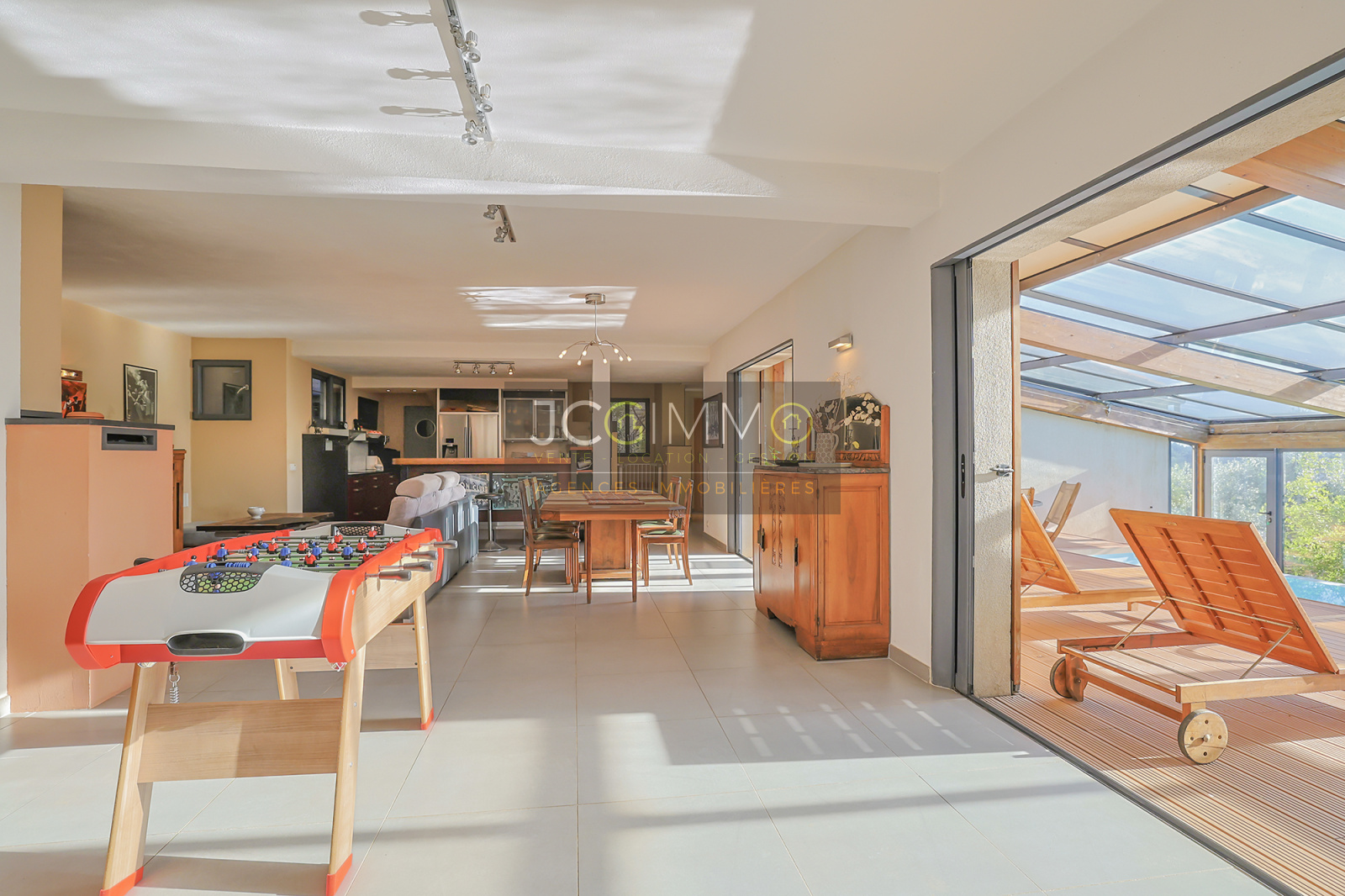 Un SUPERBE ESPACE DE VIE avec cuisine ouverte de 70 m², bordé de grandes baies vitrées TOUTES A GALANDAGE !! ouvrant sur un espace PISCINE TRADITIONNELLE A DEBORDEMENT (7x3,5m) avec terrasse / plage. Le tout couvert par une serre double vitrage adossée à ouverture MOTORISEE qui transforme votre piscine extérieure en piscine intérieur !