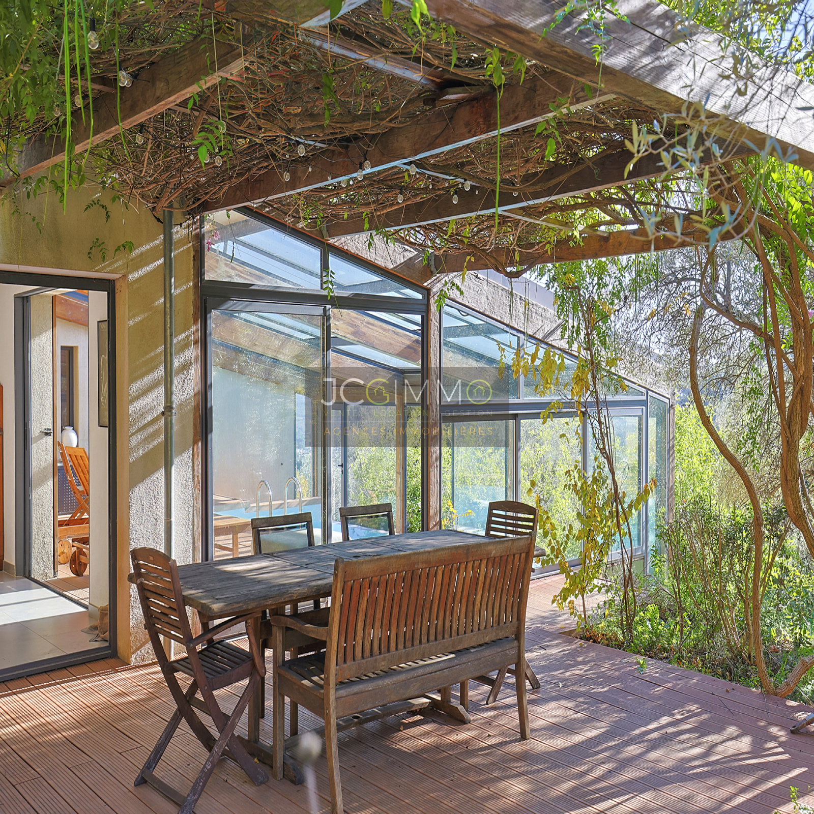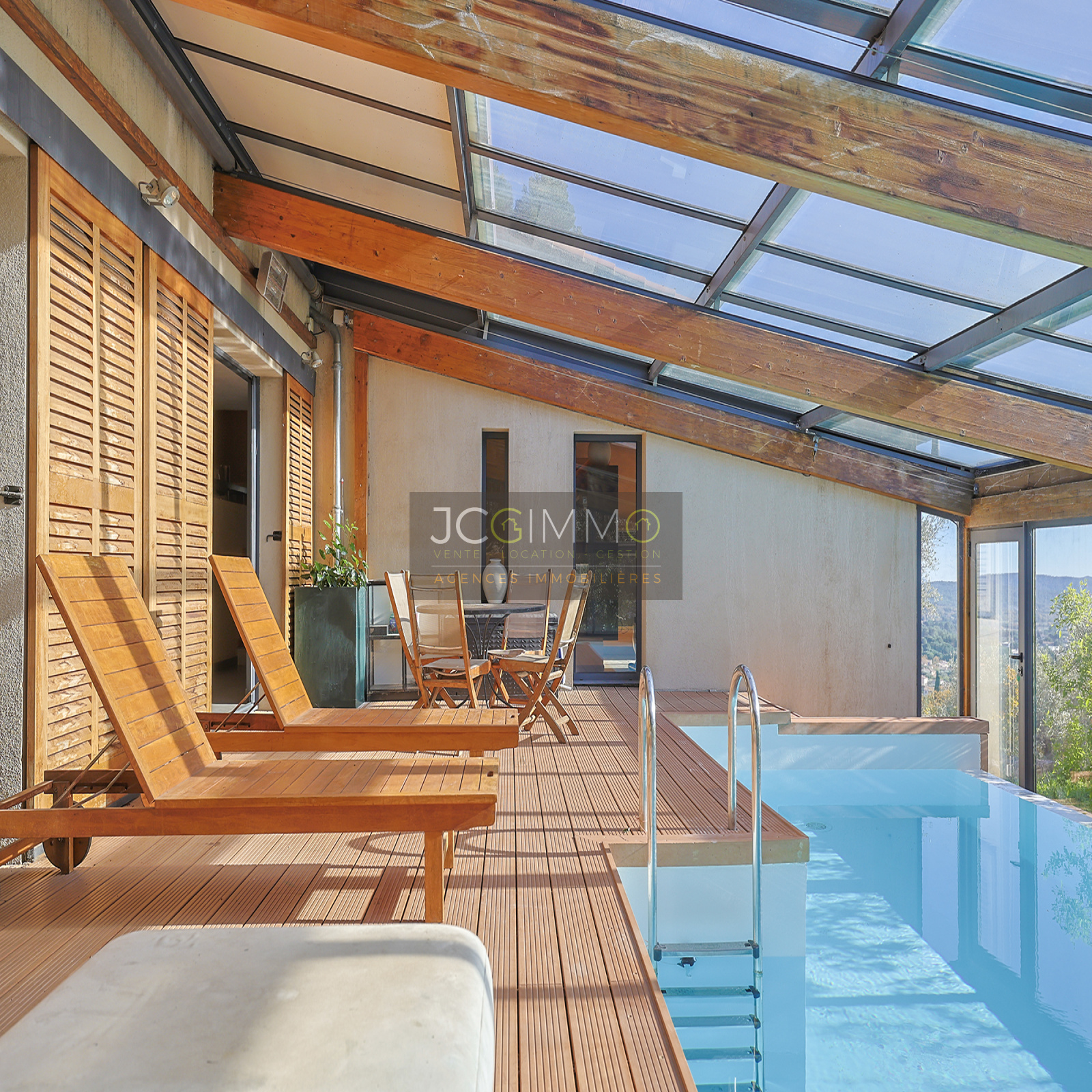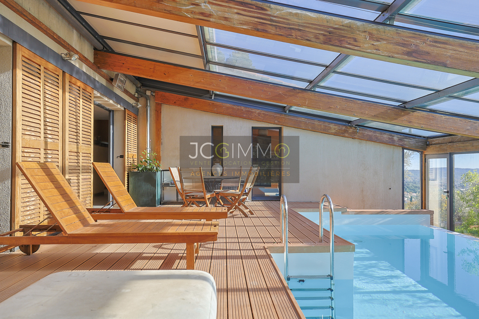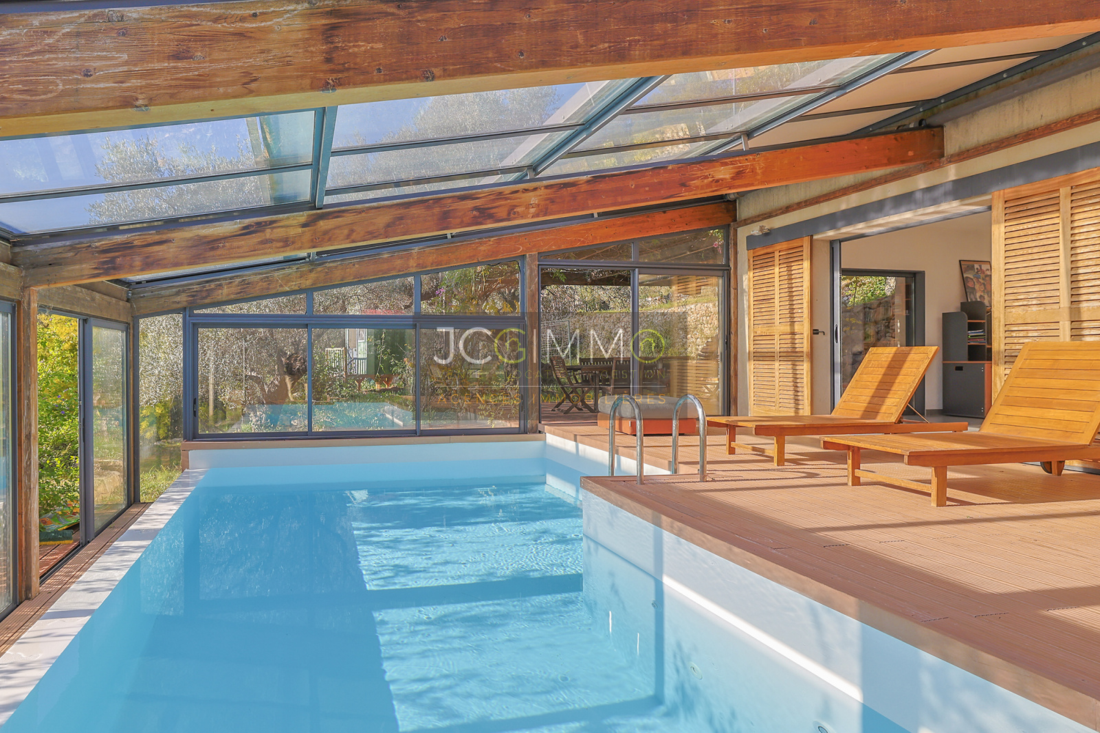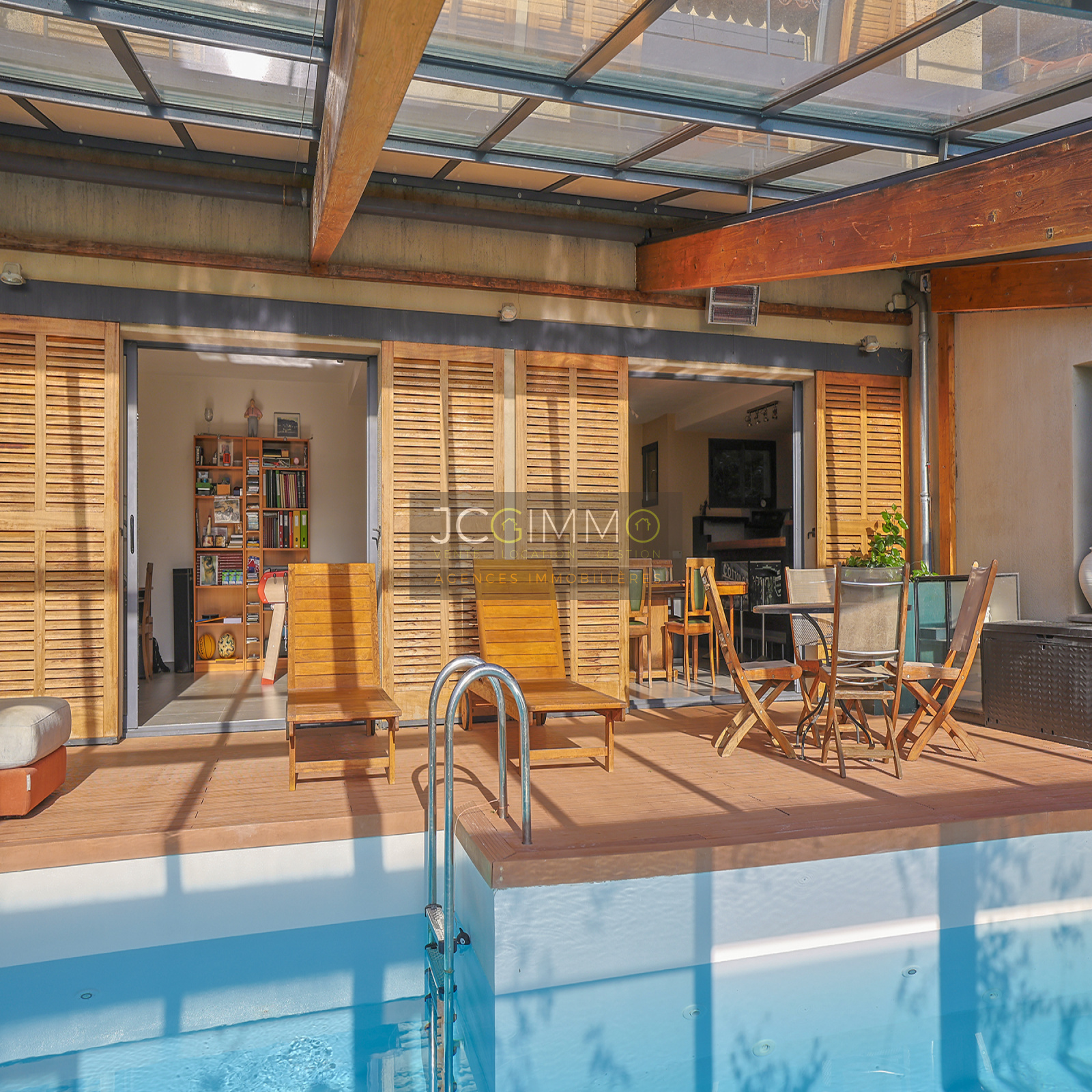 Un SUPERBE ESPACE DE VIE avec cuisine ouverte de 70 m², bordé de grandes baies vitrées TOUTES A GALANDAGE !! ouvrant sur un espace PISCINE TRADITIONNELLE A DEBORDEMENT (7x3,5m) avec terrasse / plage. Le tout couvert par une serre double vitrage adossée à ouverture MOTORISEE qui transforme votre piscine extérieure en piscine intérieur !