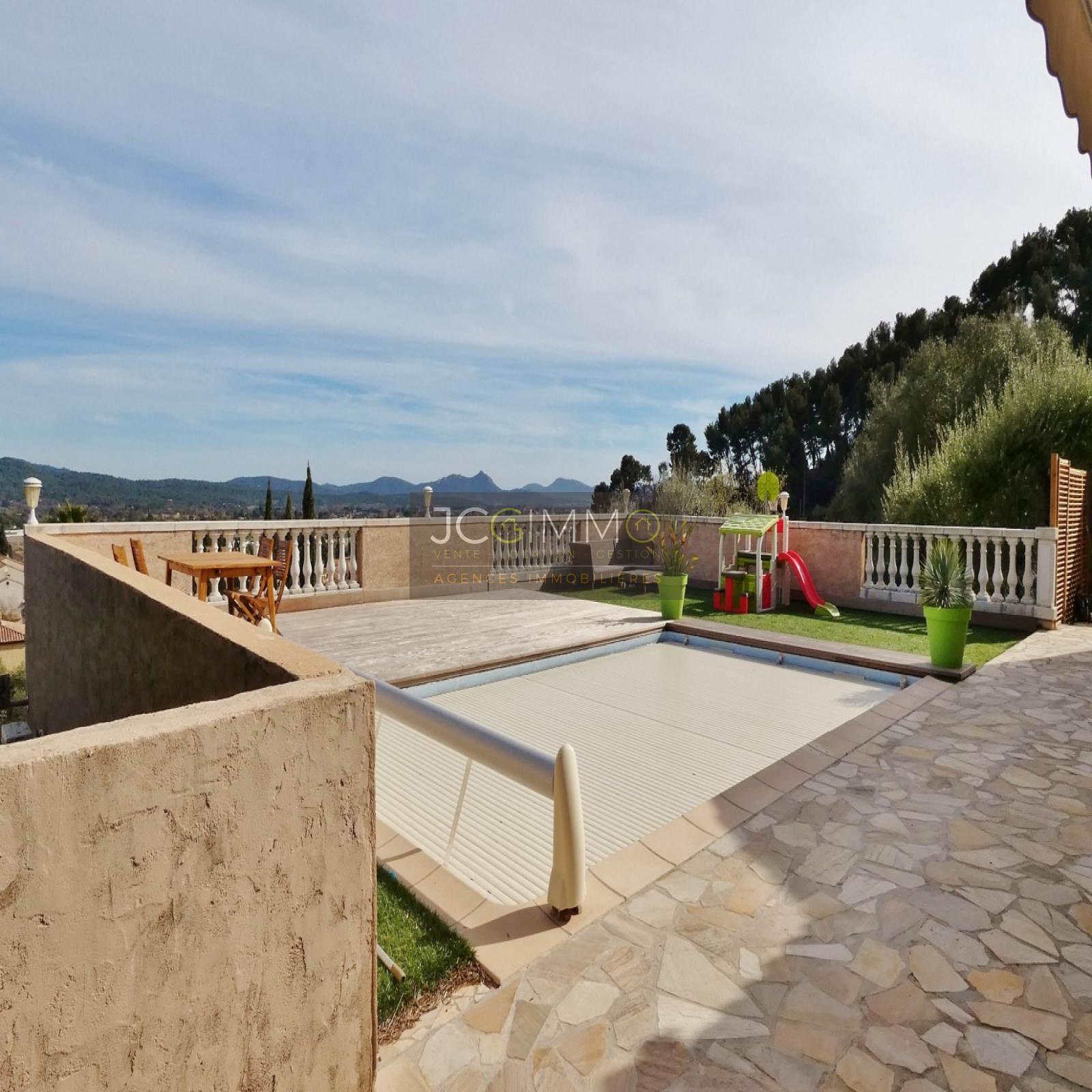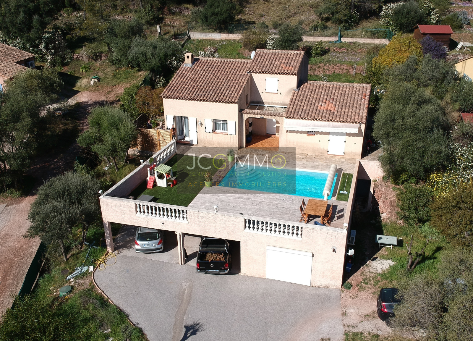 SOLLIES PONT. Au CALME dans un secteur résidentiel très apprécié avec une Vue Dominante IMPRENABLE sur toute la vallée ! Villa Individuelle de 1997 de 130m² + Espace Piscine avec terrasse neuve (IPE), Grand local technique, Garage indépendant aménagé en STUDIO TOUT CONFORT de 17m² + Parking couvert, le tout sur un Terrain de 1347m². La villa comprend au RdC : Entrée, Salon/Salle à manger, Cuisine séparée, 2 Chambres, 1 salle de Bains et 1 WC séparé. A l’Etg, très belle Mezzanine fermée pouvant très facilement devenir une 4ème chambre et 1 Suite Parentale avec Salle de Douches/ WC intégré. Belles prestations et Excellent état général. Proche de toutes les commodités. RARE à la Vente !!