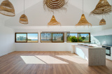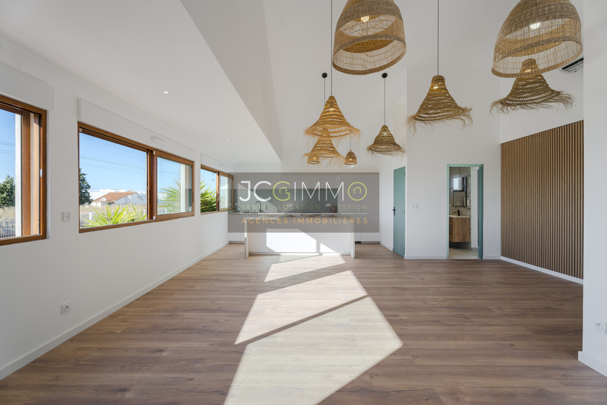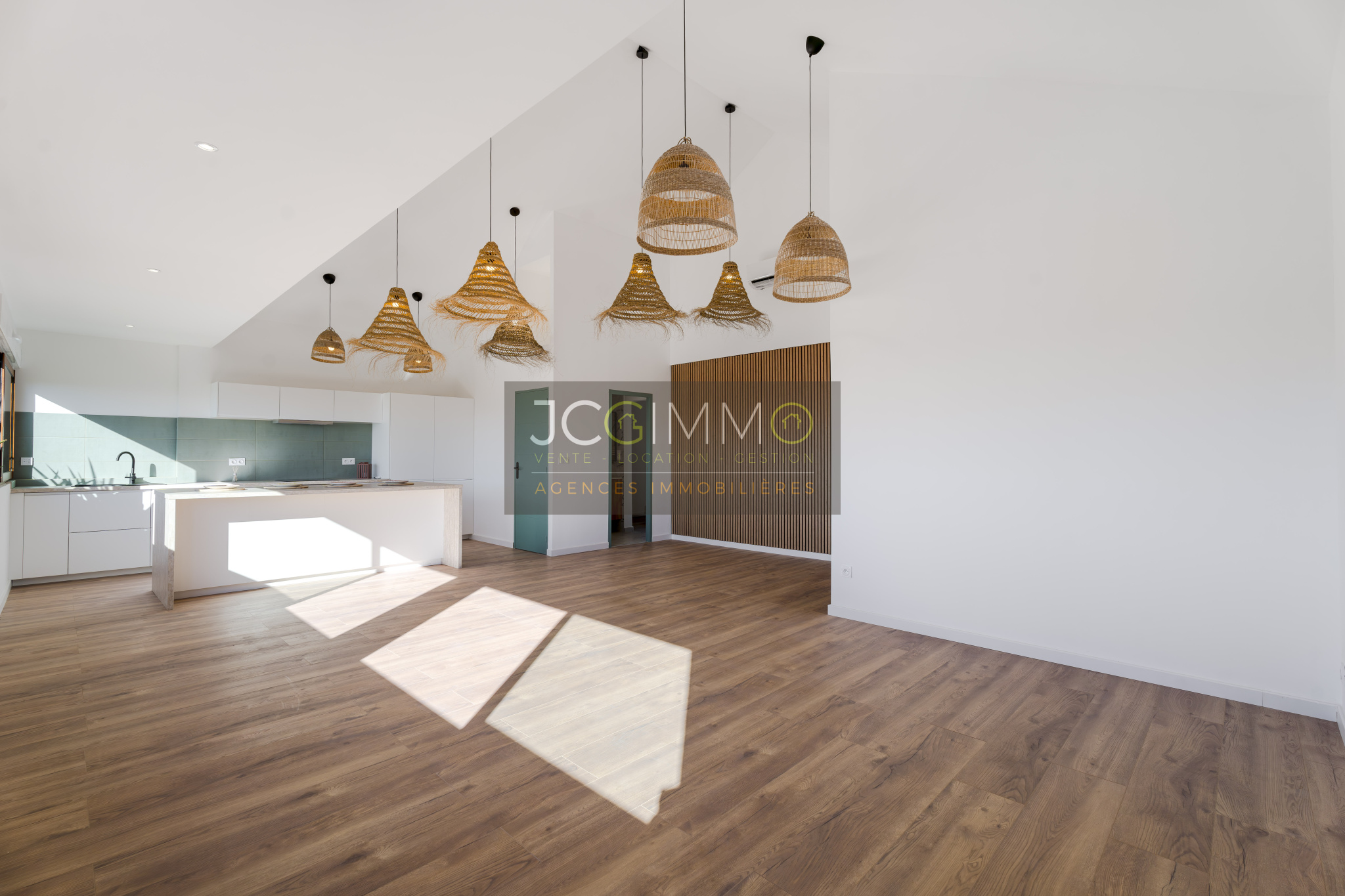 L’entrée dessert une vaste pièce de vie d’environ 56 m², mise en valeur par une belle hauteur sous plafond. Cet espace comprend un séjour lumineux ouvert sur une cuisine contemporaine entièrement équipée avec îlot central, pensée pour allier esthétisme et convivialité.