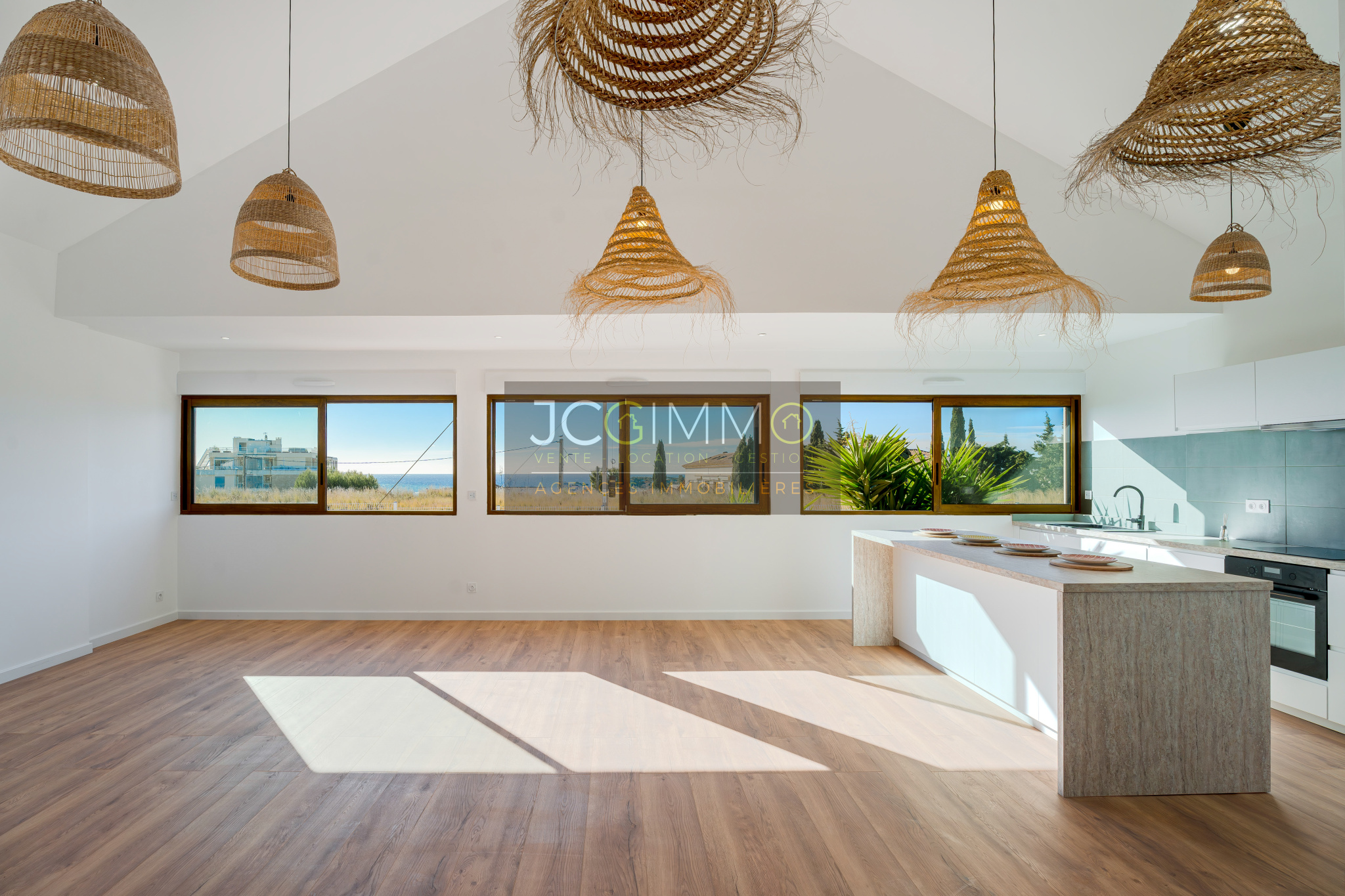 Nous avons particulièrement apprécié les volumes généreux de la pièce de vie, la luminosité offerte par l’exposition sud avec vue mer, la rénovation intégrale réalisée avec soin, le dernier étage au calme ainsi que l’absence totale de charges, élément devenu particulièrement recherché sur le marché local.