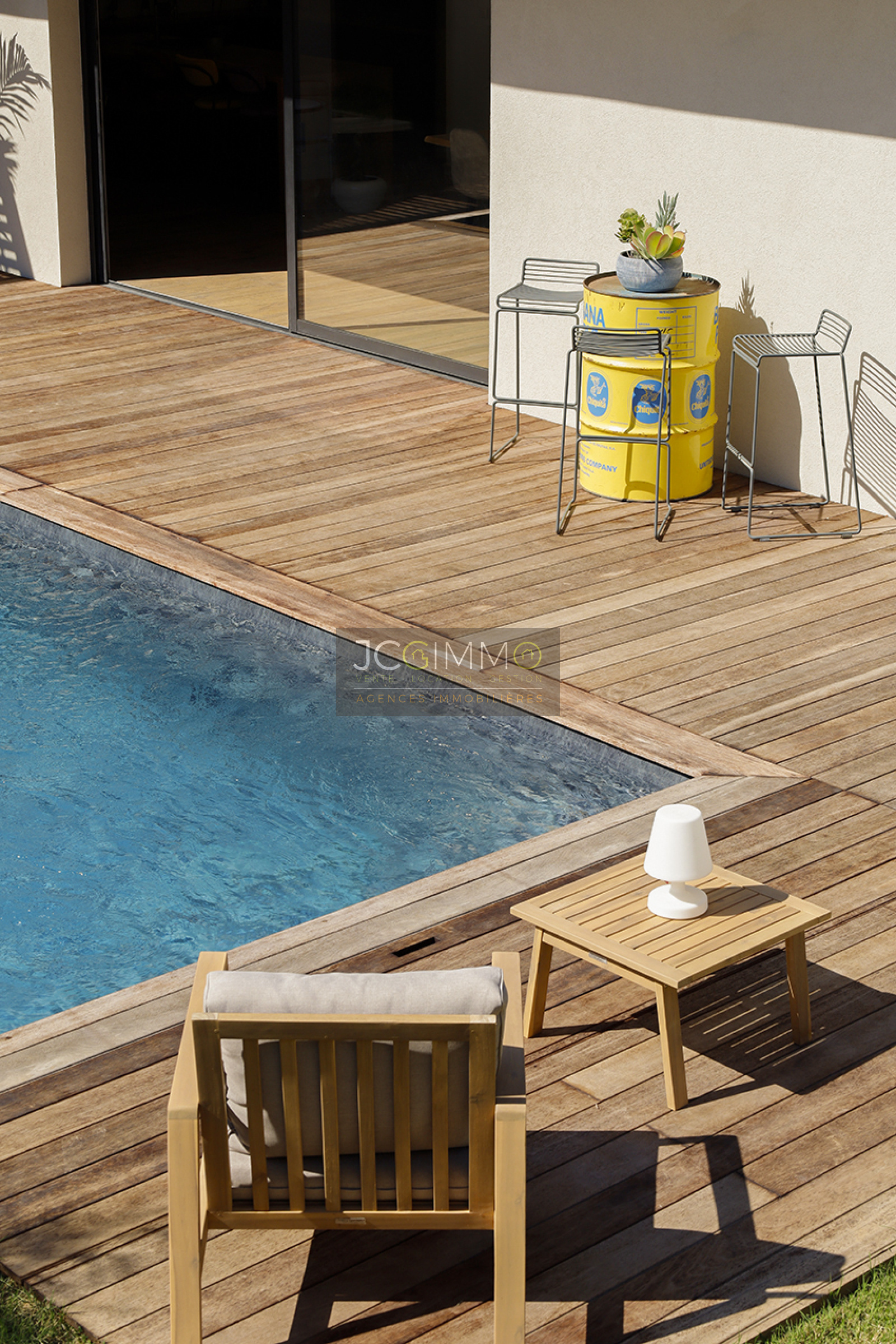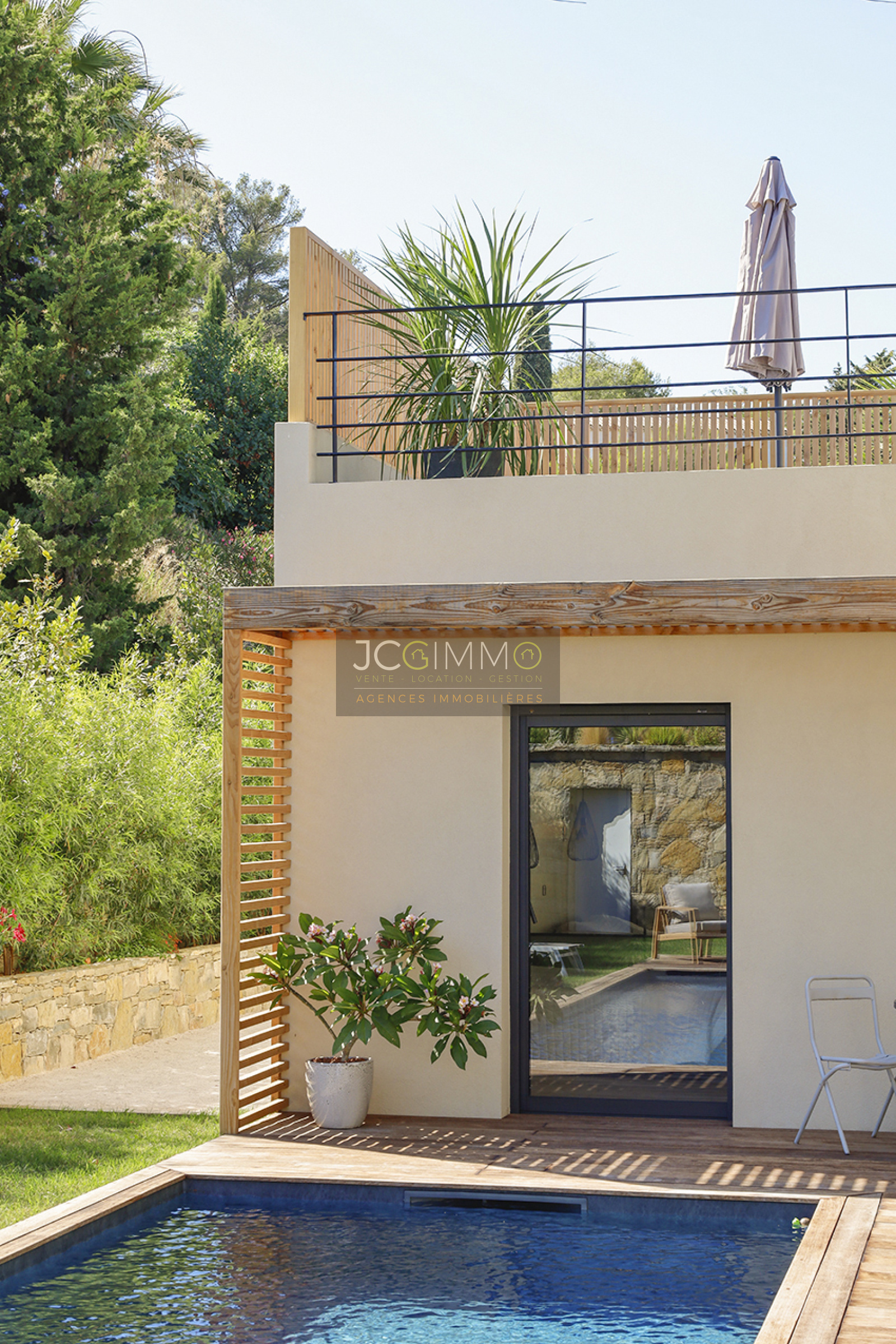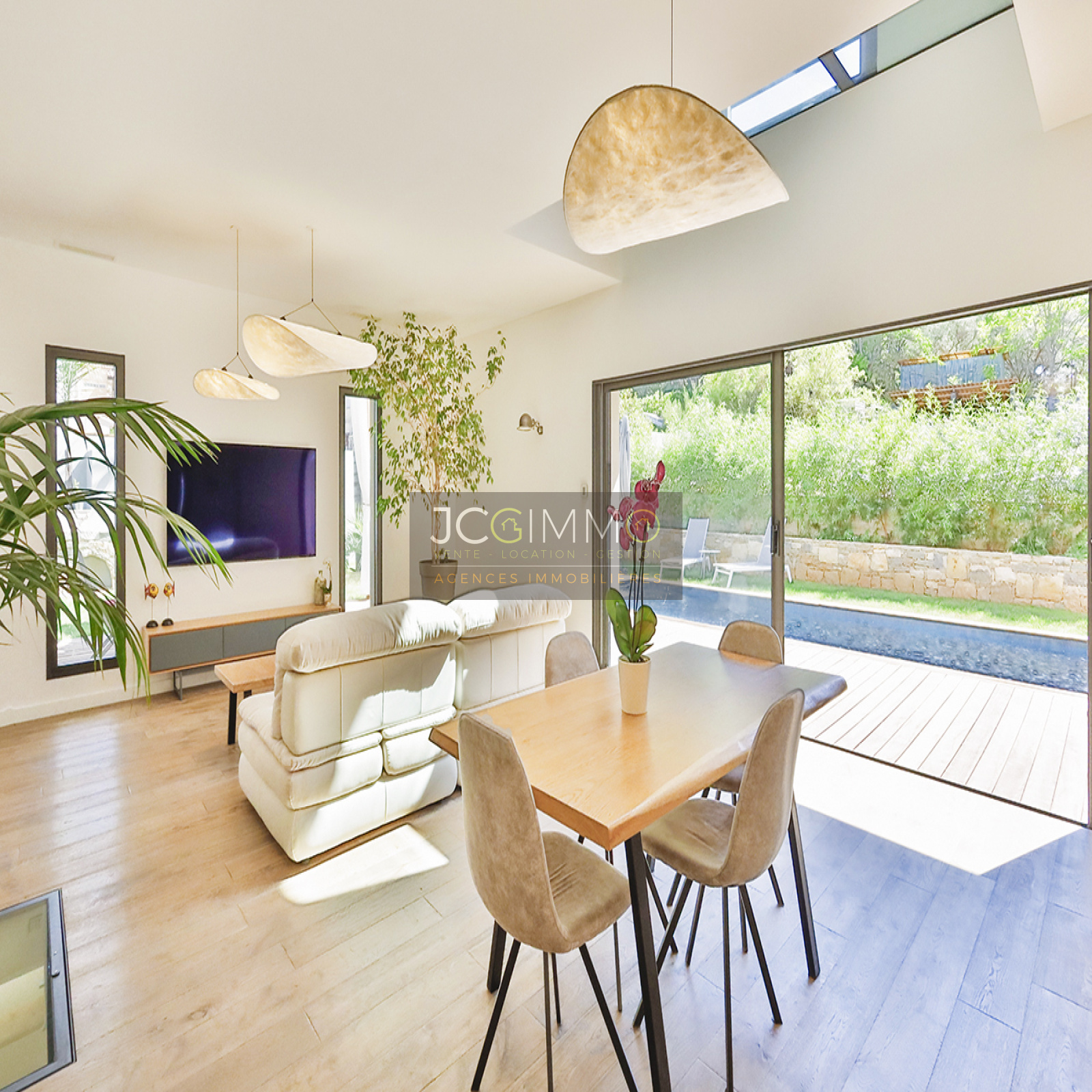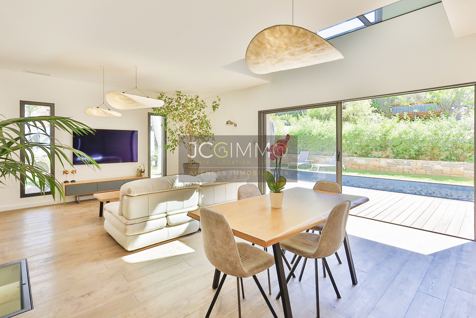 Cet espace possède deux grandes baies vitrées à galandage avec vue sur la piscine renforçant l’impression qu’ intérieur et extérieur ne font qu'un. Une perspective agrandissant encore l’espace.