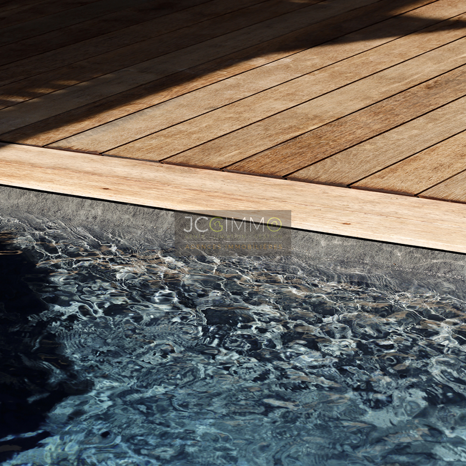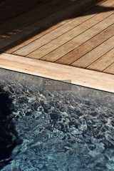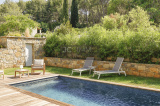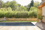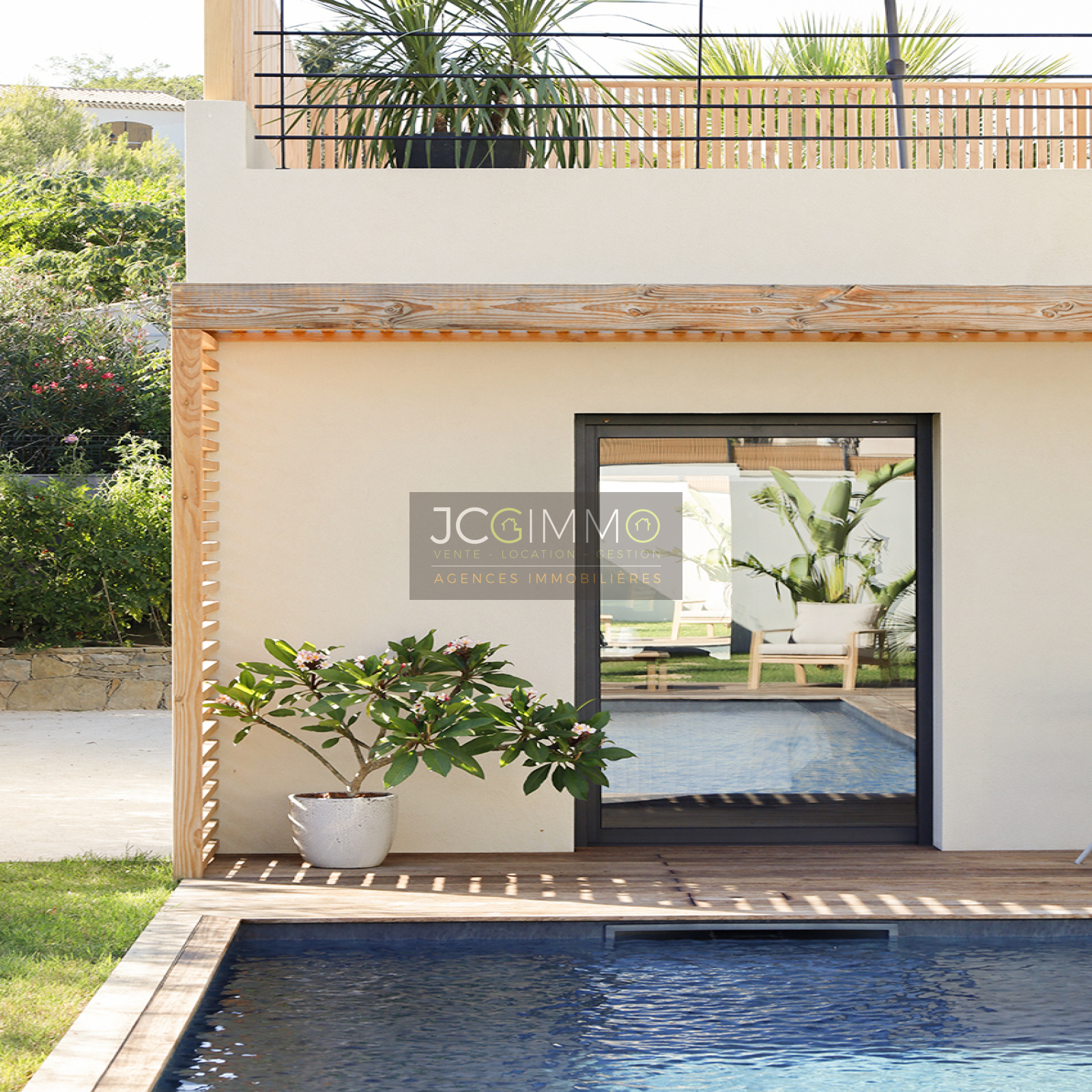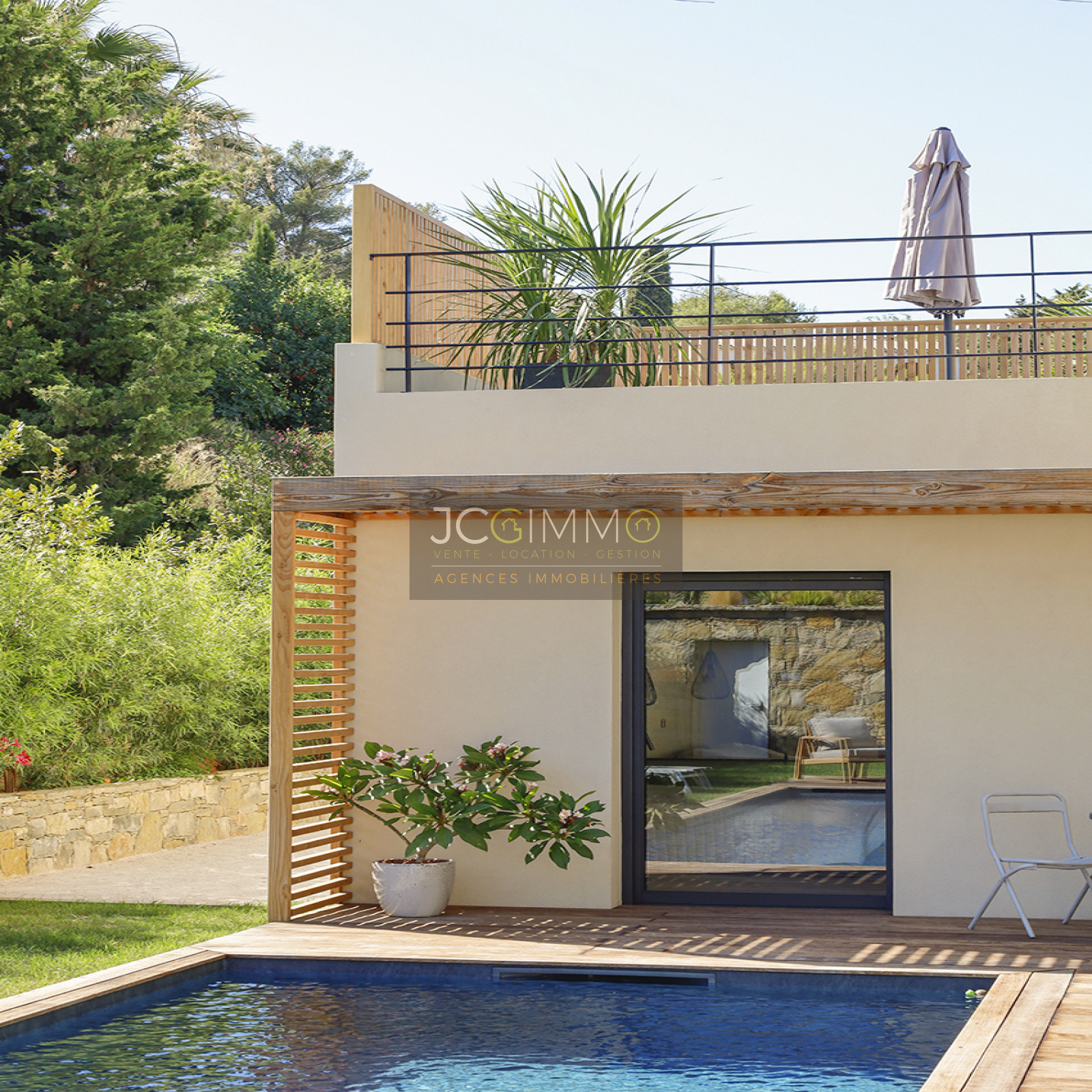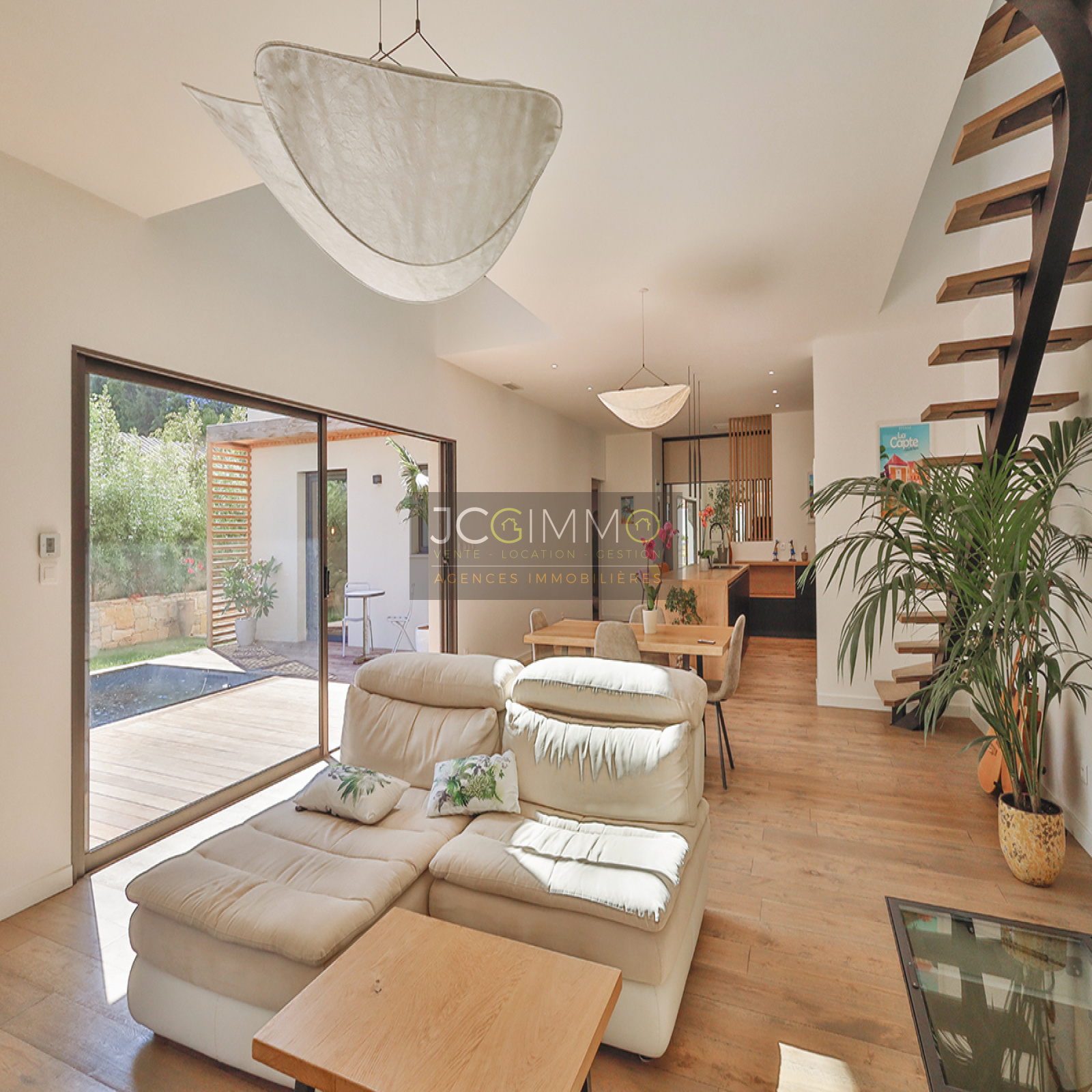Cet espace possède deux grandes baies vitrées à galandage avec vue sur la piscine renforçant l’impression qu’ intérieur et extérieur ne font qu'un. Une perspective agrandissant encore l’espace.