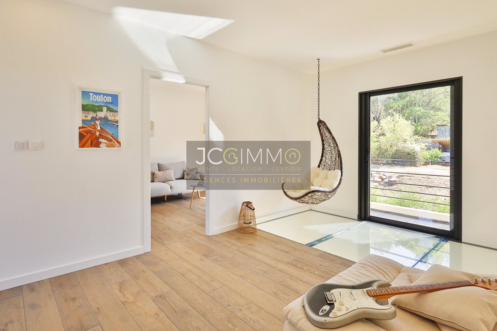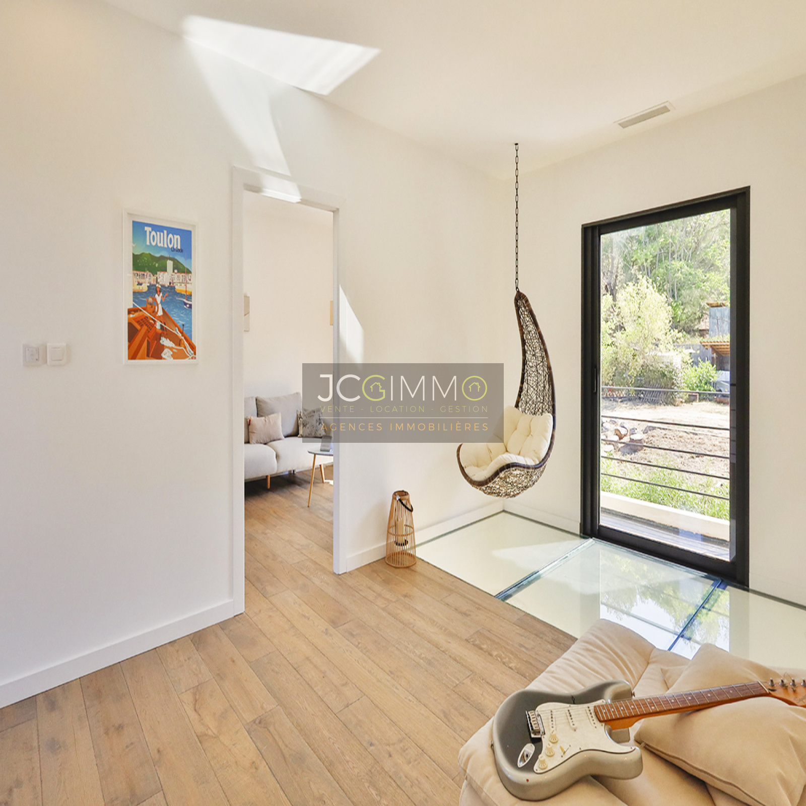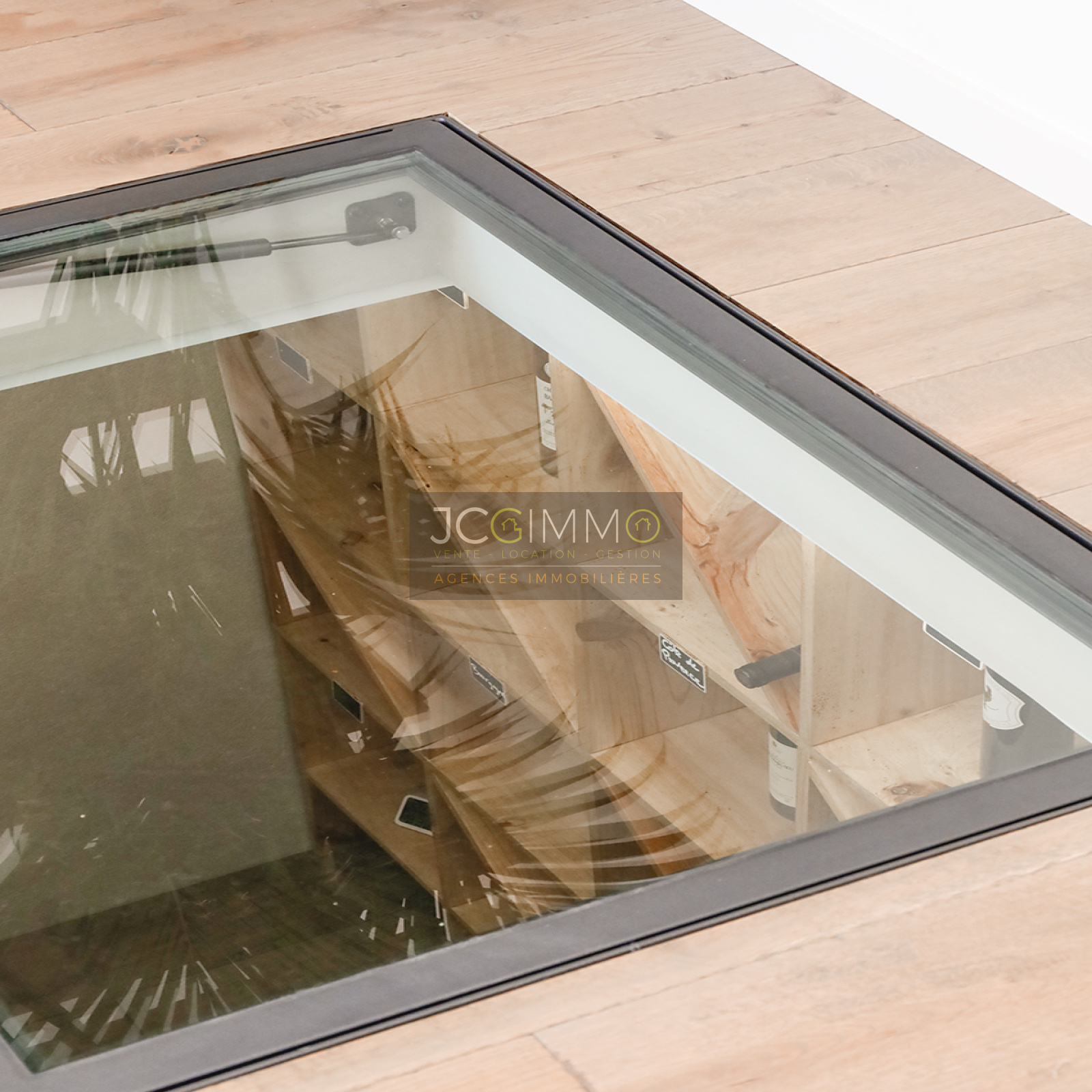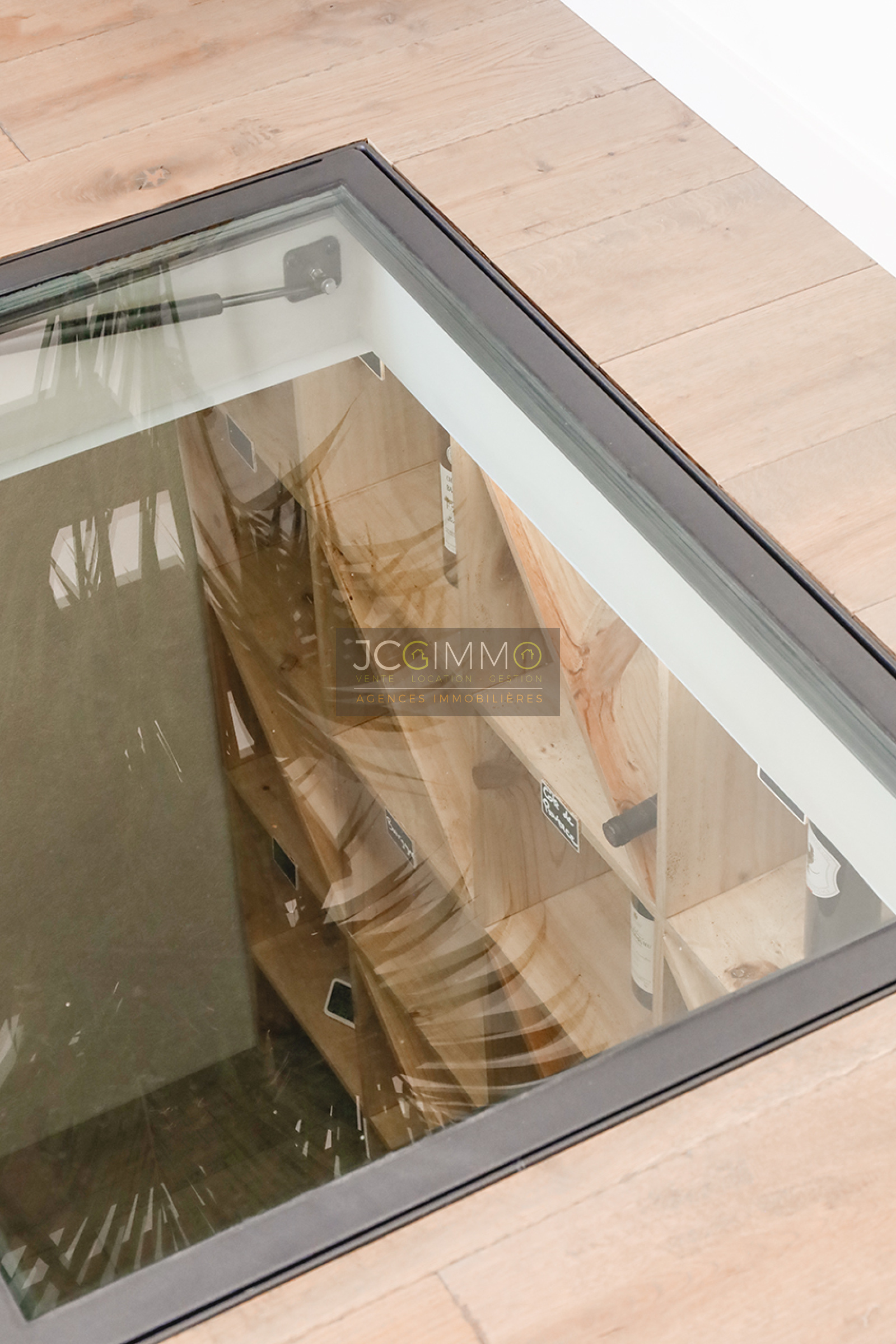 Dans le séjour, vous aurez la belle surprise de découvrir sous vos pieds, une magnifique cave à vin visible grâce à son ouverture en verre trempé.
