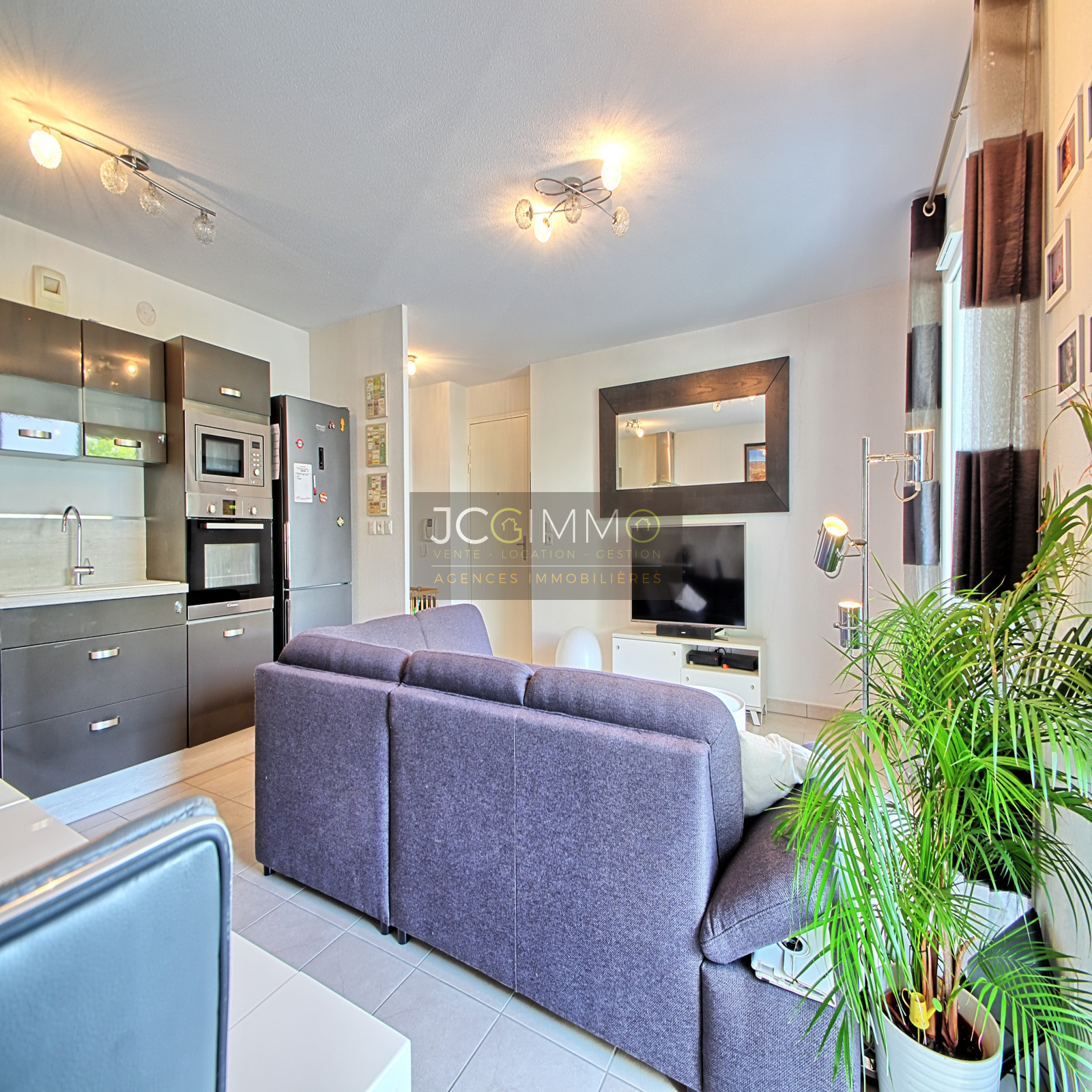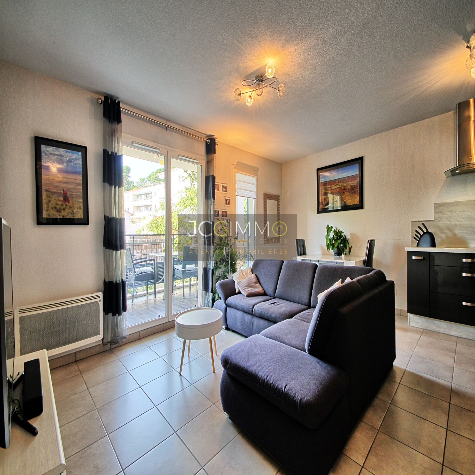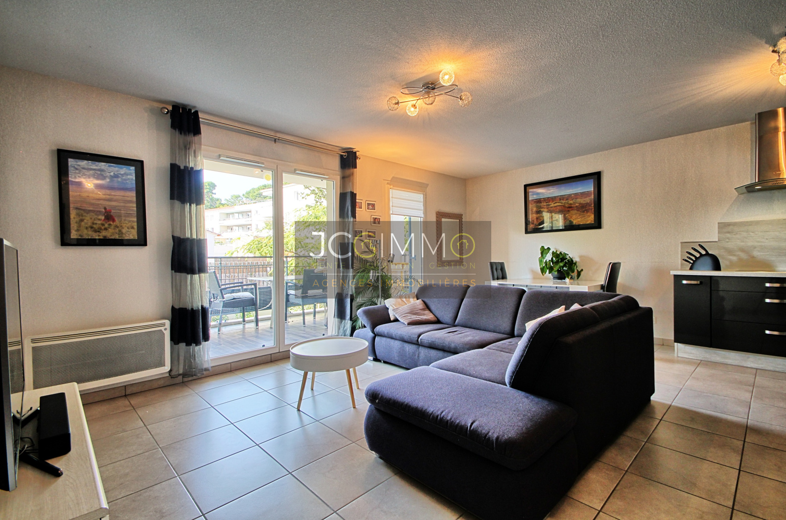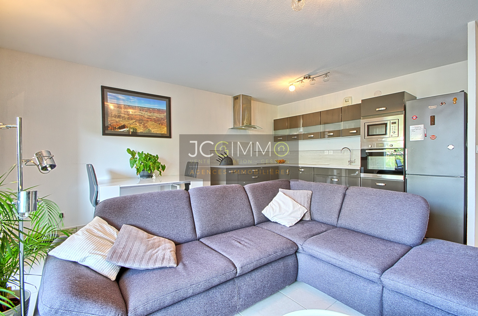 Salon avec cuisine US équipée et grande terrasse, 2 chambres, SDB, WC indépendant, et deux places de parking privé dont une en sous sol . Très belles prestations.