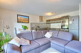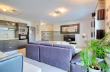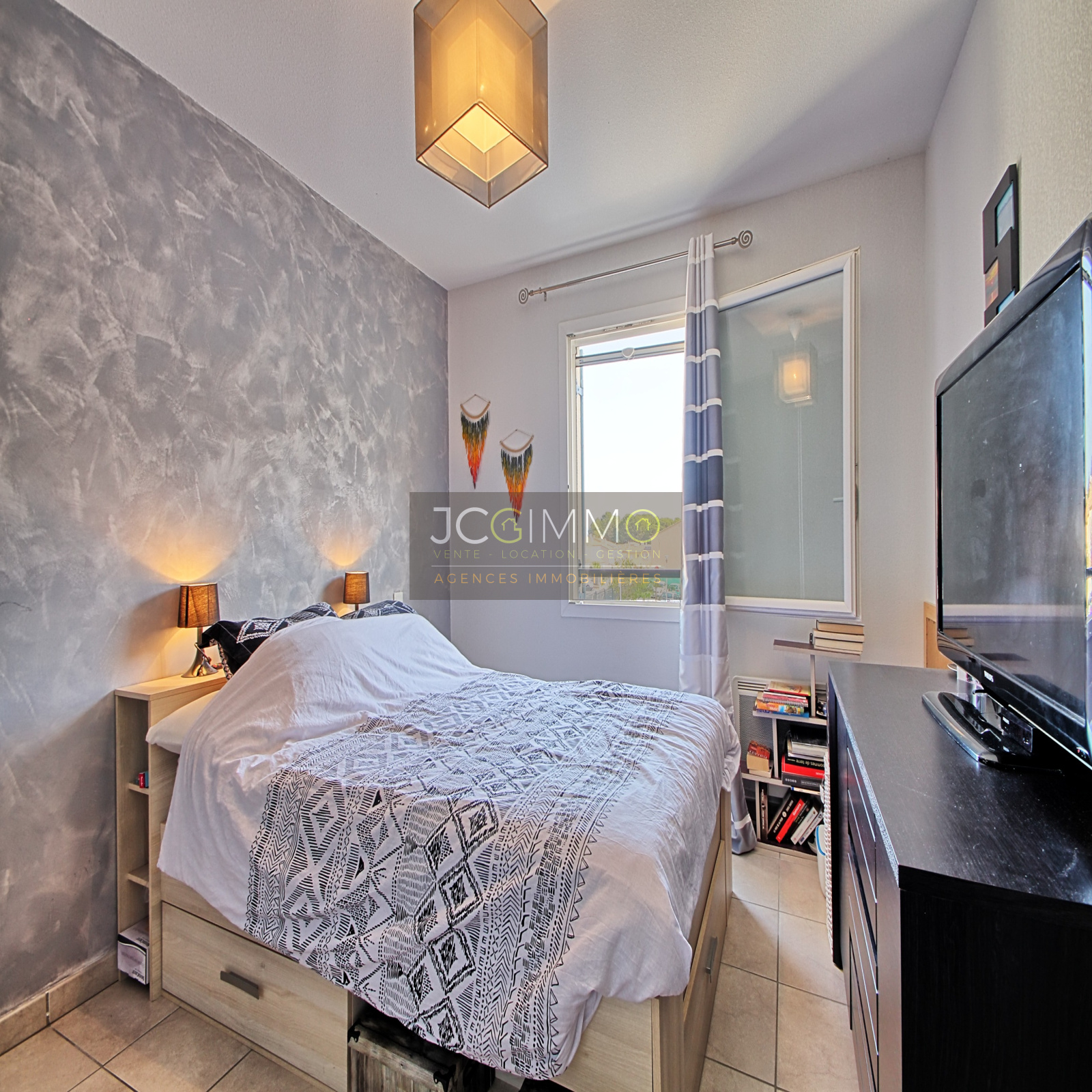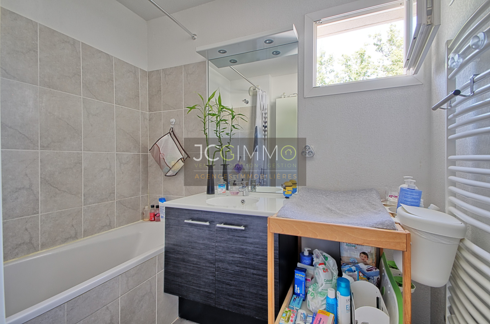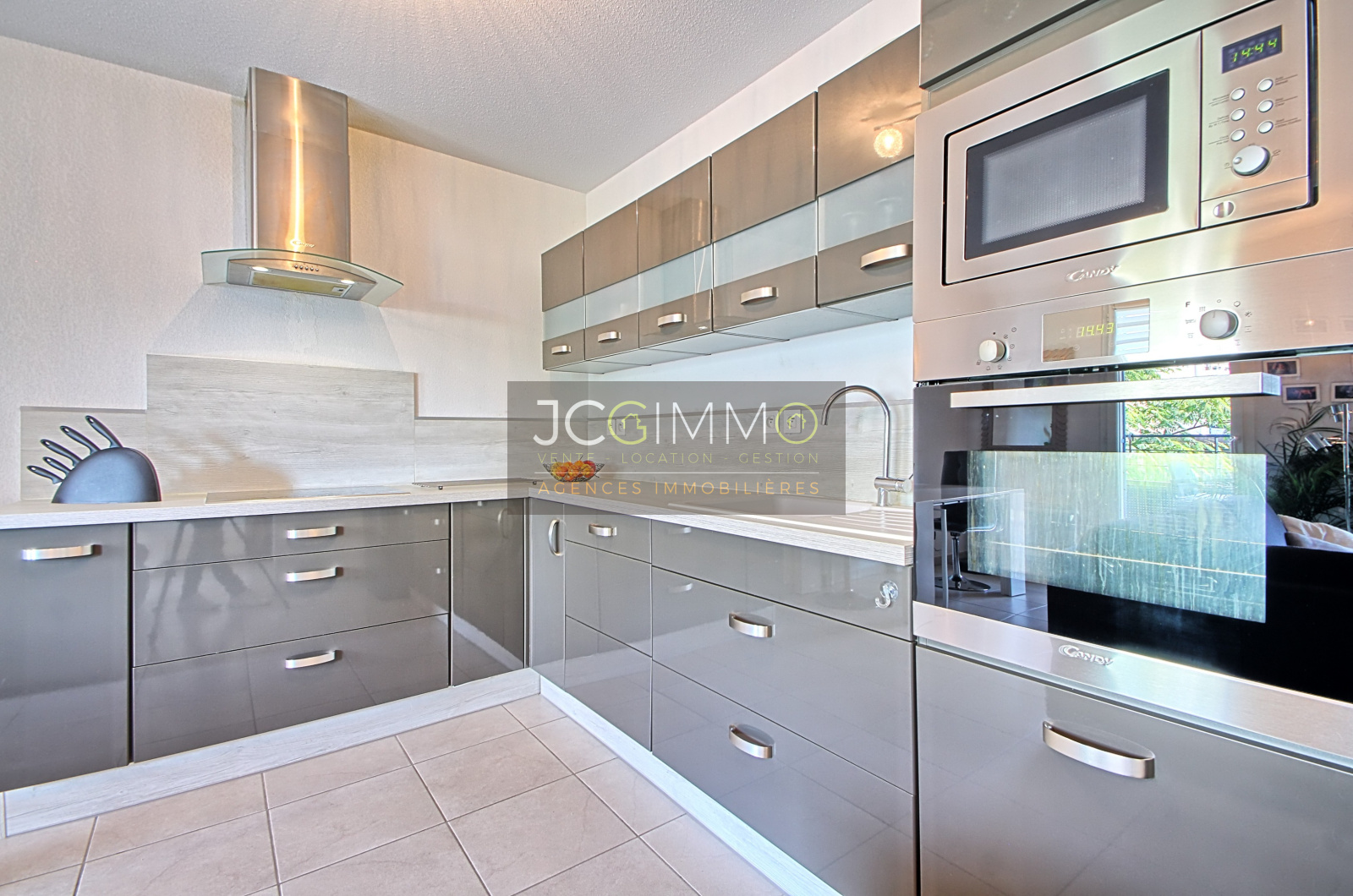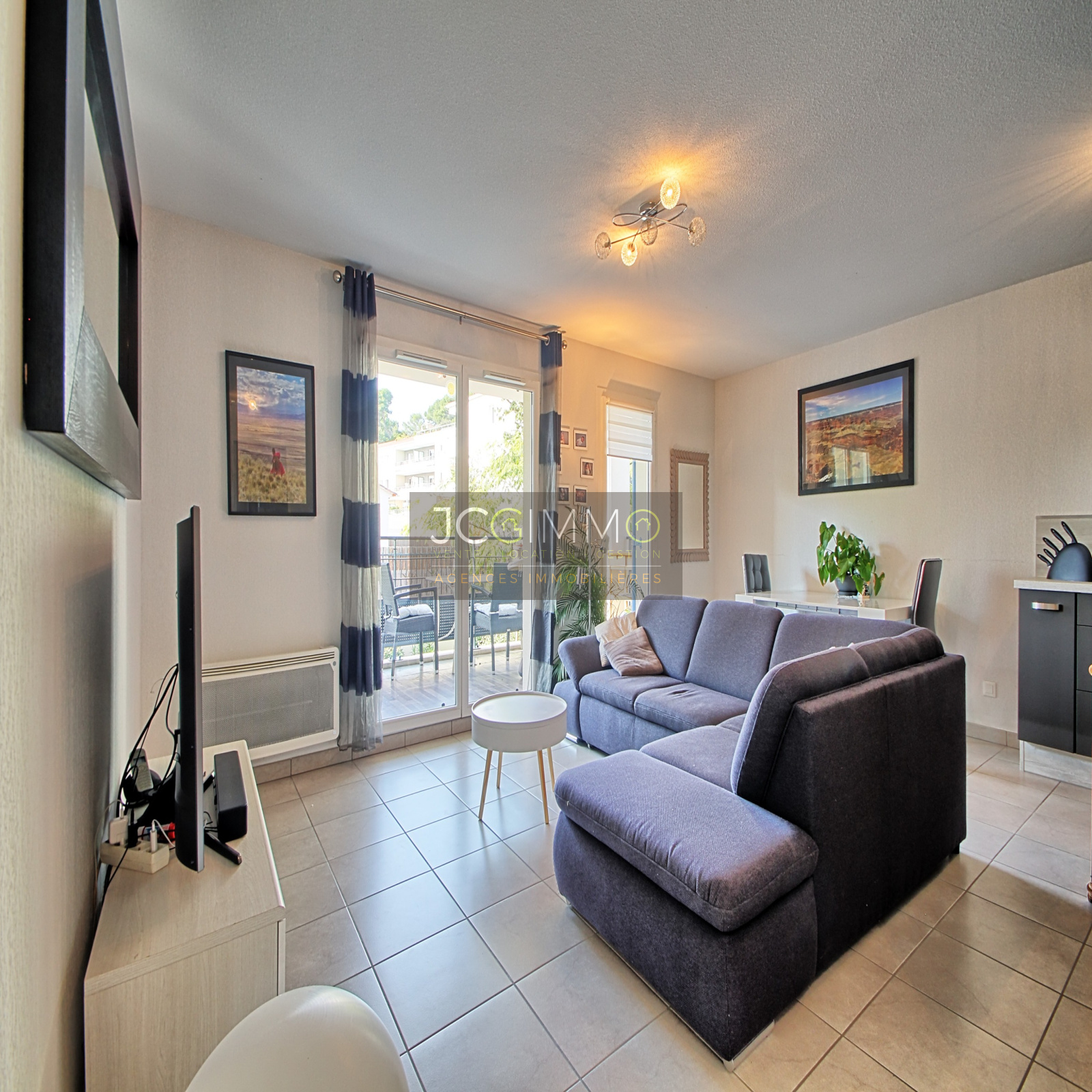 Salon avec cuisine US équipée et grande terrasse, 2 chambres, SDB, WC indépendant, et deux places de parking privé dont une en sous sol . Très belles prestations.