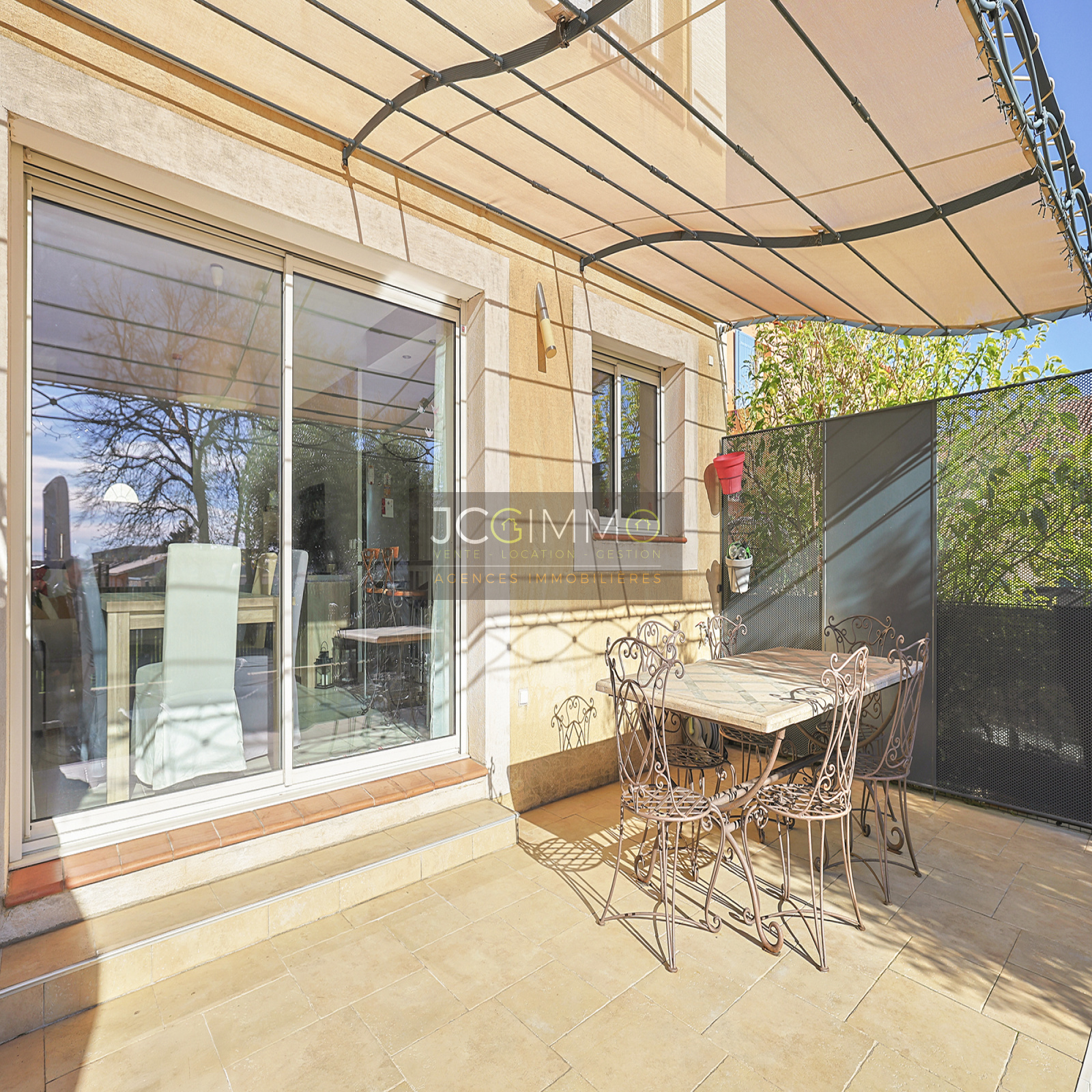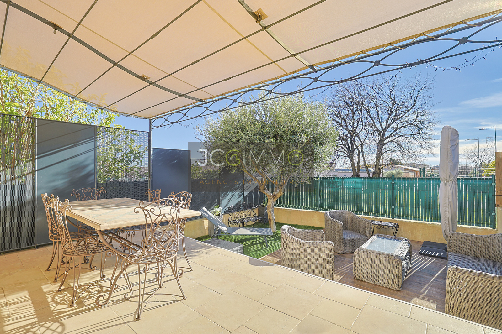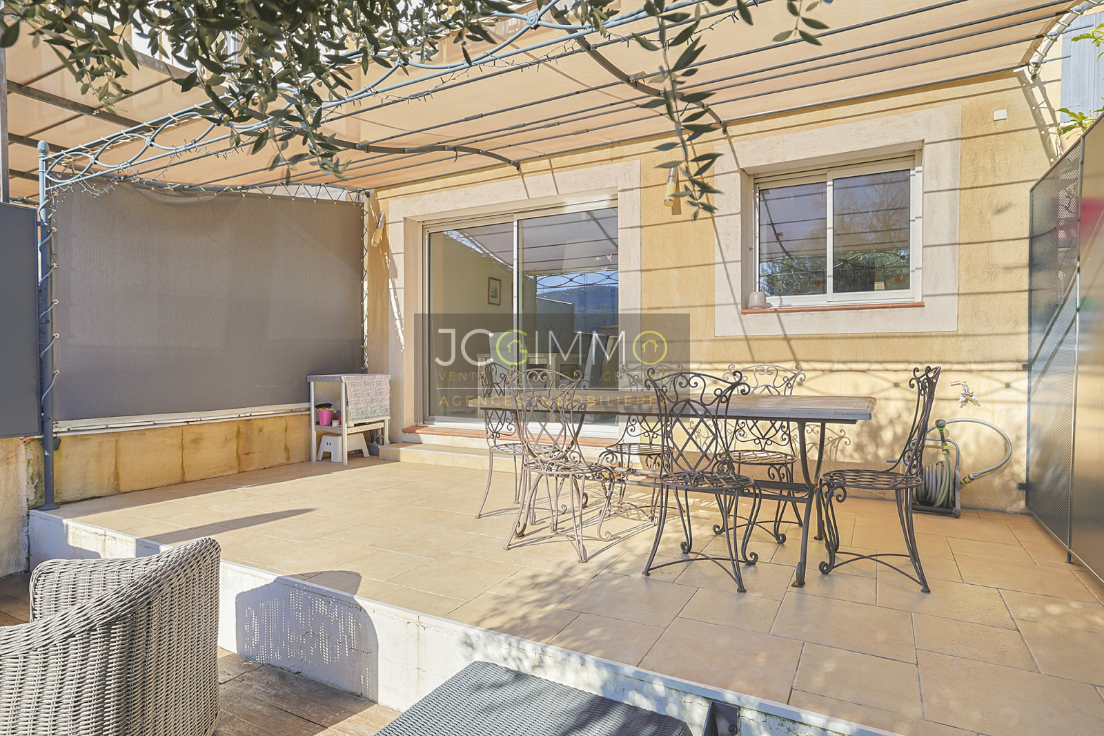 Côté sud une terrasse couverte par une jolie tonnelle de 17 m² et son jardin clos