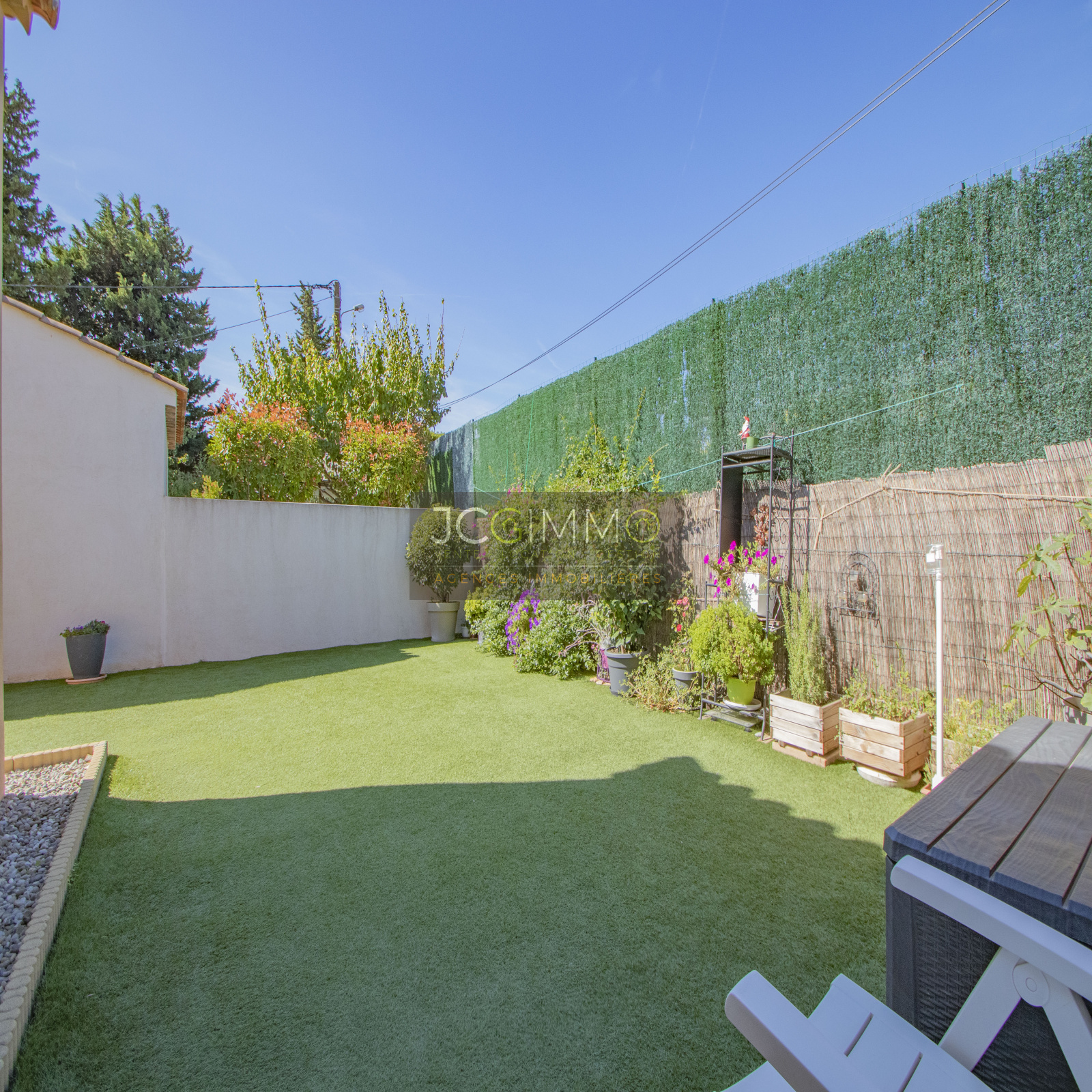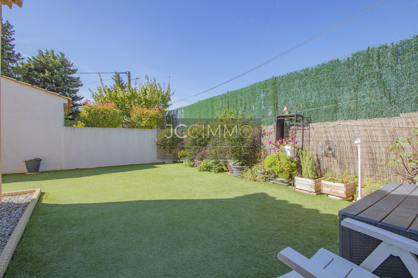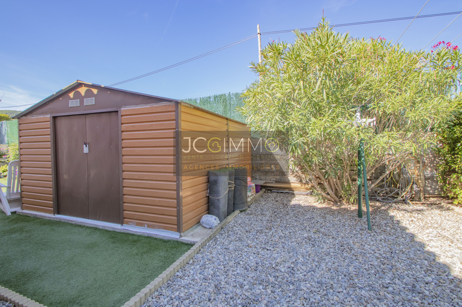 A l'EXTERIEUR, un terrain plat transformé avec soins, proposant plusieurs espaces détente, une terrasse bois couverte par une pergola et un cabanon de rangement à l'arière. Le jardin ne nécessite que très peu d'entretien.