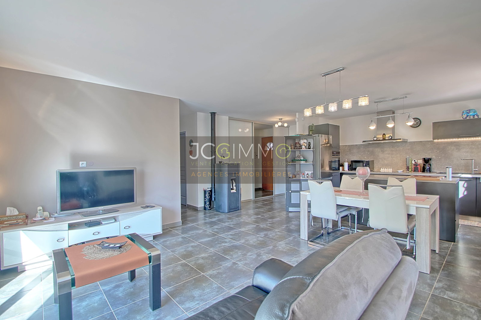 Elle se compose d' un salon/salle à manger/séjour climatisé + poêle à granules avec cuisine ouverte totalisant 41m² et d'un côté nuit comprenant 3 chambres, une salle d'eau (douche et baignoire + double vasques) et WC indépendants.