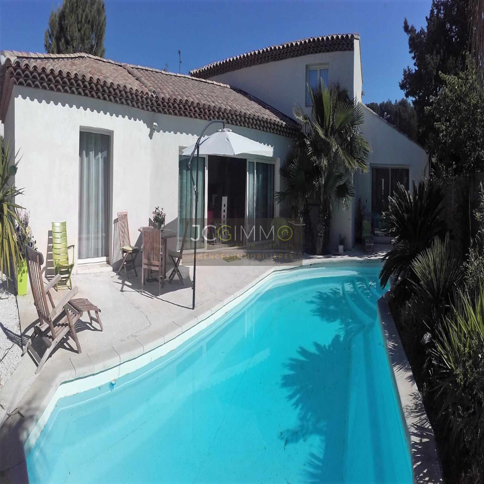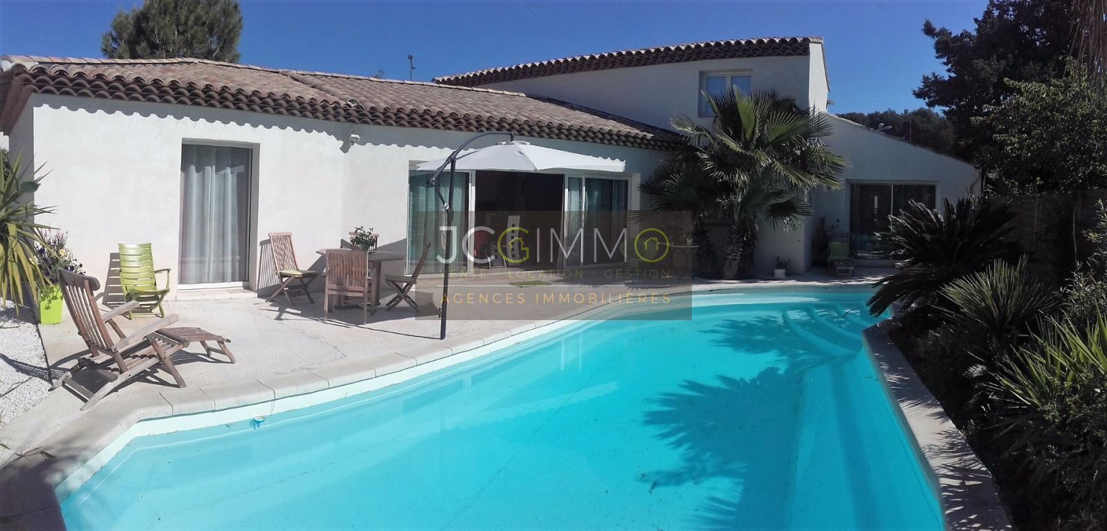CUERS: Villa neuve T5 de 147 m² env. sur un terrain plat de 570 m² clos avec piscine et garage . Espace de vie de 67 m² env avec cuisine équipée, 3 chambres dont 2 suites parentales de plain pied de 17 et 22m² avec salles d'eau et dressing, un bureau de 12 m² (possibilite 4eme chambre), 1 SDB et WC . 4 Stationnments intérieurs. PRESTATIONS DE QUALITE ET PARFAIT ETAT. Aucun vis à vis et proche commodités