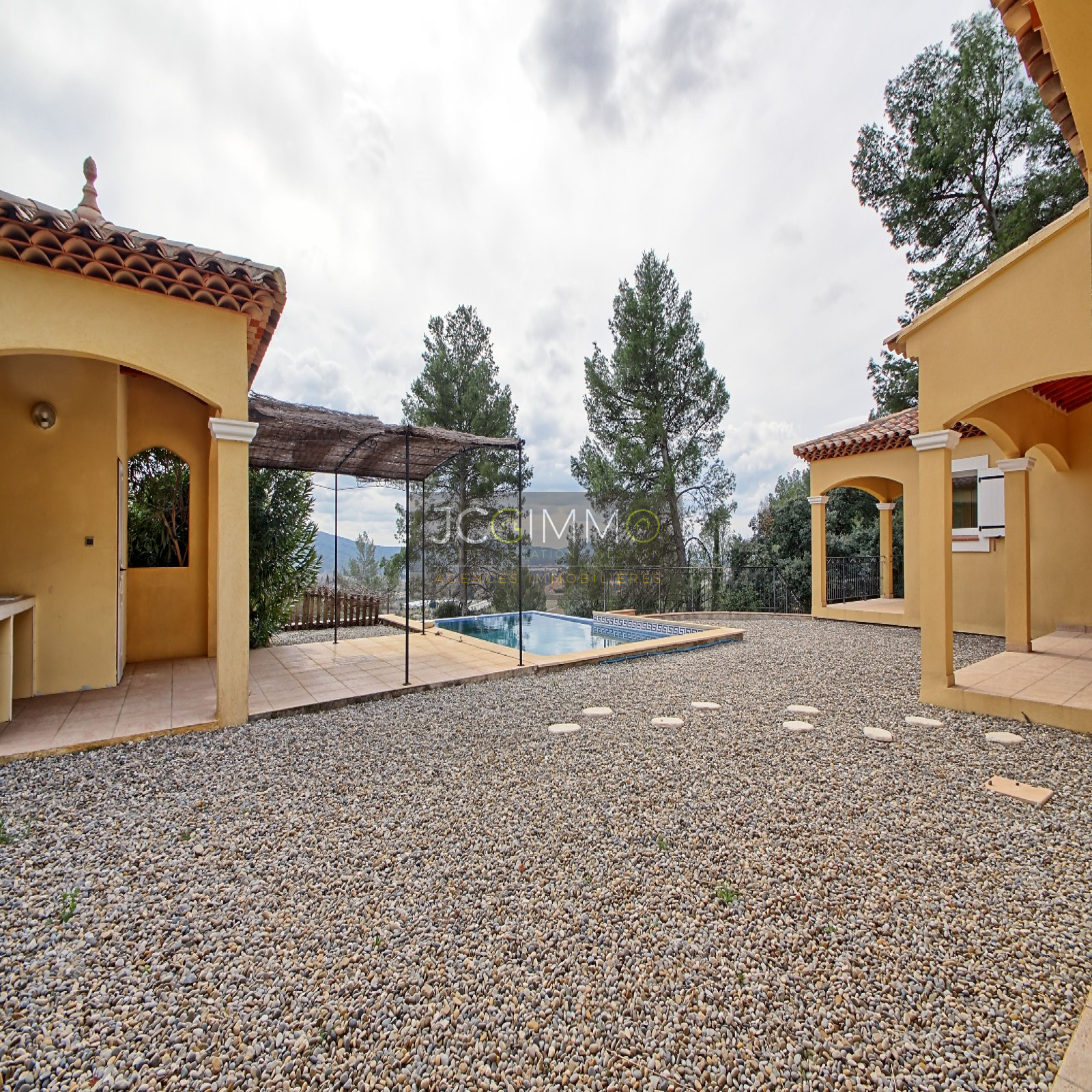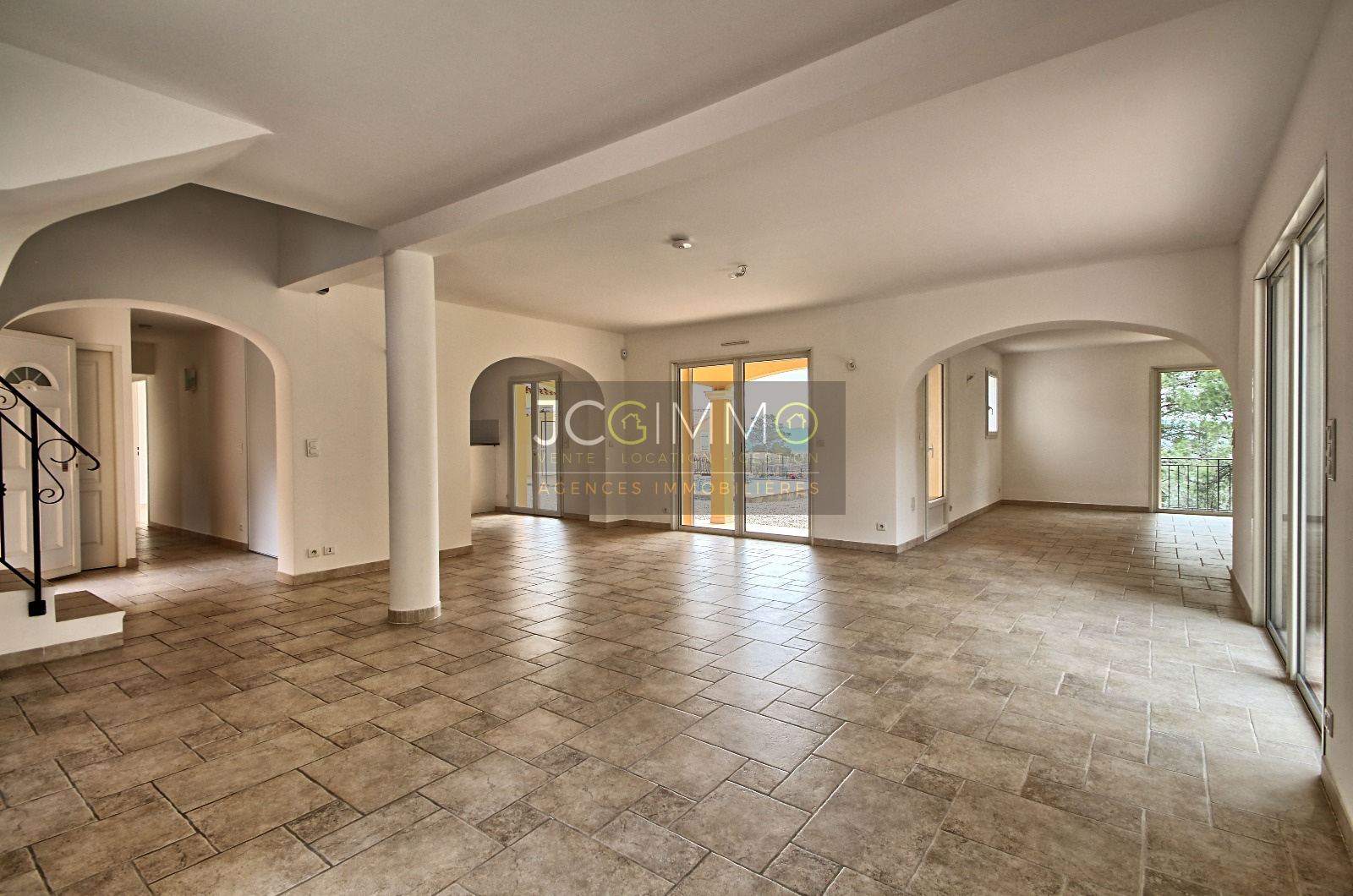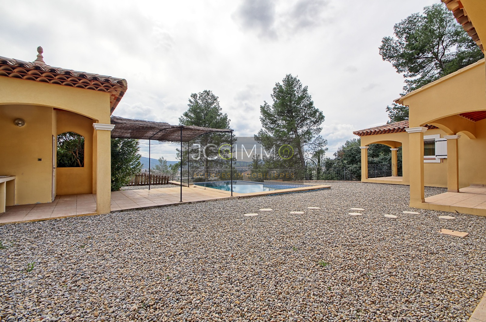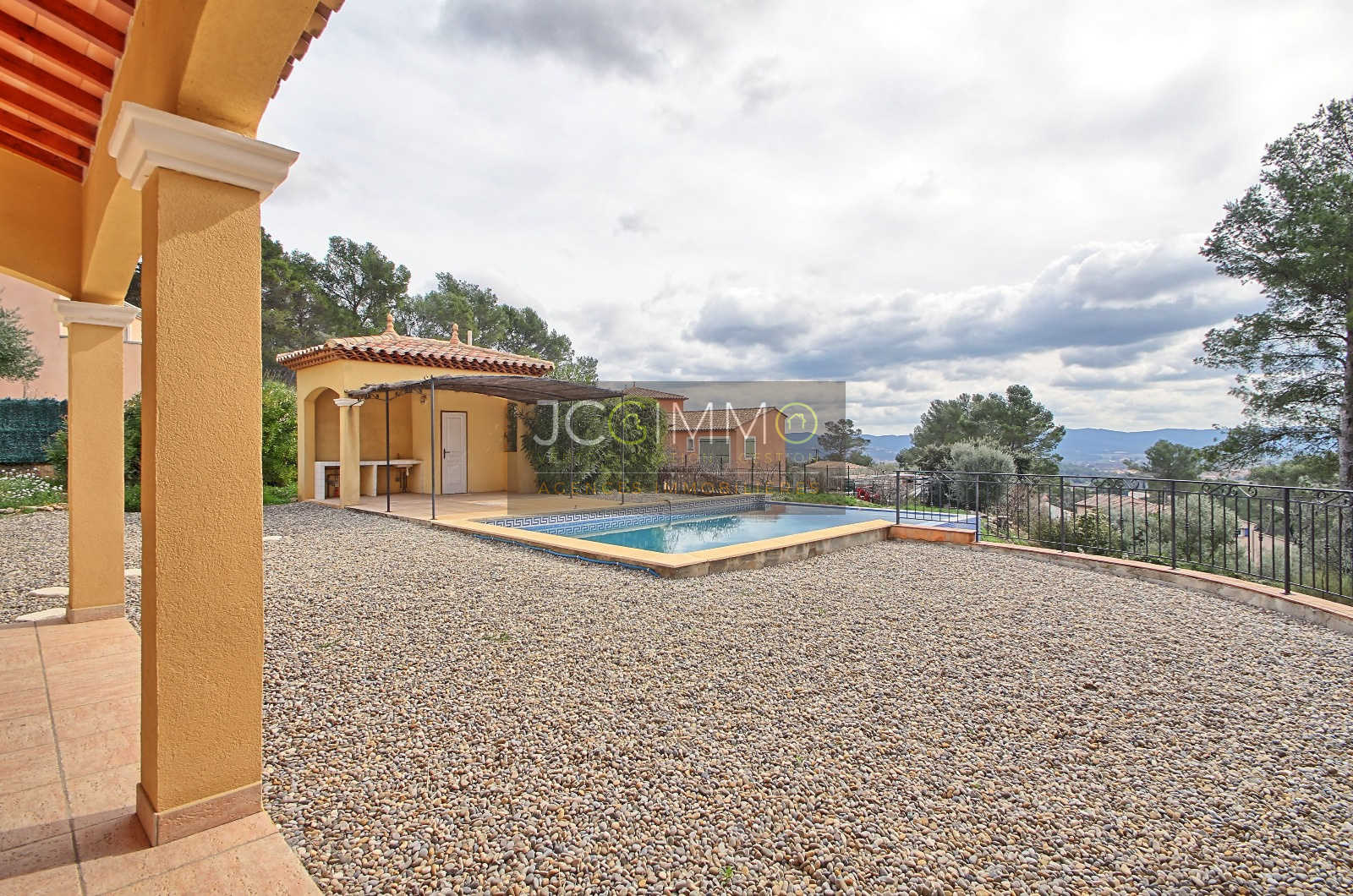 CUERS Secteur Résidentiel. ETAT NEUF. Villa individuelle 2007 T6/7 de 171m² habitables avec Piscine à débordement et Grand Garage sur un terrain clos de 2000m² env. avec portail motorisé. Vue Dominante, Dégagée et Imprenable. La Villa TRES LUMINEUSE orientée Sud-Est/Sud-Ouest comprend au RdChaussée : Hall d’entrée, Pièce de Vie avec cuisine US de 79m², cellier, WC suspendu séparé, 2 chambres dont une Suite Parentale (20m²) avec Dressing, Salle de Douches à l’italienne / WC intégré. A l’étage : 2 chambres, 1 WC suspendu, 1 salle de douches à l’italienne. A l’extérieur : 3 terrasses loggia, Piscine faïencée à débordement 8x5m, Pool house avec WC&Douches, Local Technique et Grand Garage 37 m² intégrant une cave naturelle. Belles Prestations : Construction de qualité exécutée dans la Grande Tradition, Nombreuses Baies à galandage motorisées, Volets PVC, Aspiration Centralisée, Chauffage GAZ par le sol. Terrasses et Sol intérieur intégralement carrelés. Assainissement Fosse Septique en conformité. Parking intérieur 5/6 voitures. AUCUN TRAVAUX A PREVOIR (ETAT NEUF)