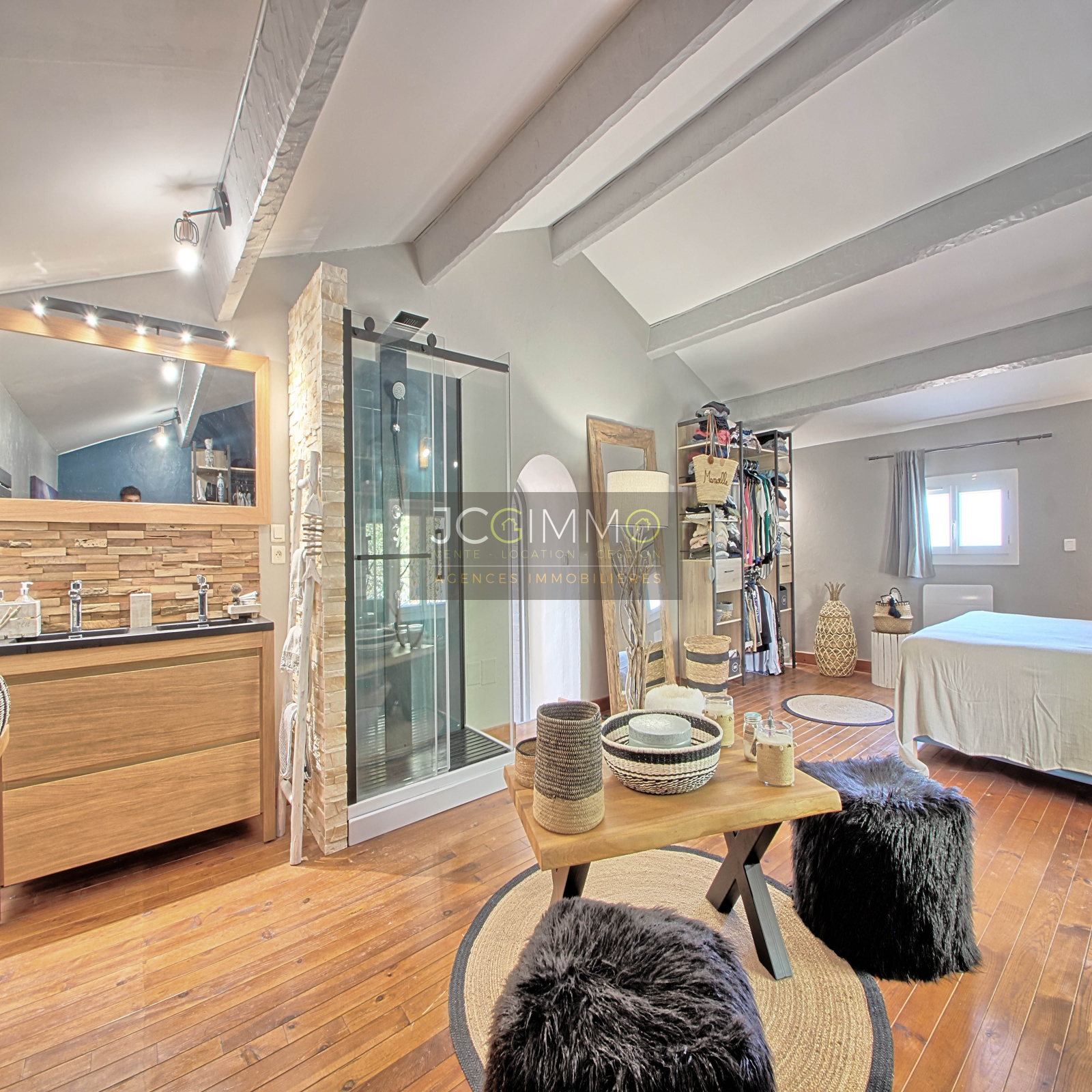 A l'ETAGE, un grand bureau en enfilade et une immense suite parentale style loft de 35m² avec douche et double vasques.