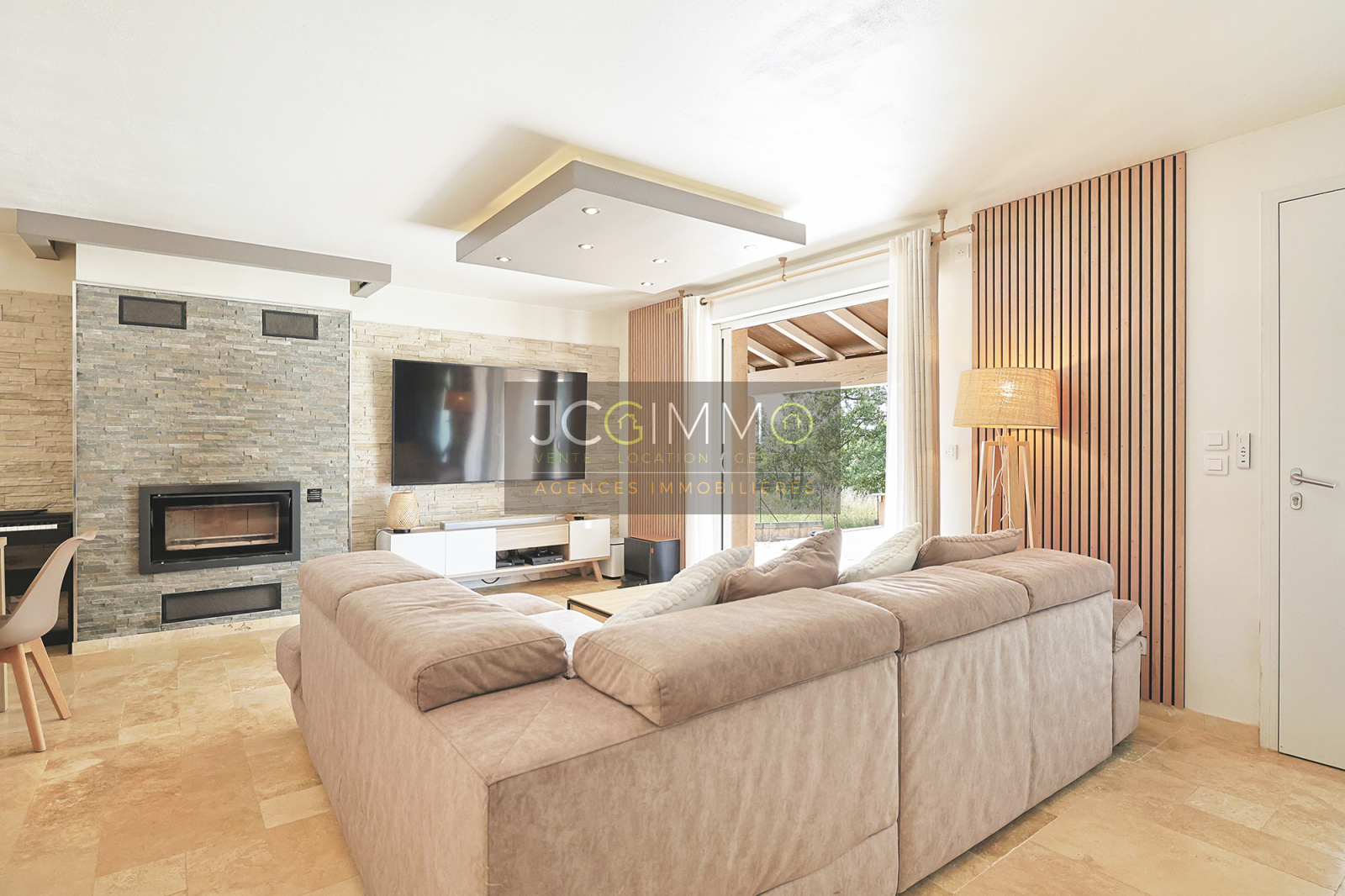 À l'intérieur : la maison s'ouvre sur une pièce de vie de 46m² comprenant salon, salle à manger, cuisine américaine avec îlot central, baies à galandages, climatisation réversible, cheminée et placard.