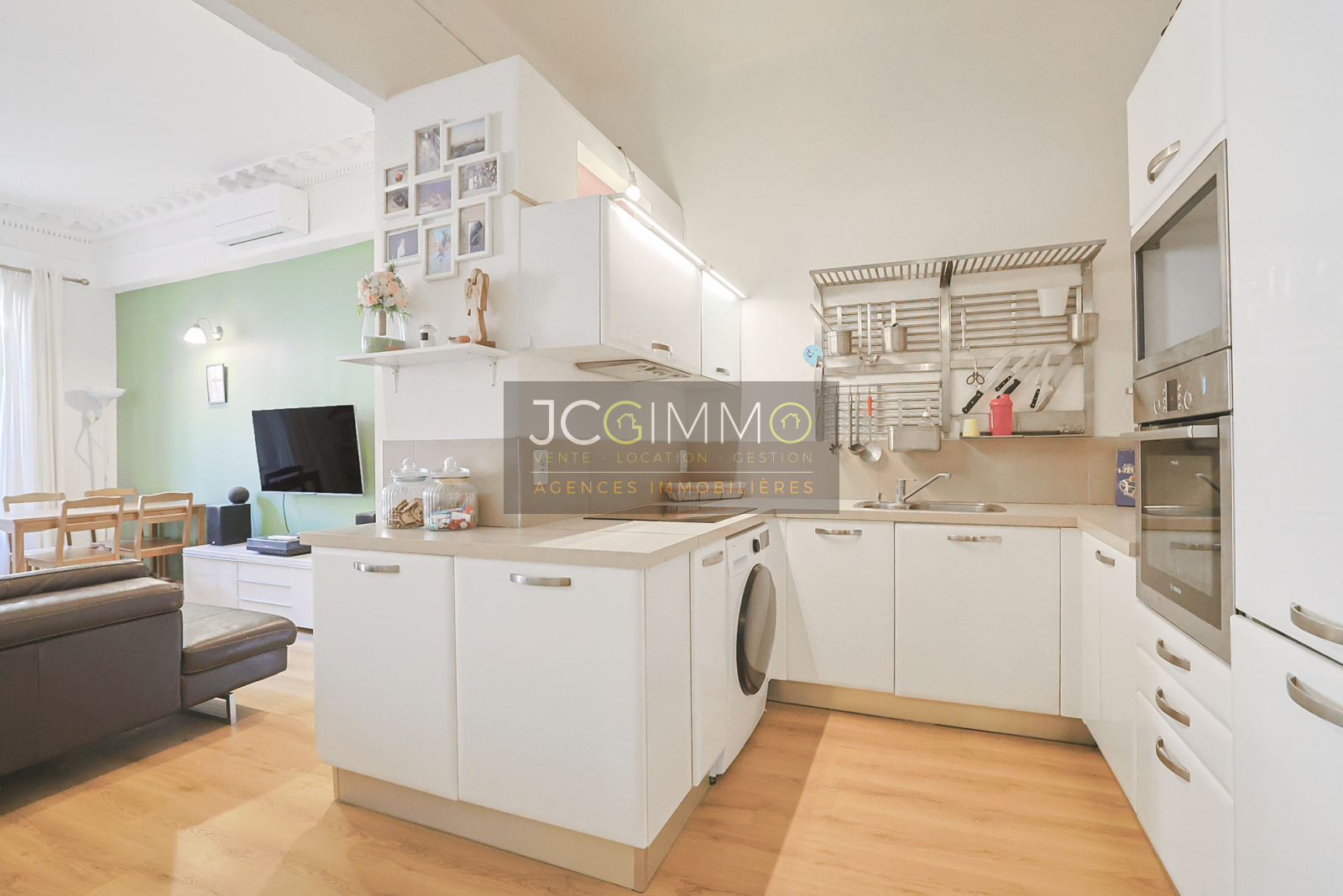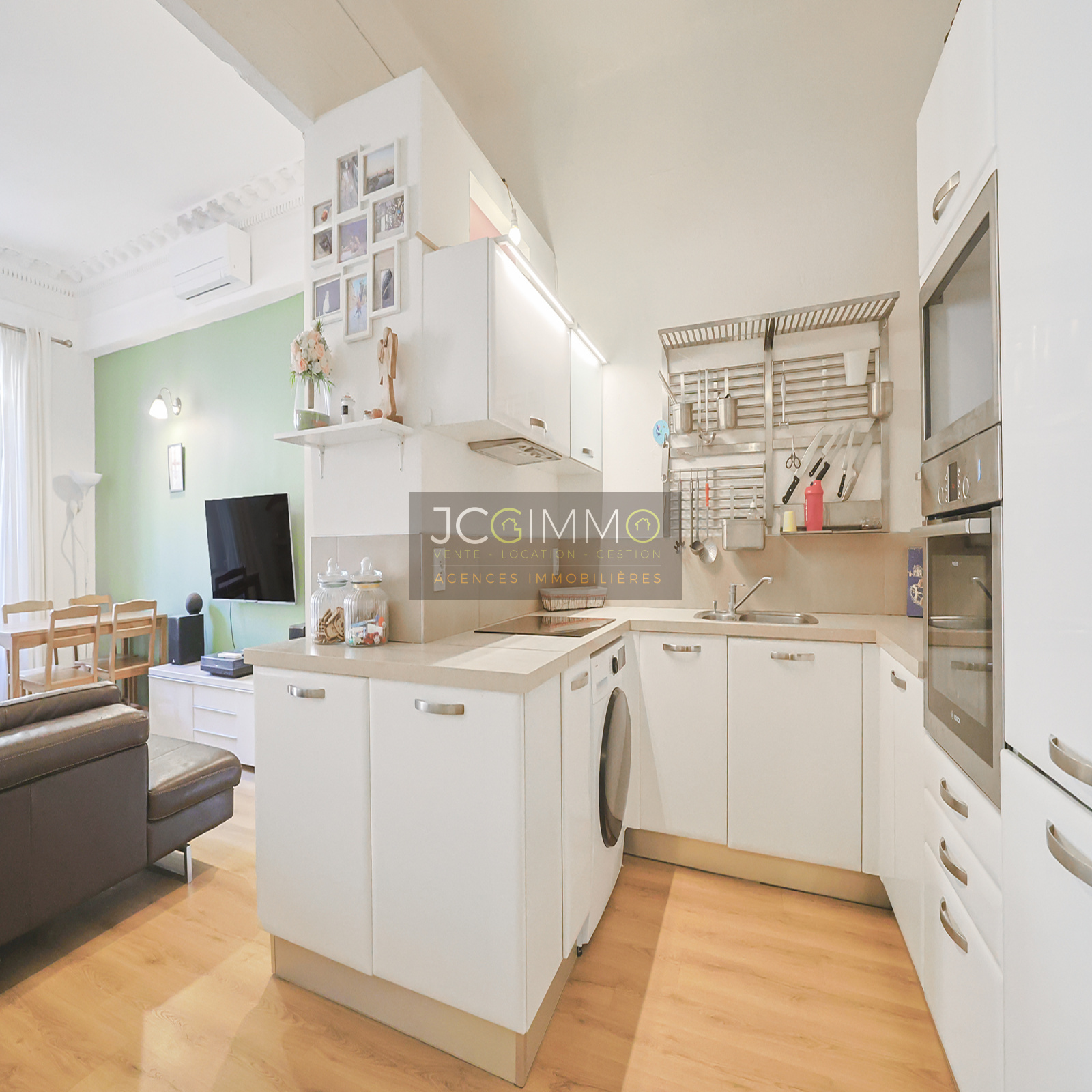 - d’une grande pièce de vie incluant un coin séjour, un espace avec un bureau, et une belle cuisine moderne ouverte 100% équipée ; le tout faisant 40 m²