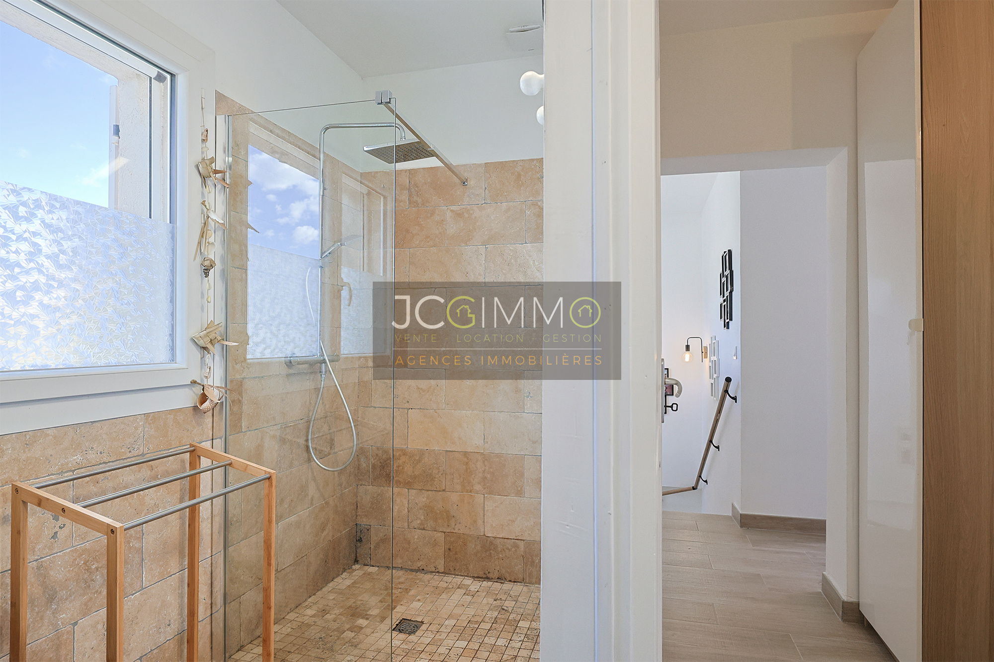 Les combles aménagés, accessibles par un escalier en colimaçon, accueillent une troisième chambre avec salle d’eau et un coin canapé, idéal pour recevoir ou créer un espace indépendant.