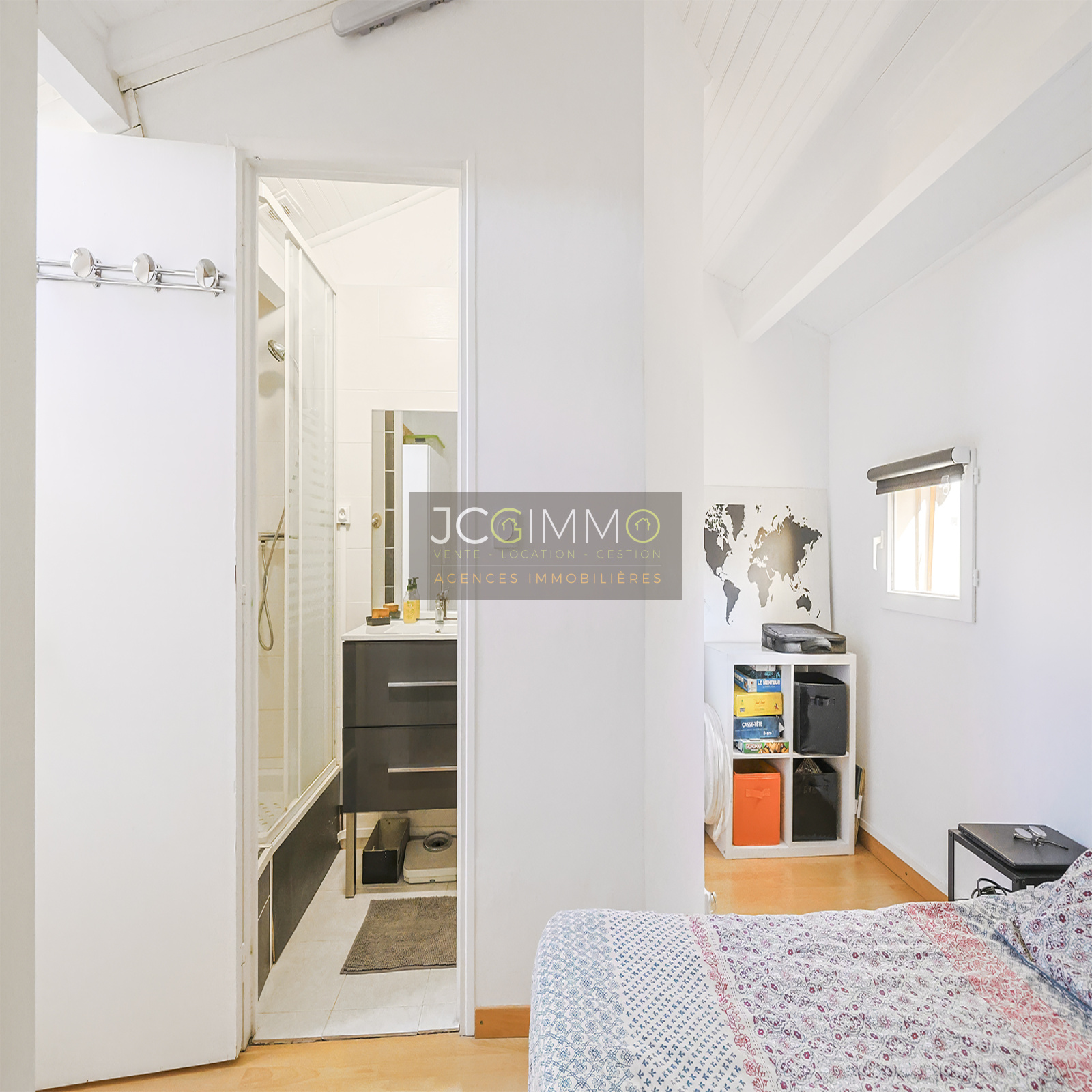 À l’étage, deux chambres composent l’espace nuit, dont une grande chambre avec dressing lumineux, ainsi qu’une salle d’eau équipée d’une douche à l’italienne.