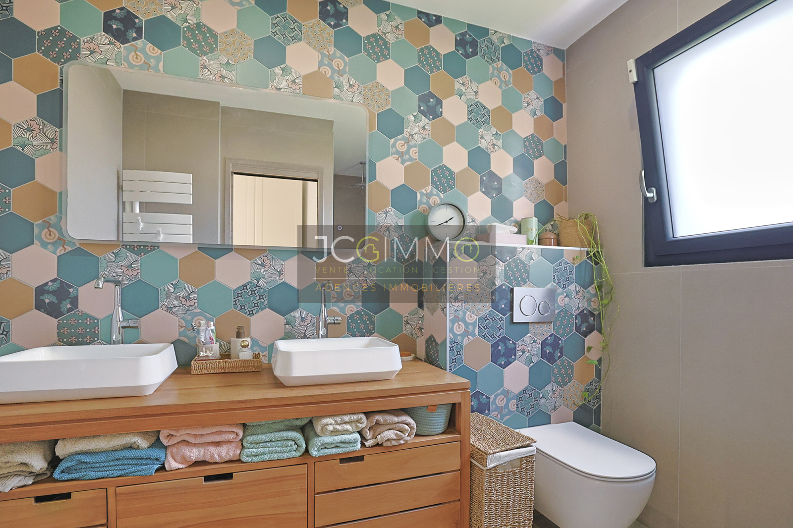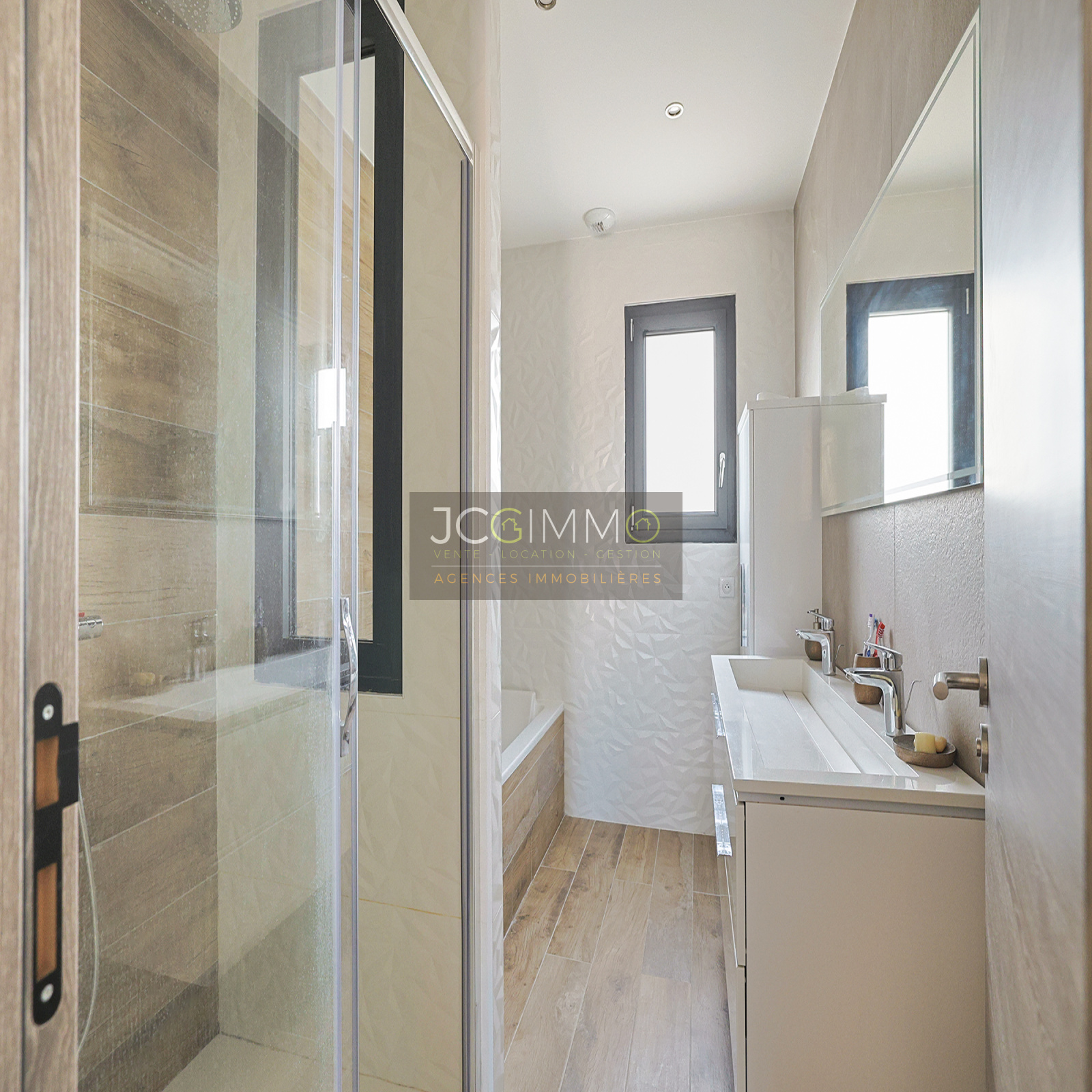 À l'étage, trois chambres spacieuses avec rangements dont l’une avec sa terrasse privative, une salle de bains avec baignoire, douche et WC.
