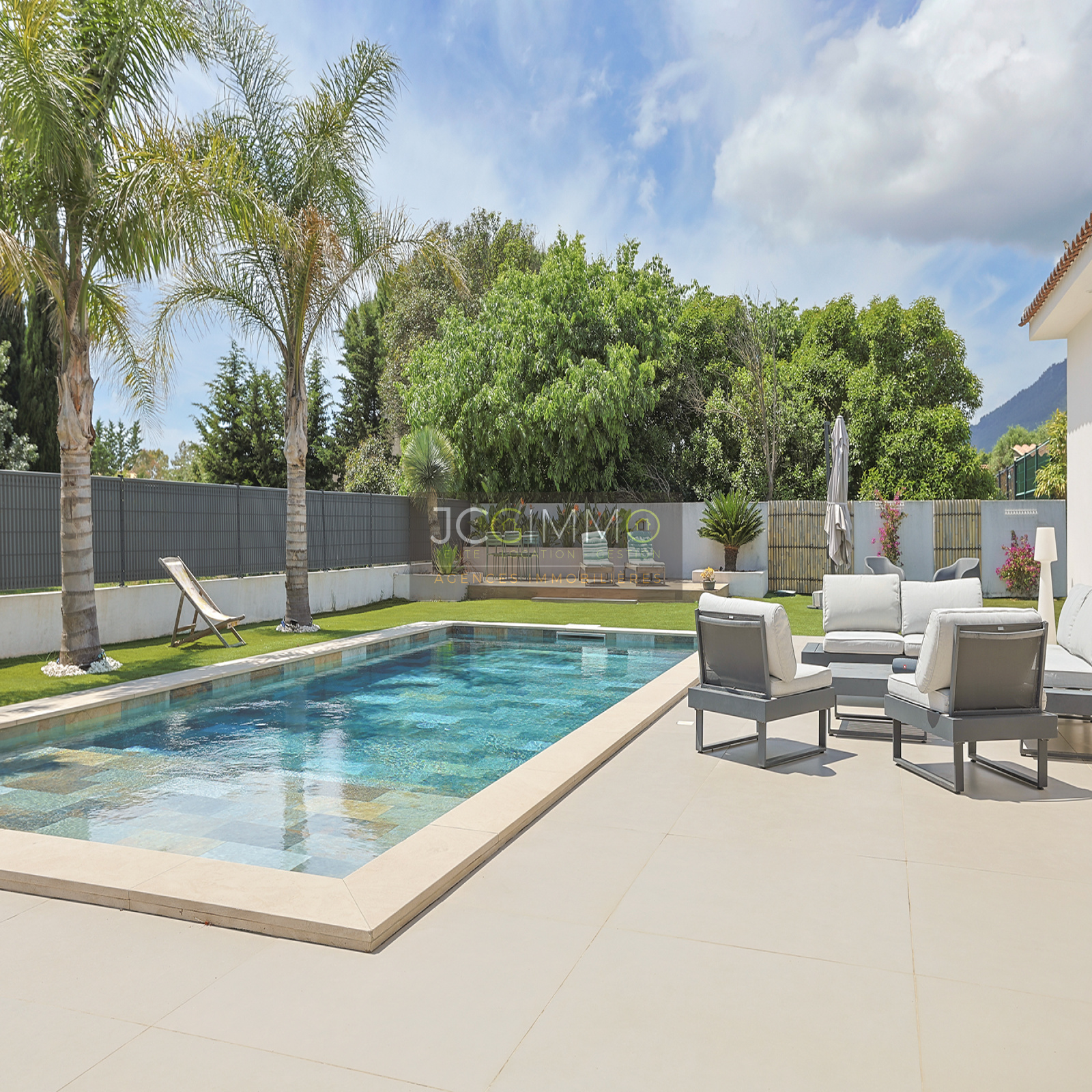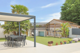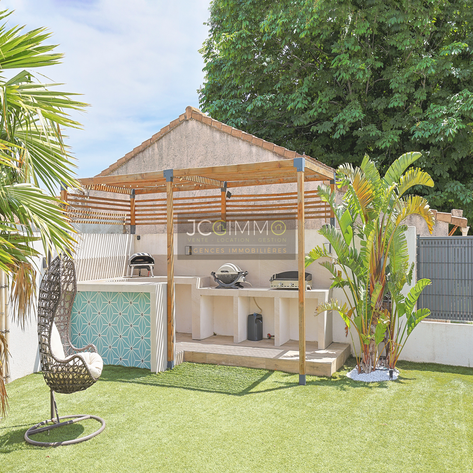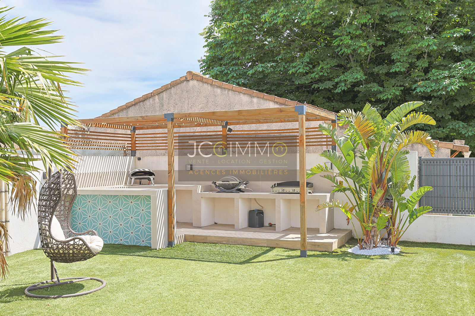 À l’extérieur, le terrain est plat et entièrement clôturé, superbe piscine au sel type Bali de 10m x 4.5m. La villa dispose également d’une cuisine d’été, parfaite pour des moments de détente en plein air. Belle terrasse en bord de piscine avec pergola bioclimatique.