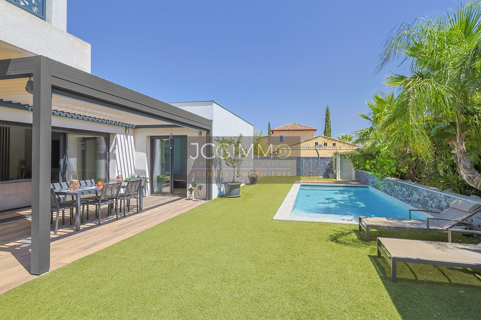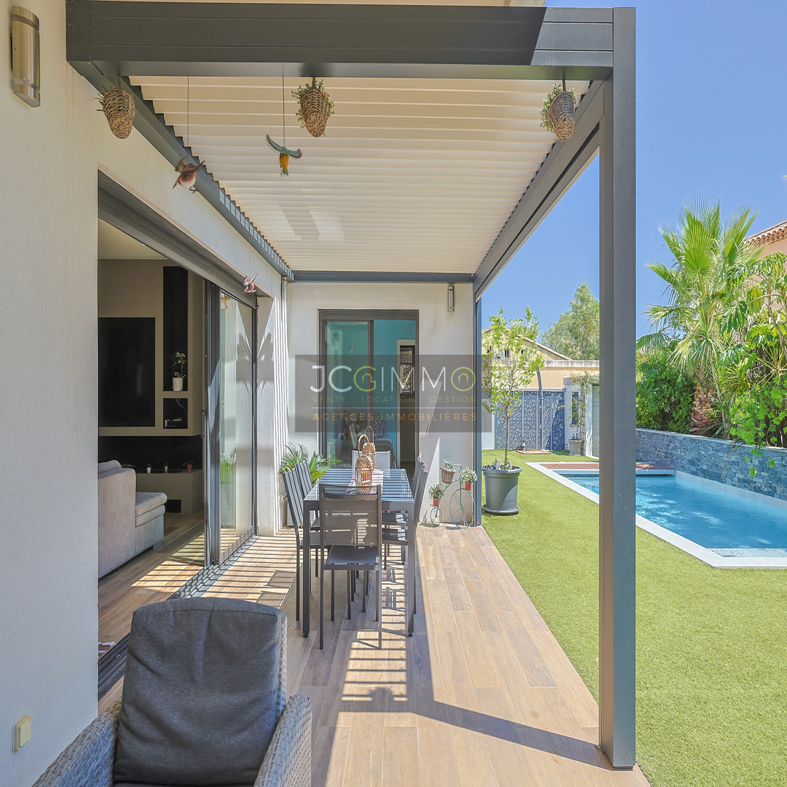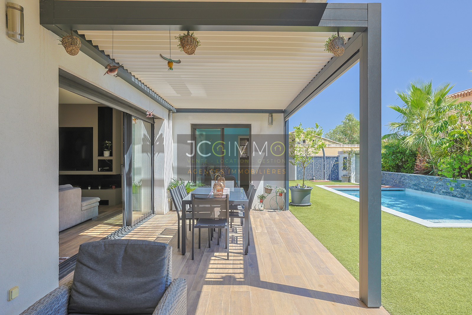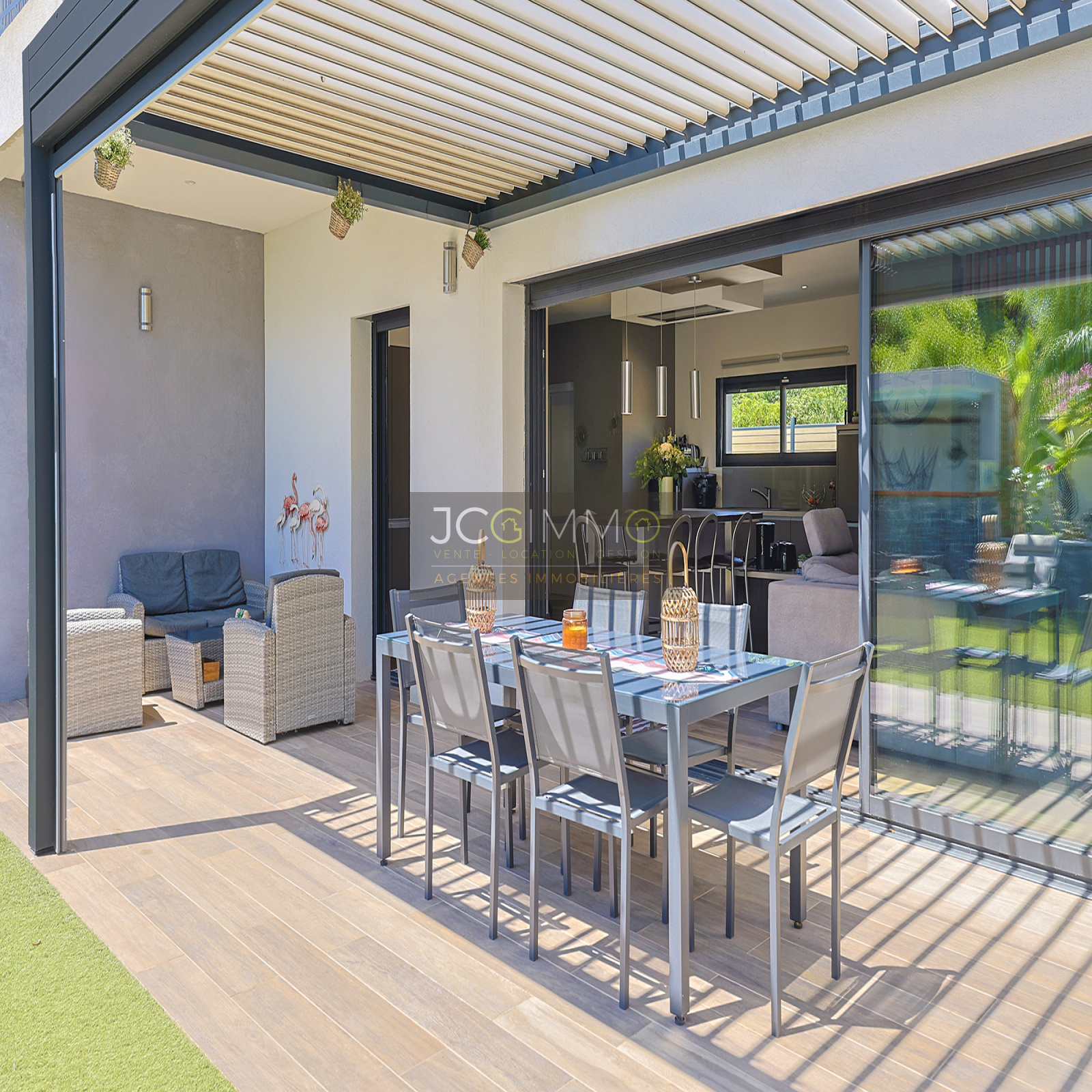 - Une terrasse aménagée avec soin, équipée d’une pergola bioclimatique idéale pour recevoir.