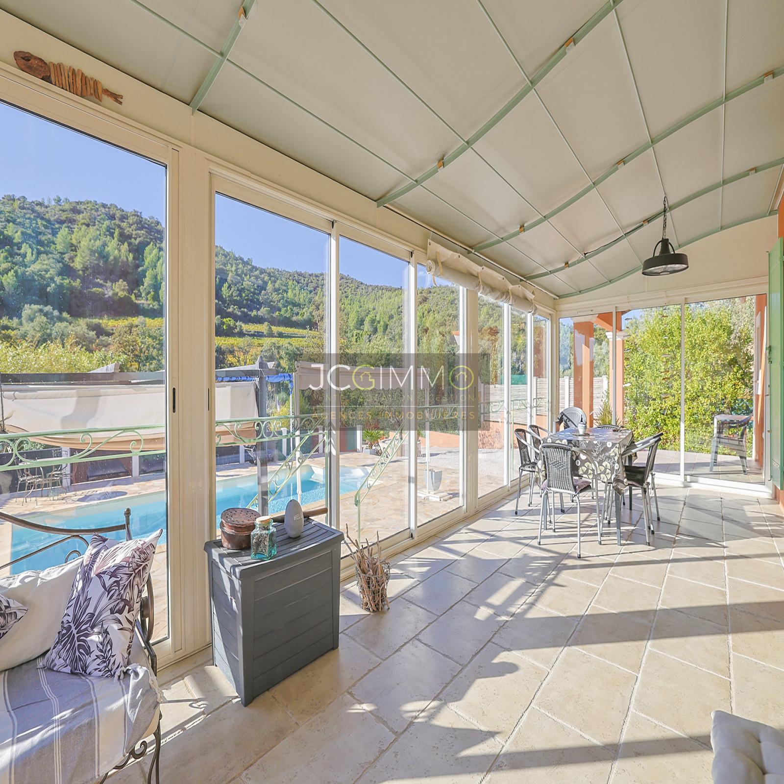 Entre véranda baignée de lumière, vue sur les collines, cuisine d’été et calme absolu, elle réunit tous les atouts d’une vie paisible à Hyères.