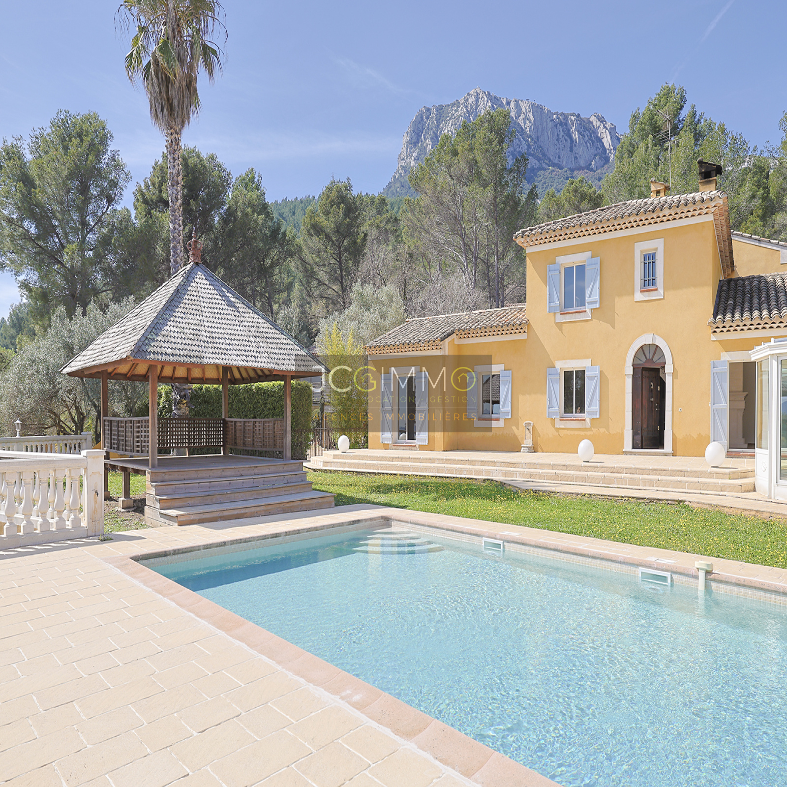 La propriété se compose d’une maison principale élevée d’un étage de 256m² avec 6 chambres, agrémentée d’un bel espace extérieur avec piscine et cuisine d’été de 36m².