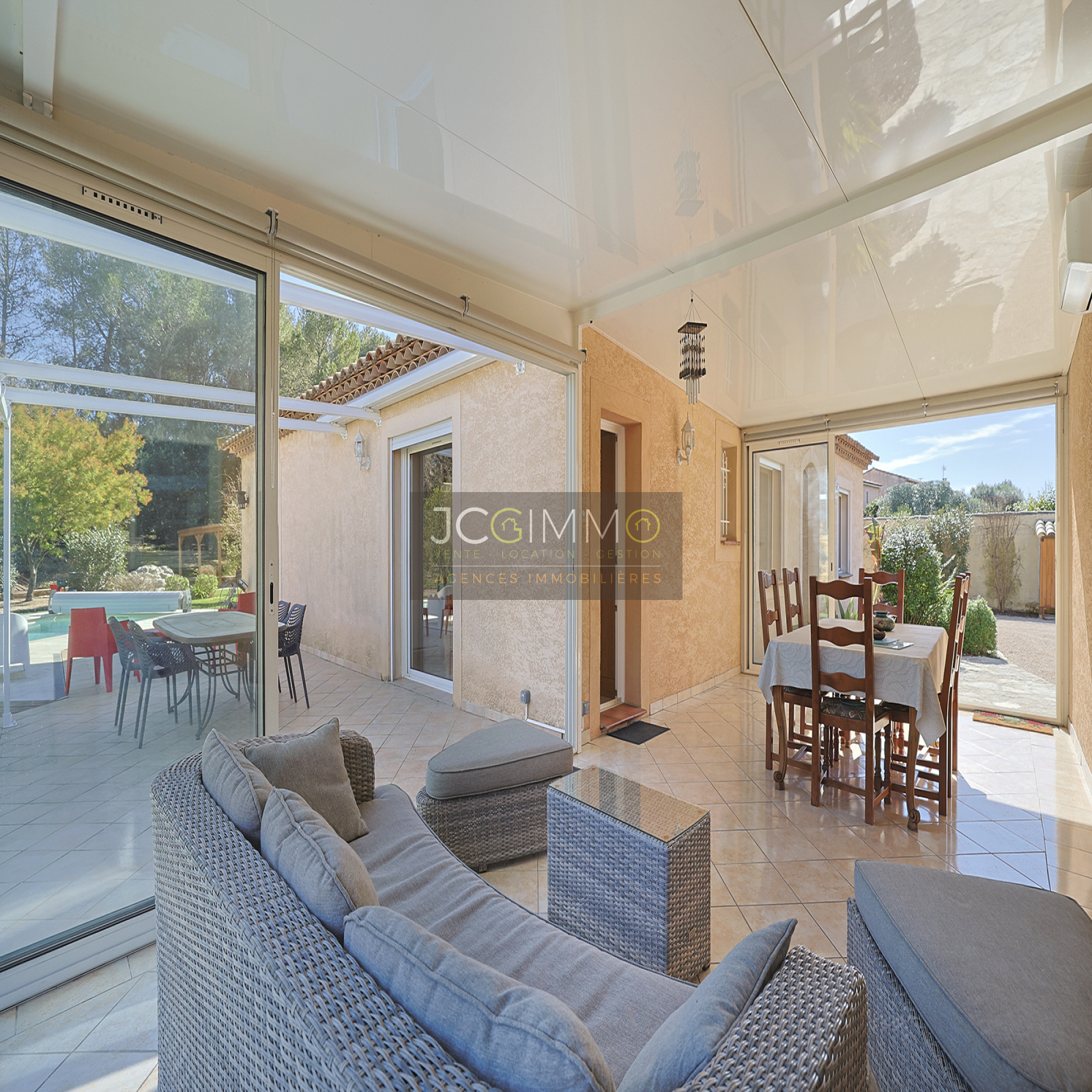 - Une véranda fermée de 28 m² entièrement carrelée et climatisée vient prolonger les espaces de vie et constitue une pièce supplémentaire idéale en salon d’hiver, salle à manger ou espace détente.