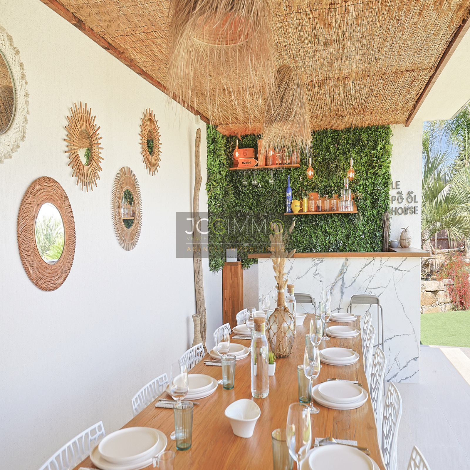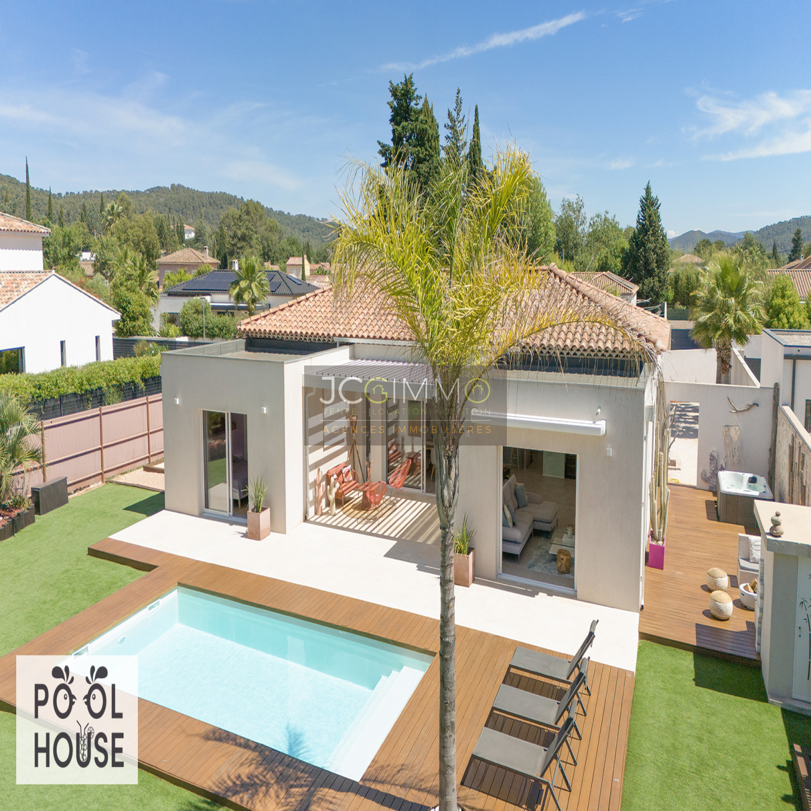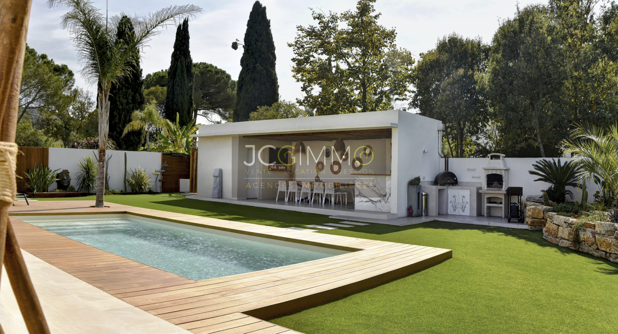 Le pool house de 45 m² est un véritable atout : il comprend un bar extérieur, un espace repas (12 places), une cuisine d’été et WC. Entièrement orienté vers la piscine, il peut être transformé en appartement indépendant de type T2.