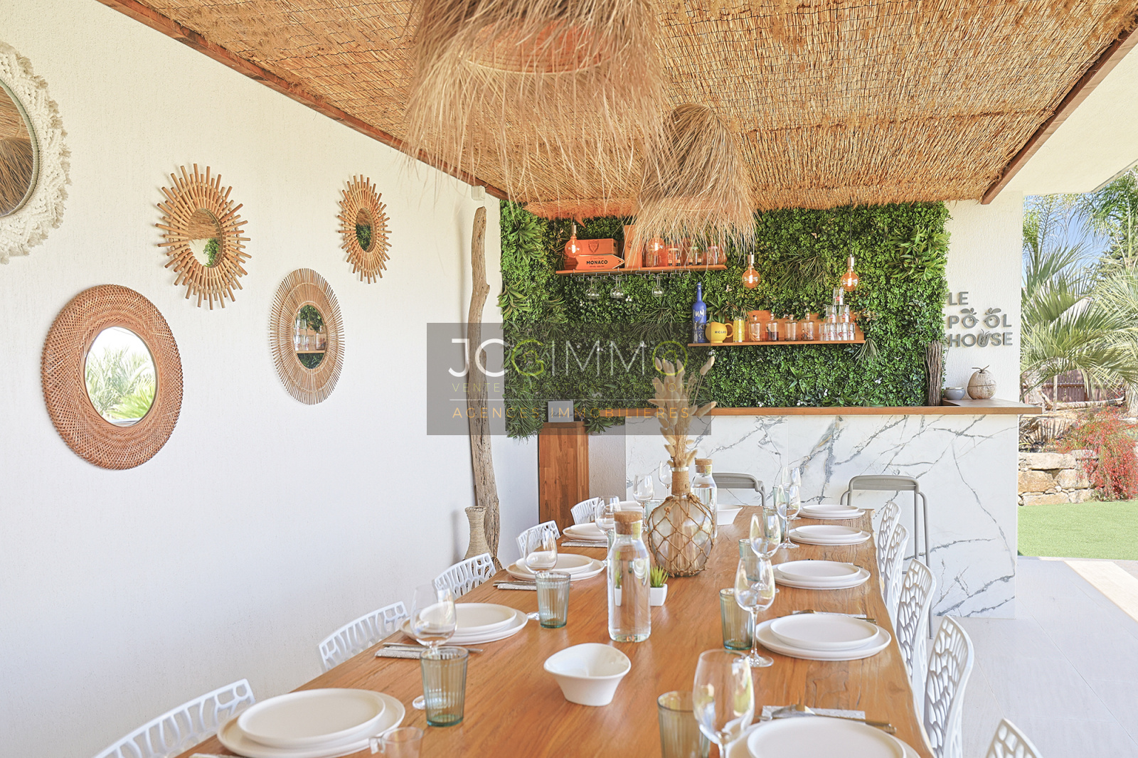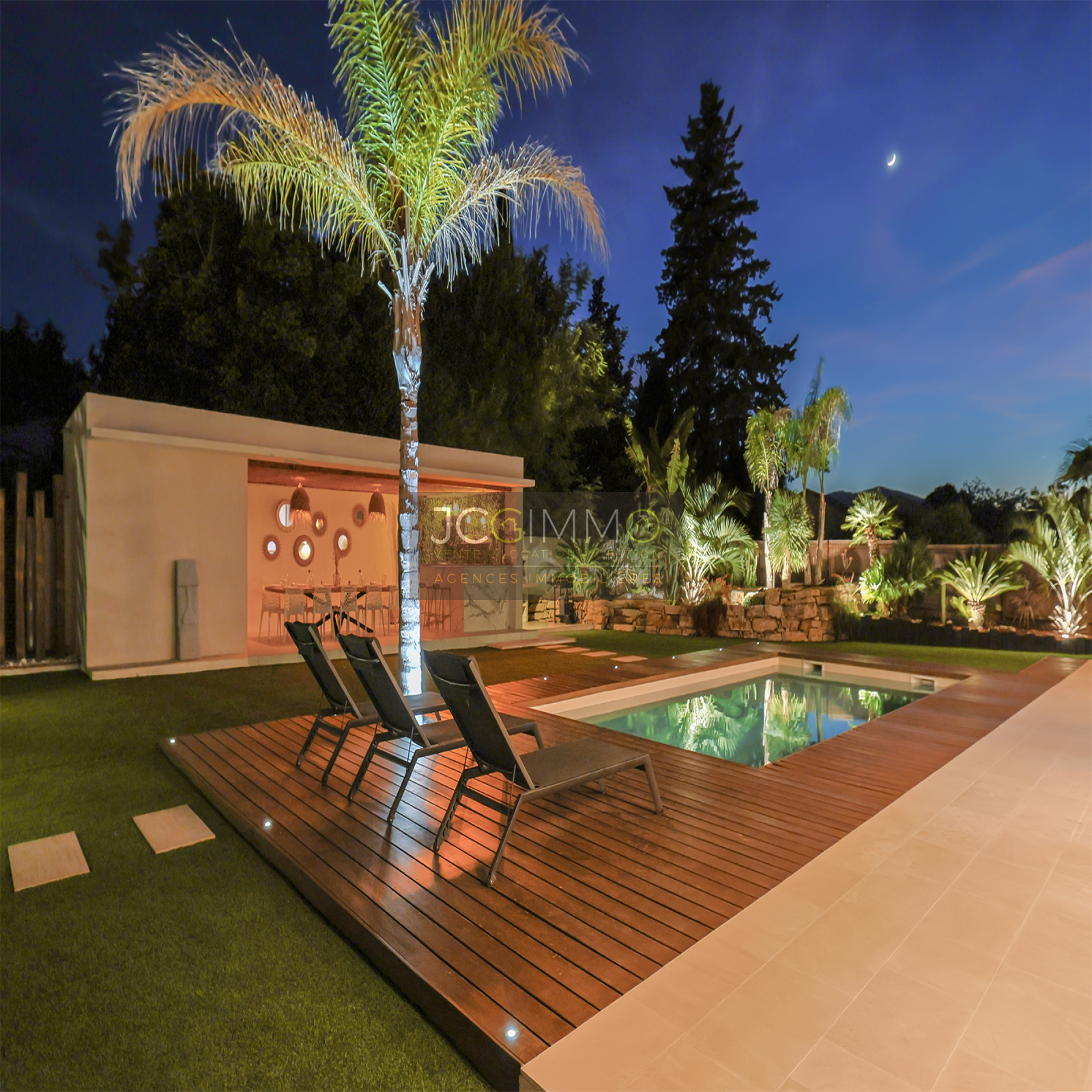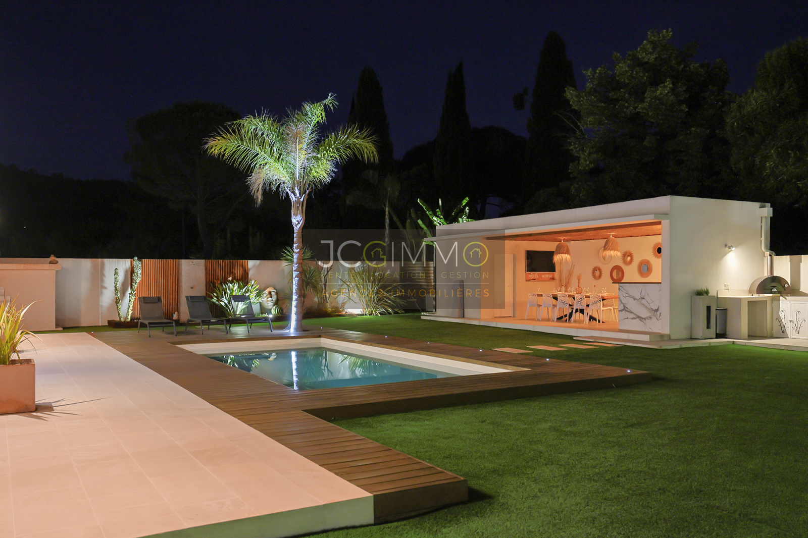 Le pool house de 45 m² est un véritable atout : il comprend un bar extérieur, un espace repas (12 places), une cuisine d’été et WC. Entièrement orienté vers la piscine, il peut être transformé en appartement indépendant de type T2.