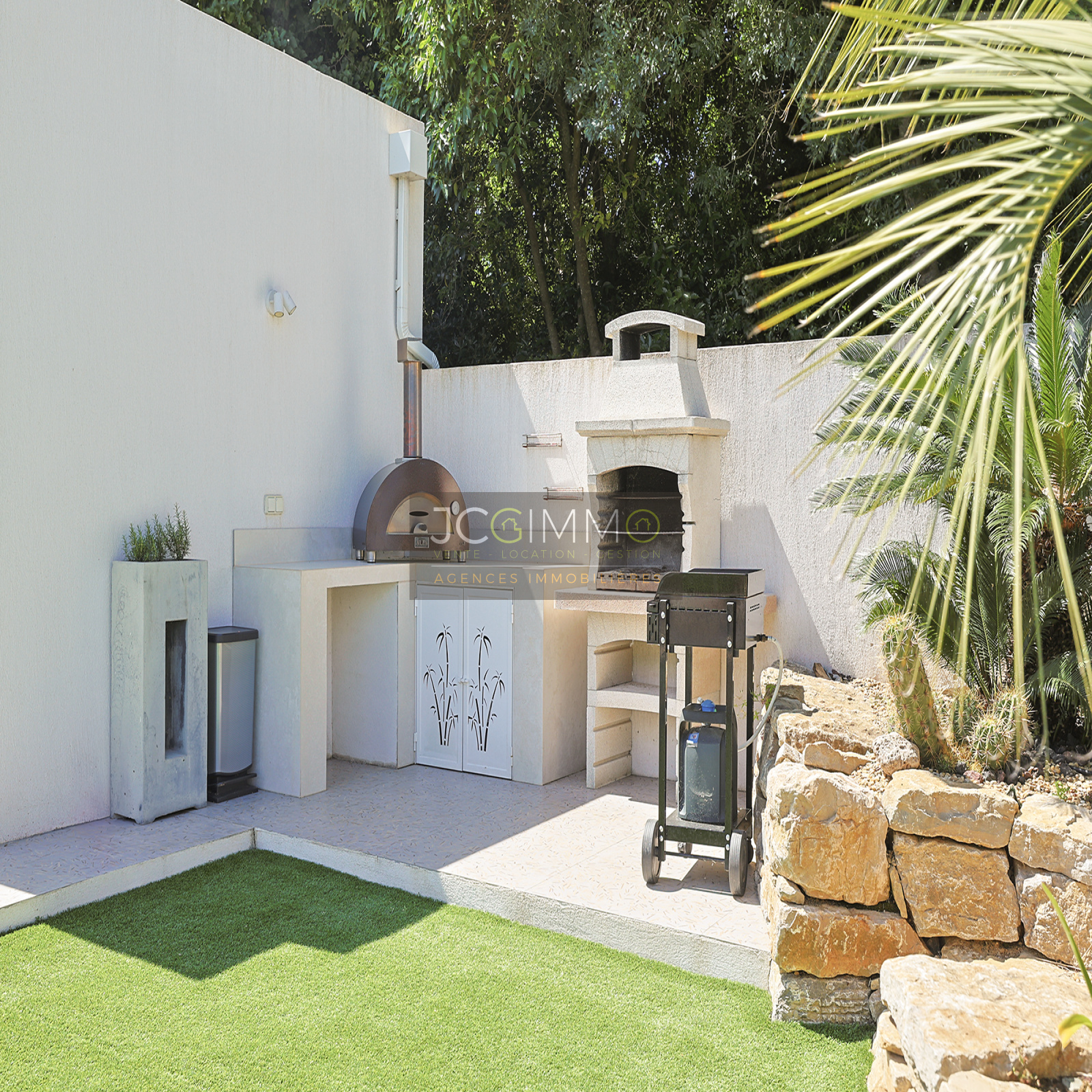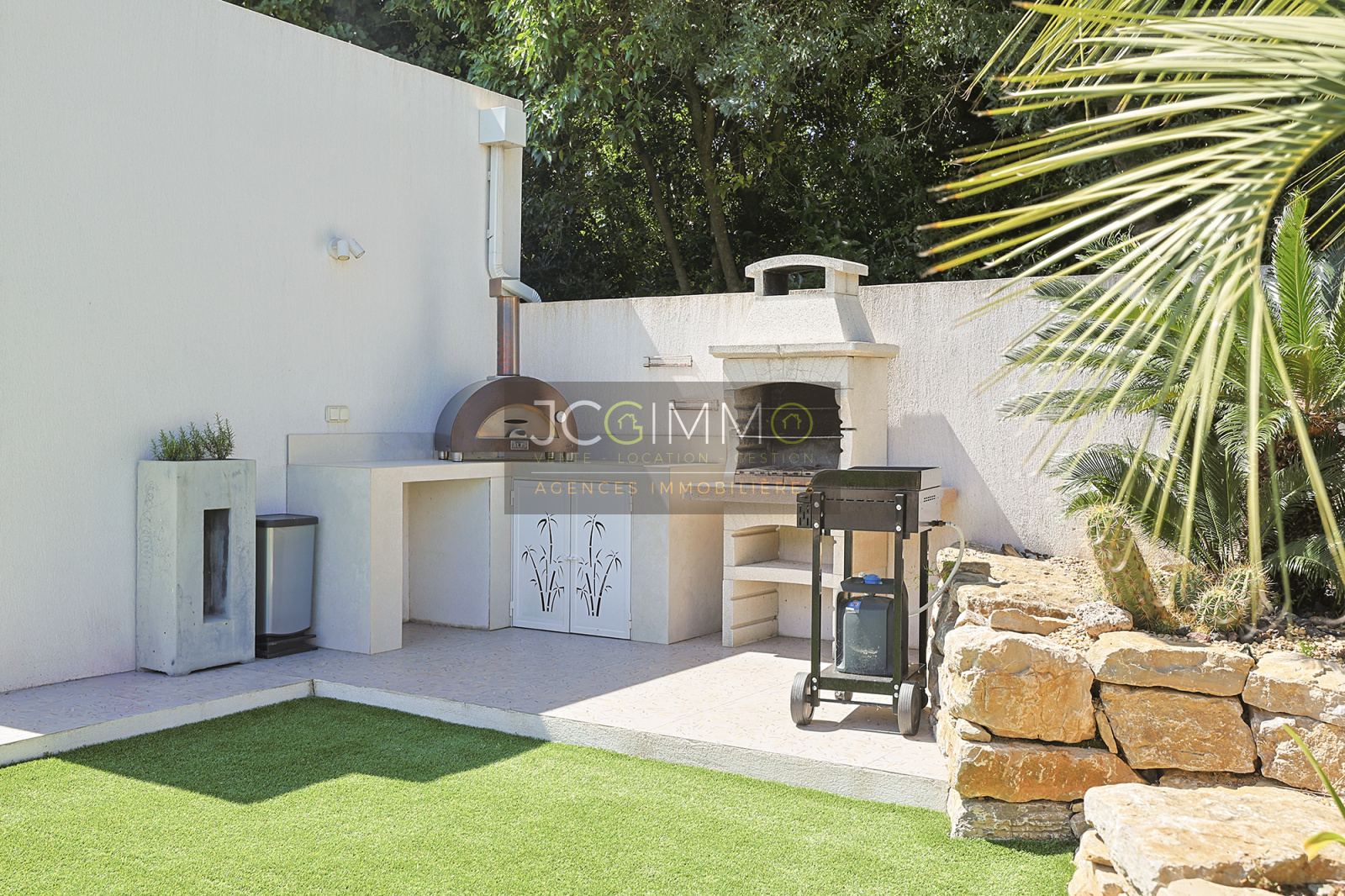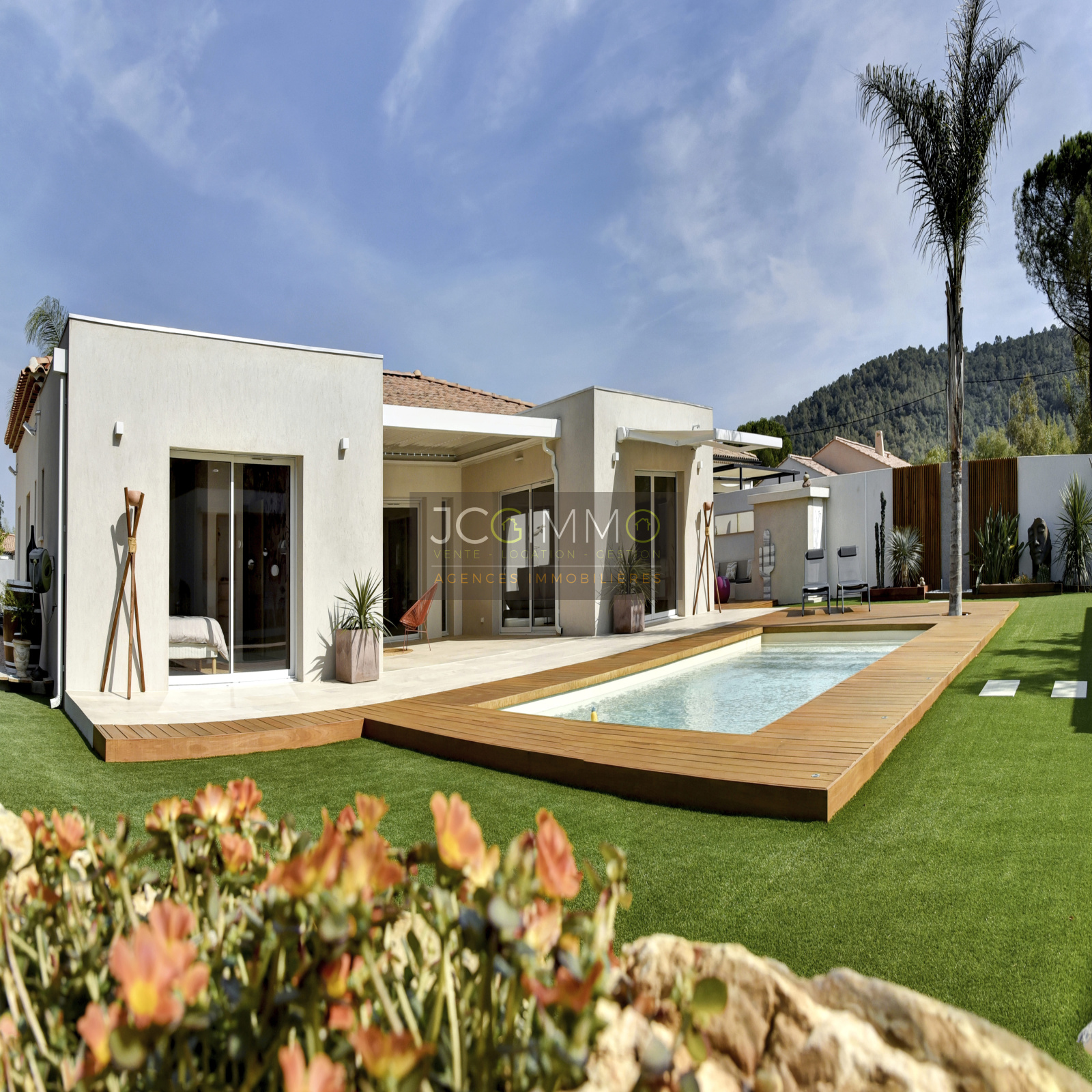 À l’extérieur, le jardin plat et arboré, soigneusement aménagé avec des essences méditerranéennes et exotiques, vous séduira par ses nombreux espaces de détente. Vous y trouverez une piscine 8x4 avec contrôle auto du pH et du chlore, plusieurs terrasses conviviales (pergola bioclimatique, carrelage d'exception et bois IP exotique), un terrain de pétanque, un spa et un coin barbecue pour des moments inoubliables en famille ou entre amis. La villa est équipée du Canal de Provence, ce qui permet un entretien optimal à moindre coût.