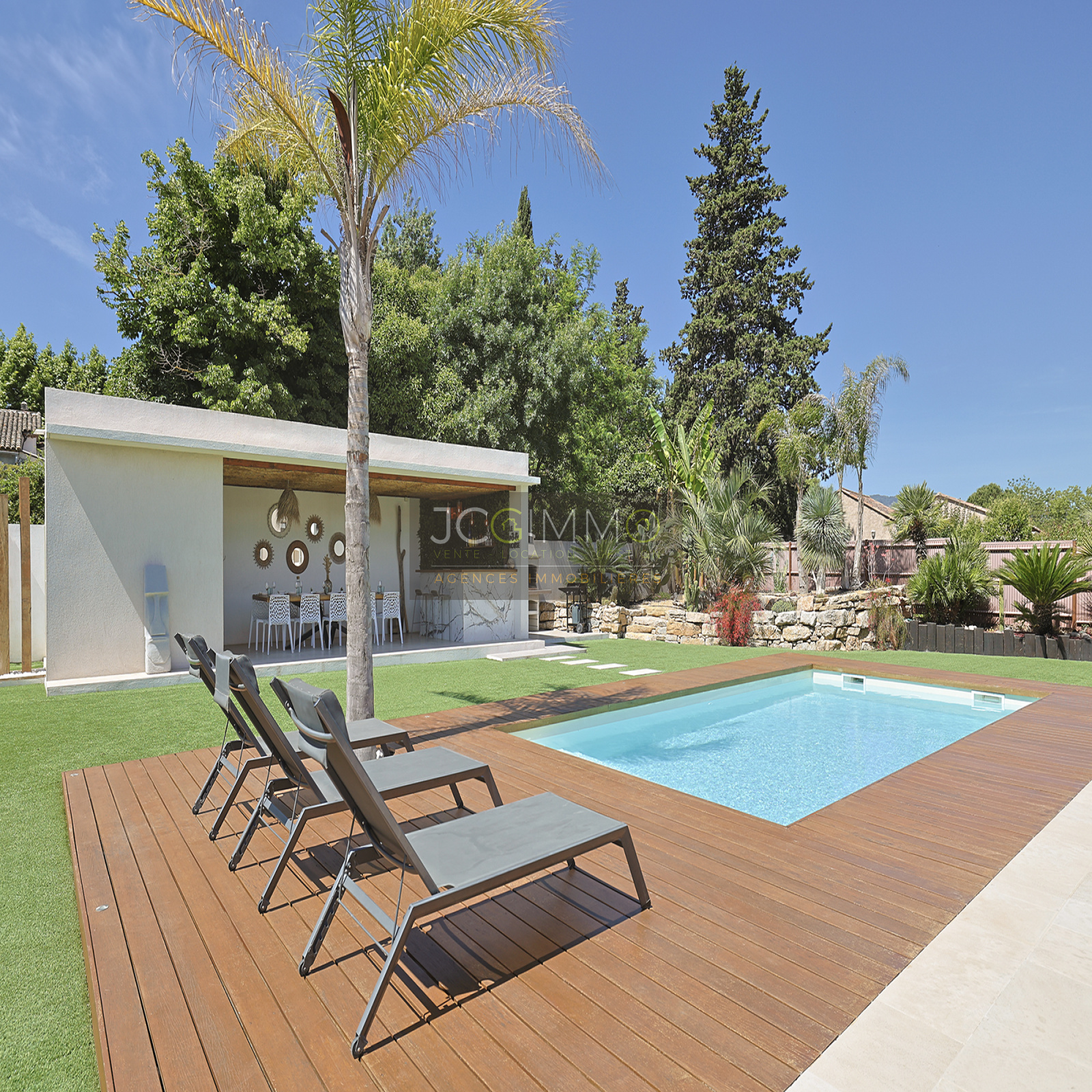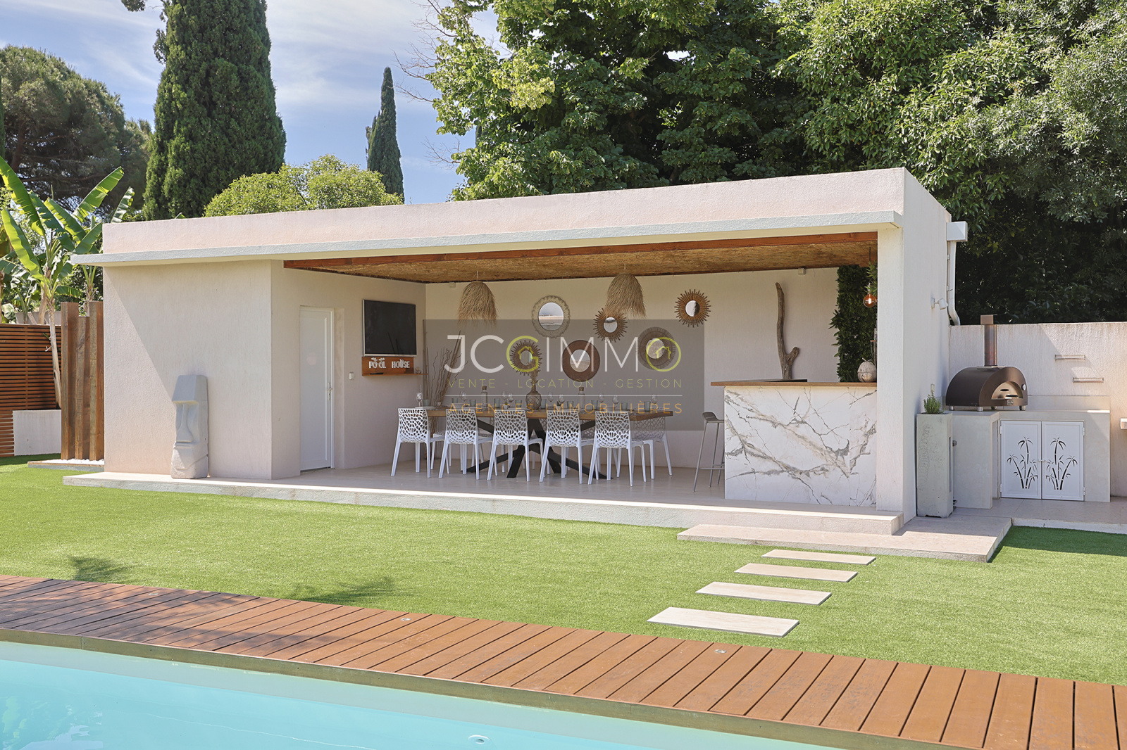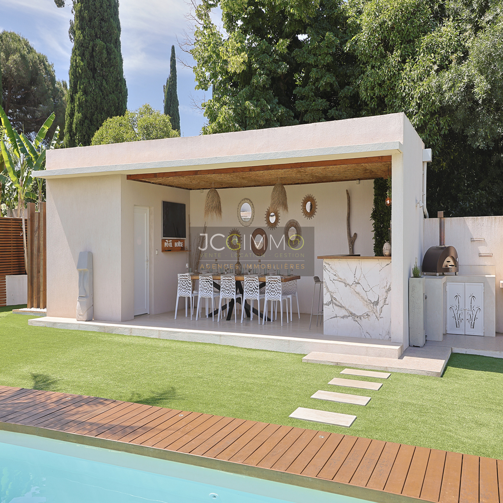 The 45 m² pool house is a true highlight. It includes an outdoor bar, a dining area (seating 12), a summer kitchen, and a toilet. Facing the pool, it can easily be converted into a self-contained one-bedroom apartment.
