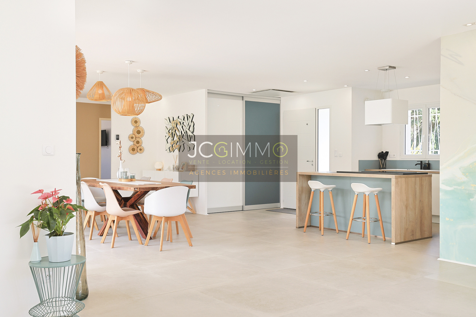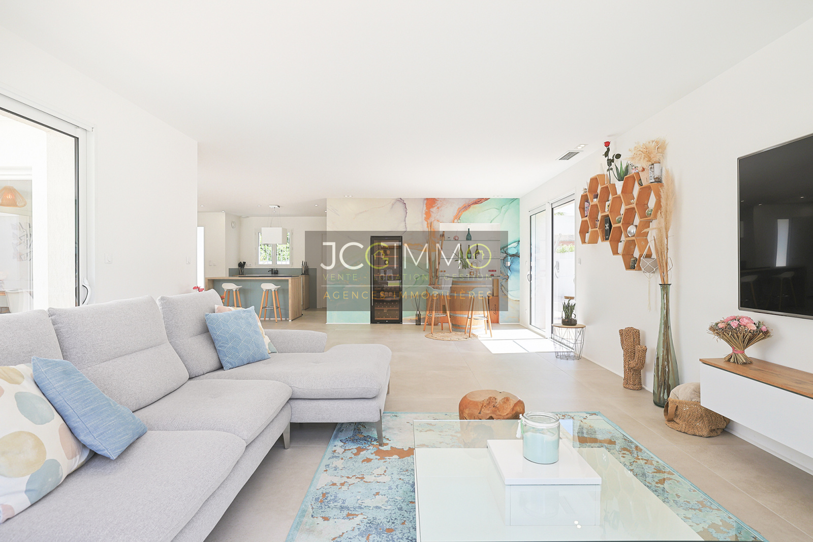 La villa se compose d’un vaste espace de vie de 83 m² réunissant un salon, une salle à manger, une cuisine ouverte entièrement équipée et un cellier/buanderie. Les baies vitrées à galandage permettent une ouverture totale sur l’extérieur, créant une continuité naturelle entre les espaces intérieurs et extérieurs.