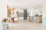 The villa features a spacious 83 m² living area that includes a lounge, dining room, fully equipped open-plan kitchen, and a pantry/laundry room. Pocket sliding glass doors allow for a seamless connection between the indoor and outdoor spaces.