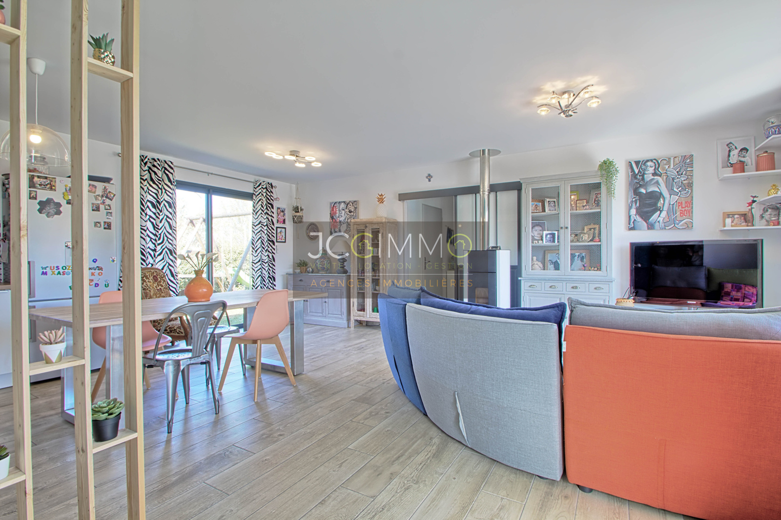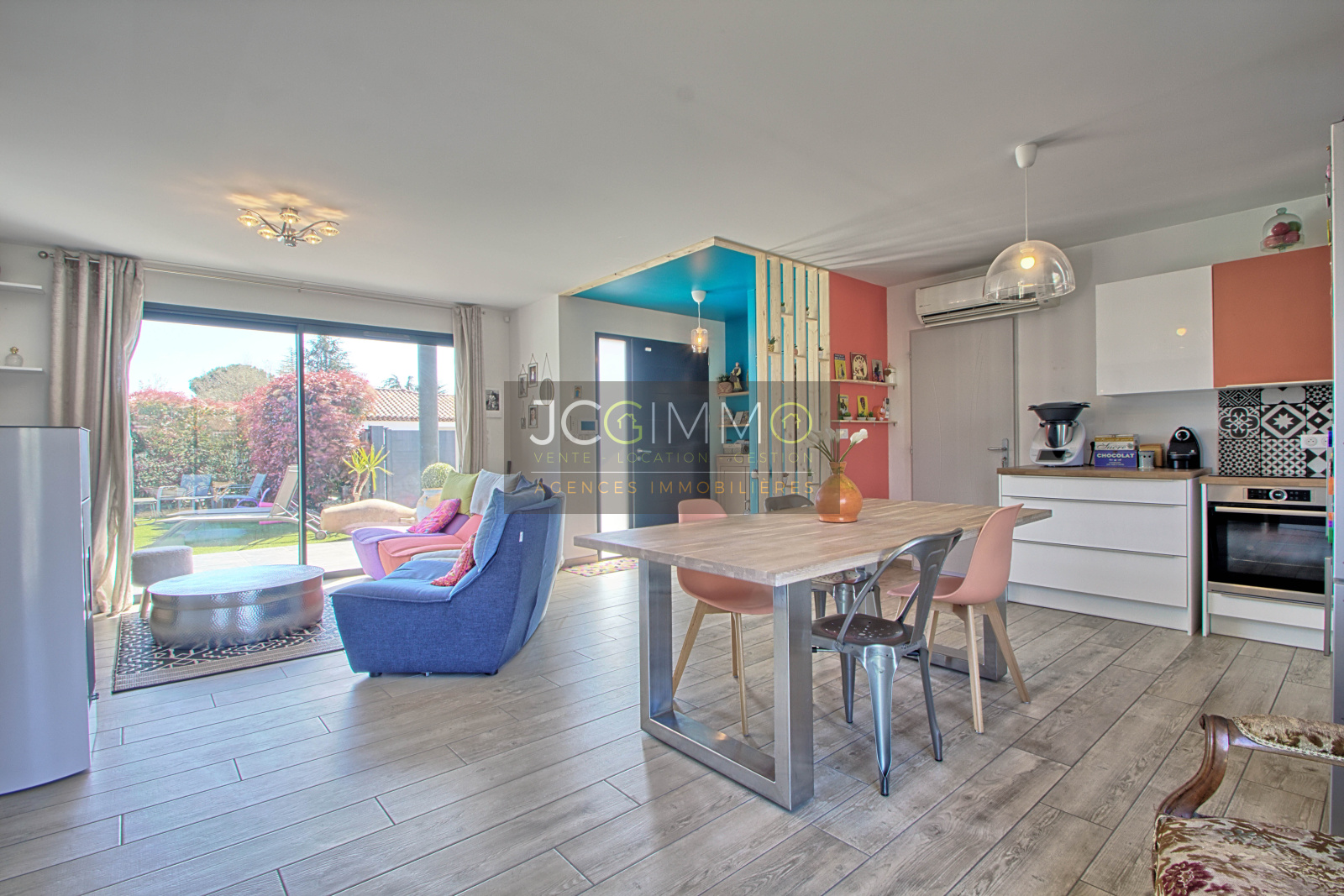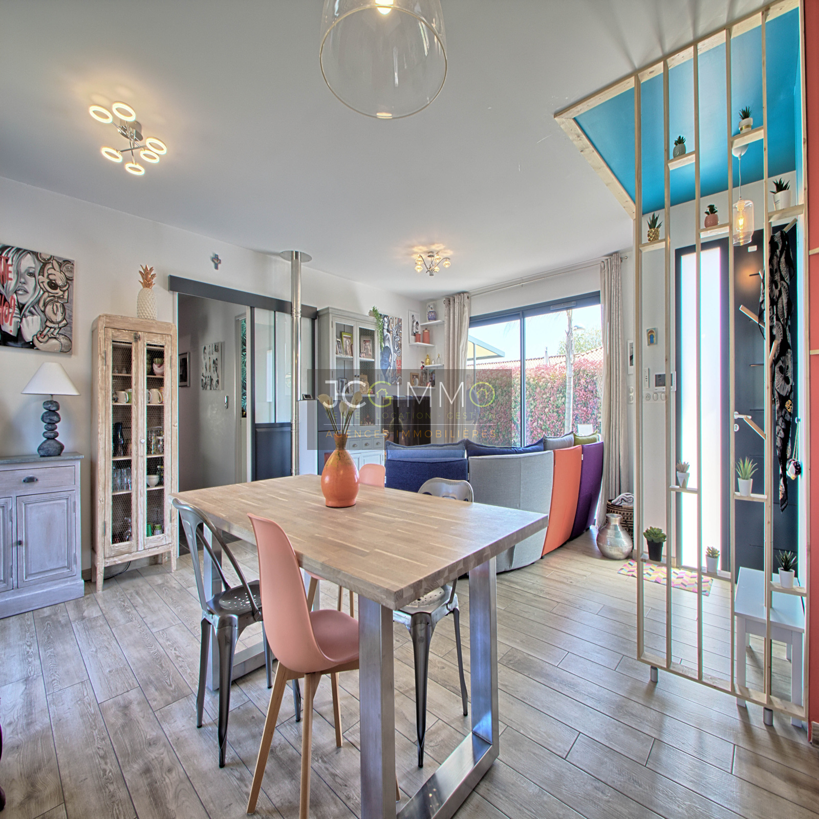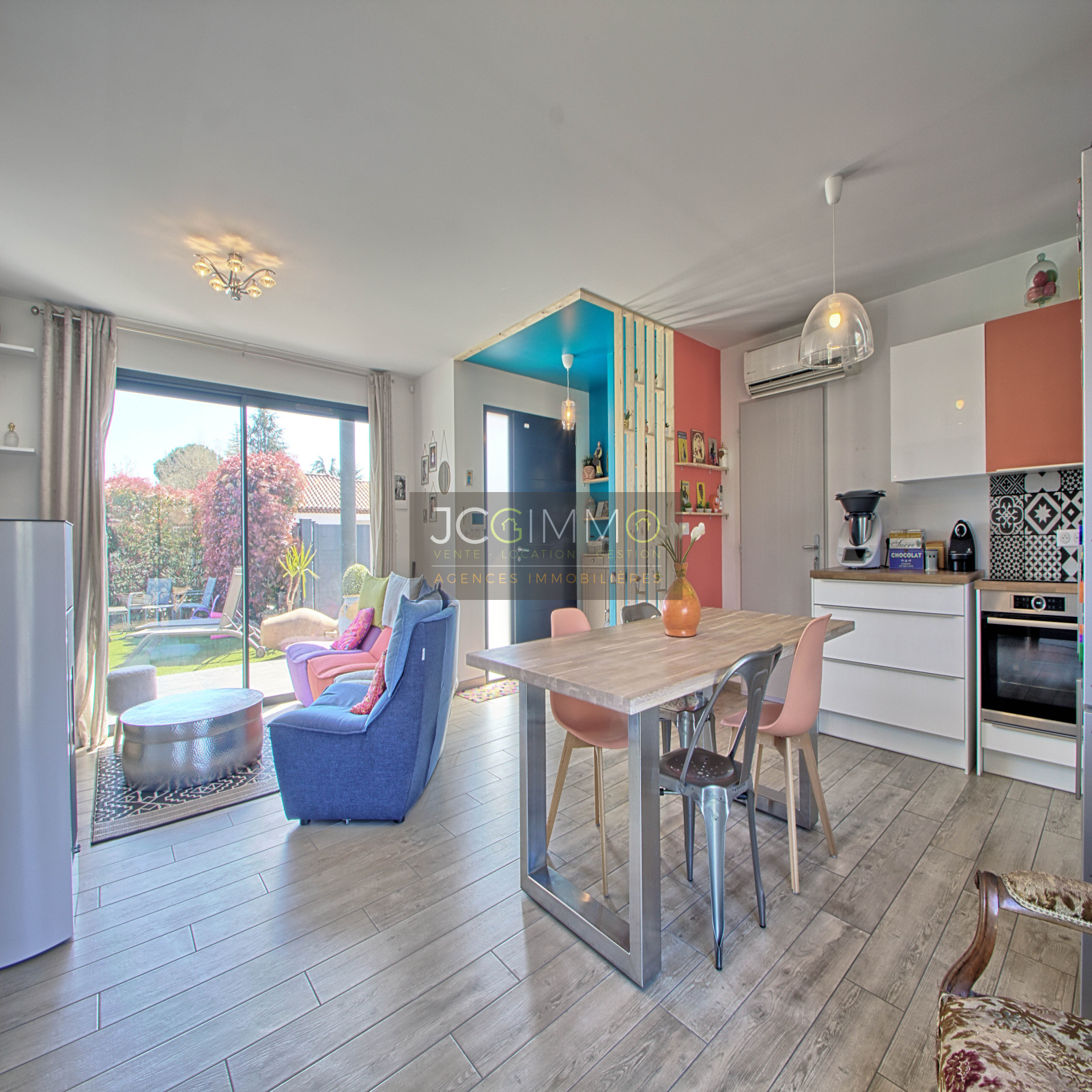 Lumineuse de part son exposition plein SUD, cette superbe maison de 100m² (dont un garage aménagé de 16m²) dispose d’un agréable terrain plat et clôturé de 675m² et d’une piscine.
