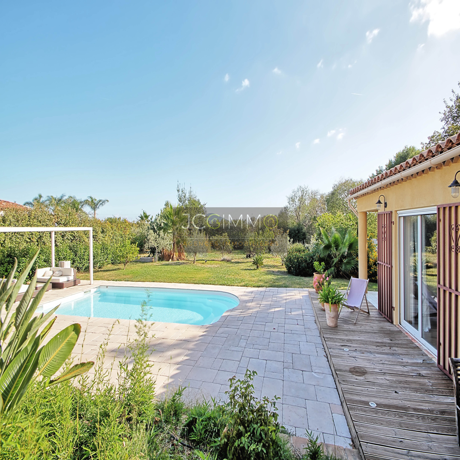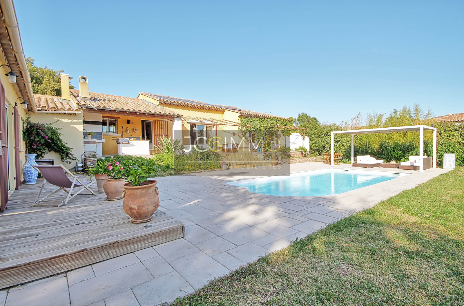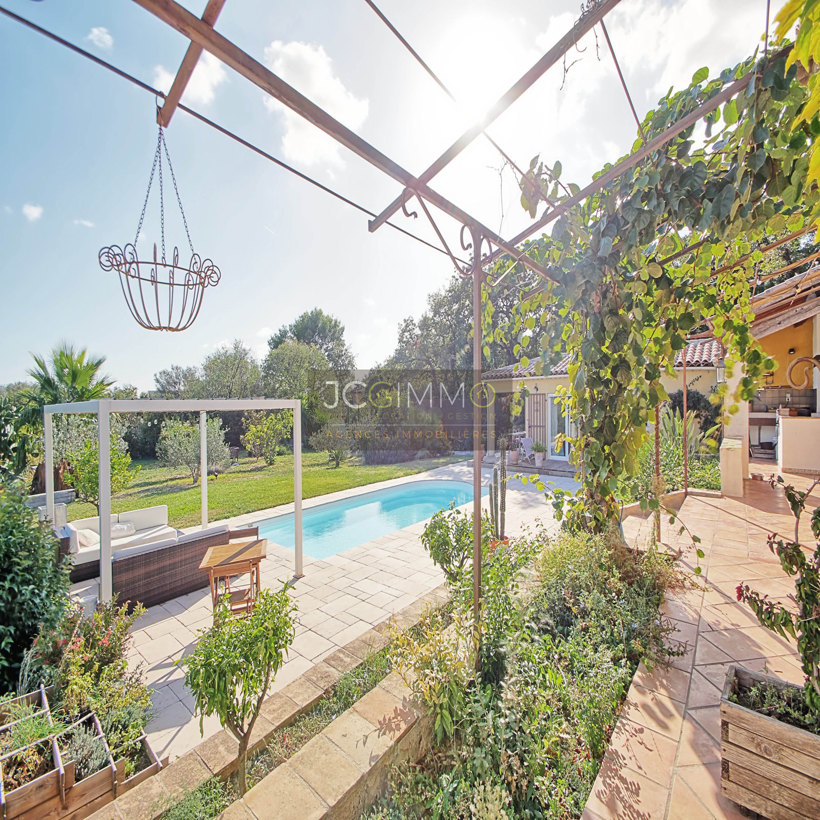 A l'EXTERIEUR, un beau terrain plat et arboré, exposition plein Sud, proposant un très bel espace terrasse aménagé avec soin, un superbe espace cuisine d'été avec piscine idéal pour organiser de bons barbecues en famille/amis. Cette propriété propose de belles prestations, le tout sur un terrain plat de 2500m² très arboré et sans aucun vis à vis, accueillant une formidable piscine chauffée de 8m x 4m.