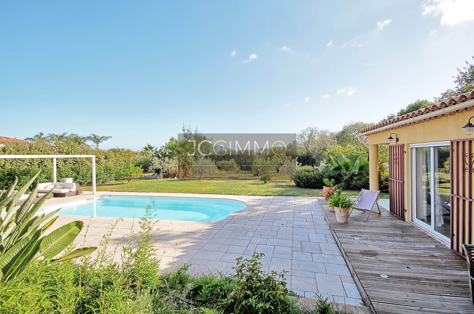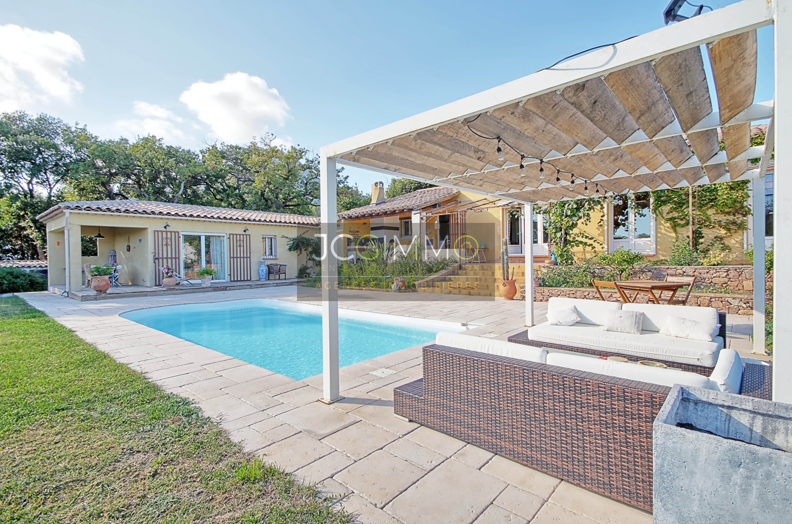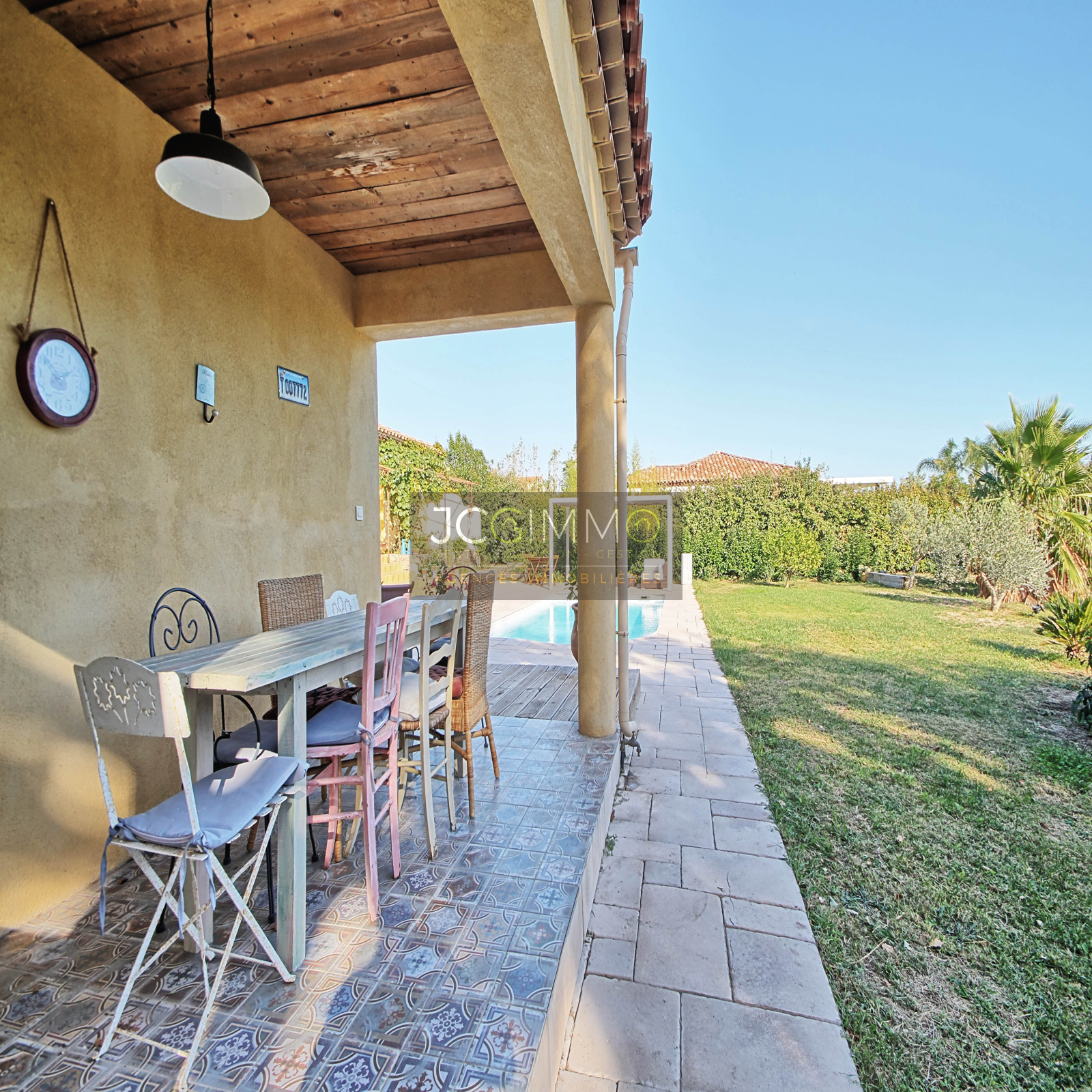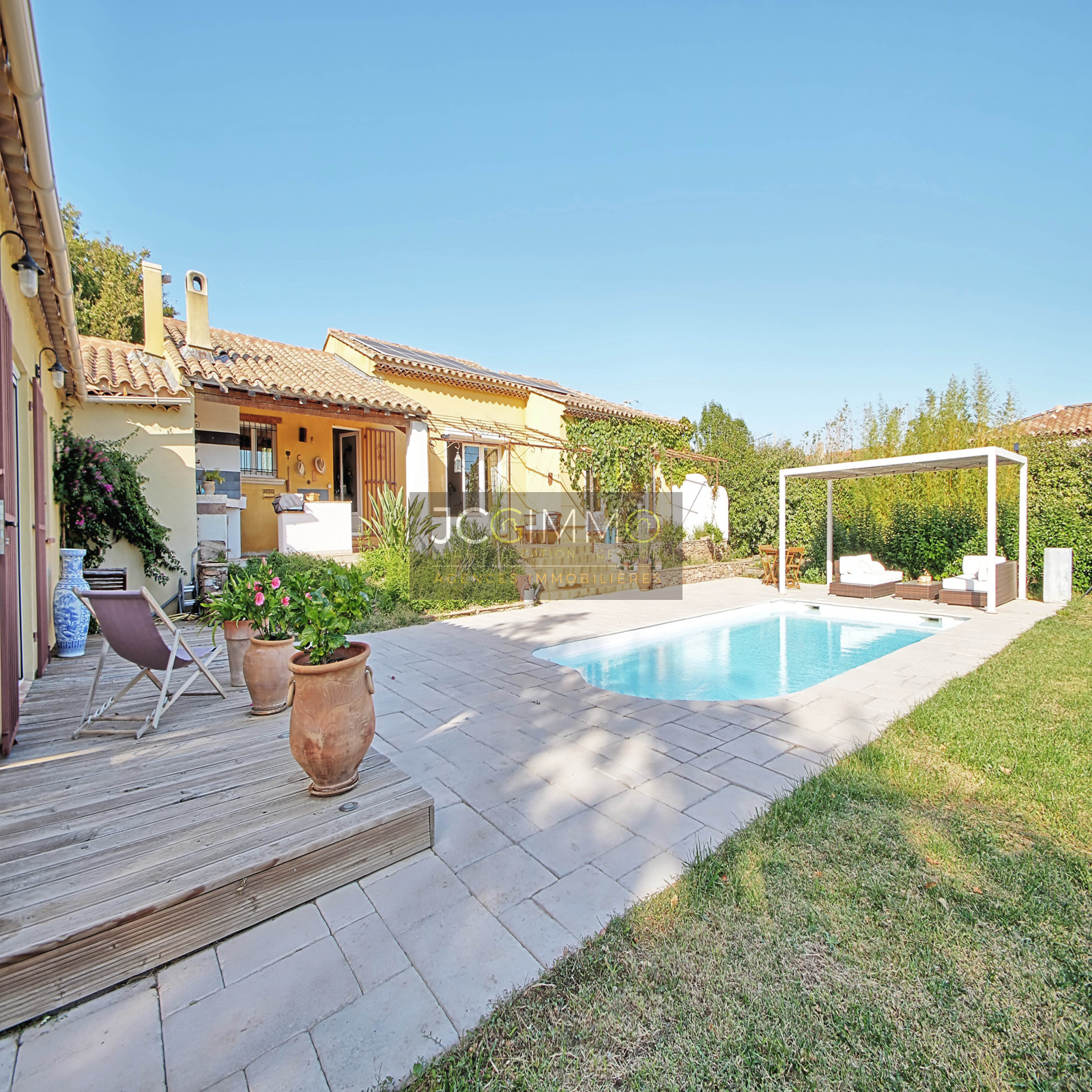 A l'EXTERIEUR, un beau terrain plat et arboré, exposition plein Sud, proposant un très bel espace terrasse aménagé avec soin, un superbe espace cuisine d'été avec piscine idéal pour organiser de bons barbecues en famille/amis. Cette propriété propose de belles prestations, le tout sur un terrain plat de 2500m² très arboré et sans aucun vis à vis, accueillant une formidable piscine chauffée de 8m x 4m.