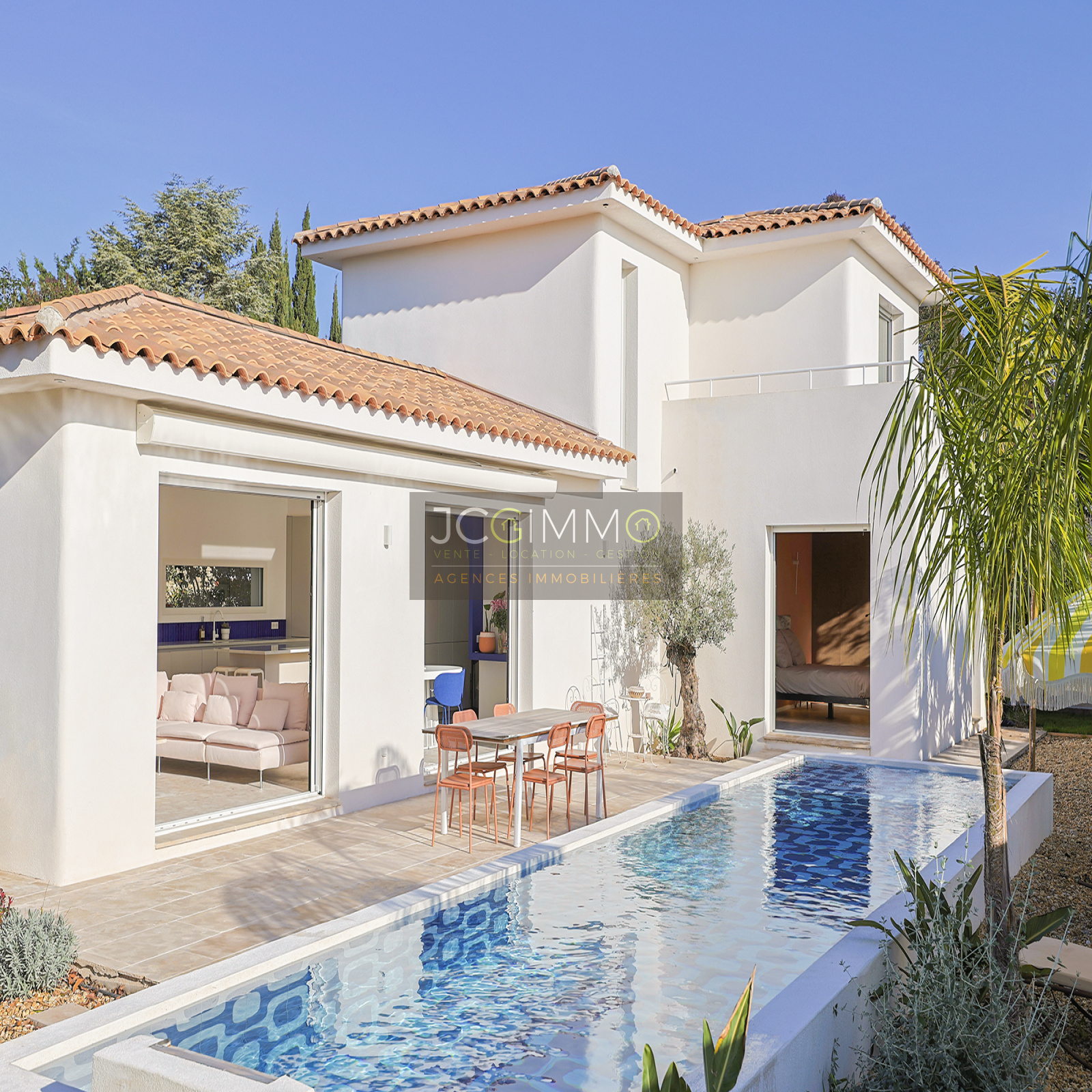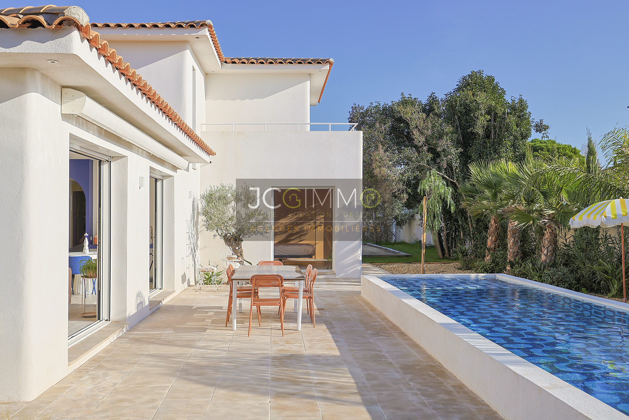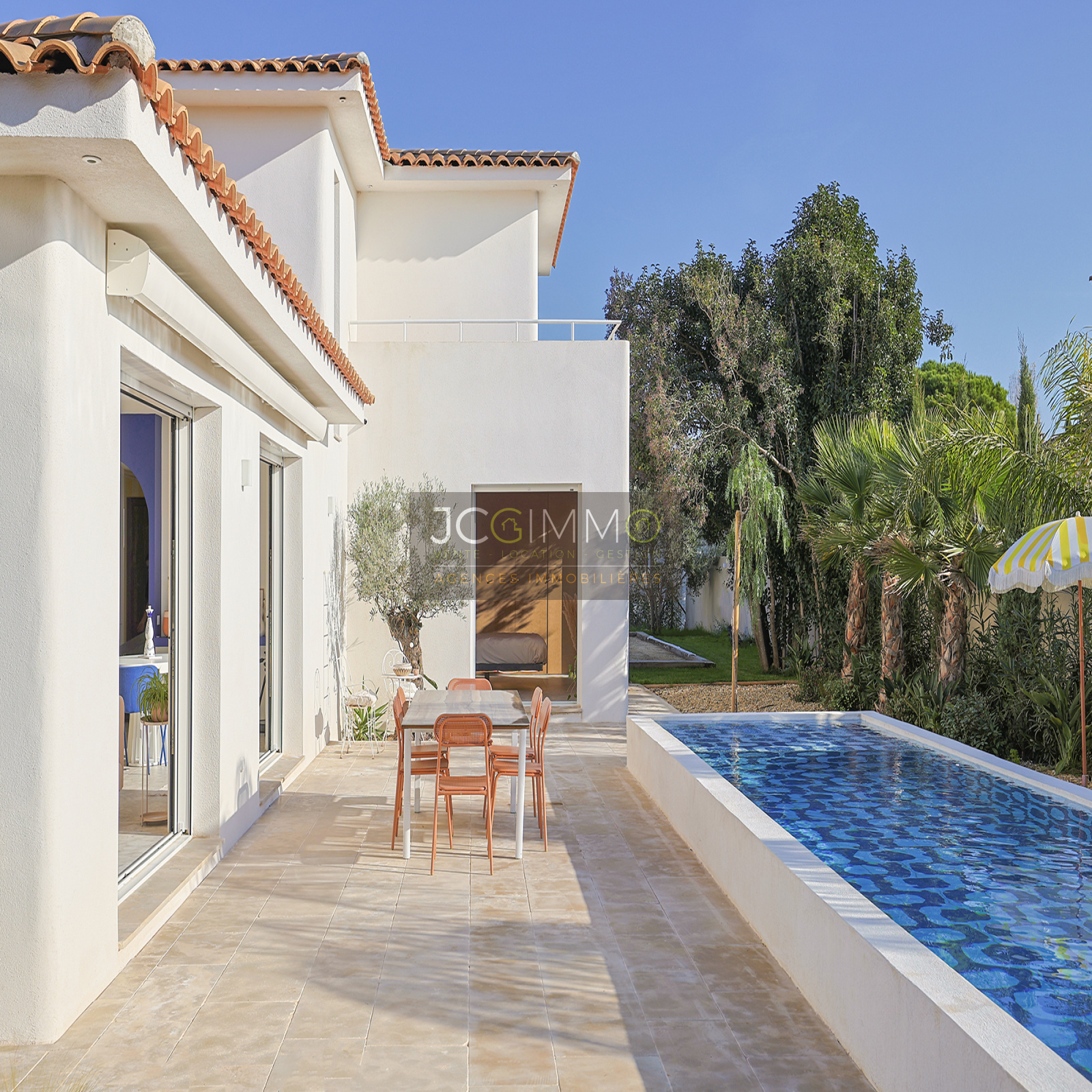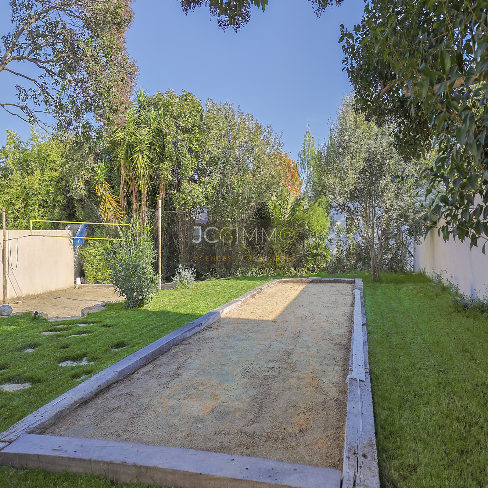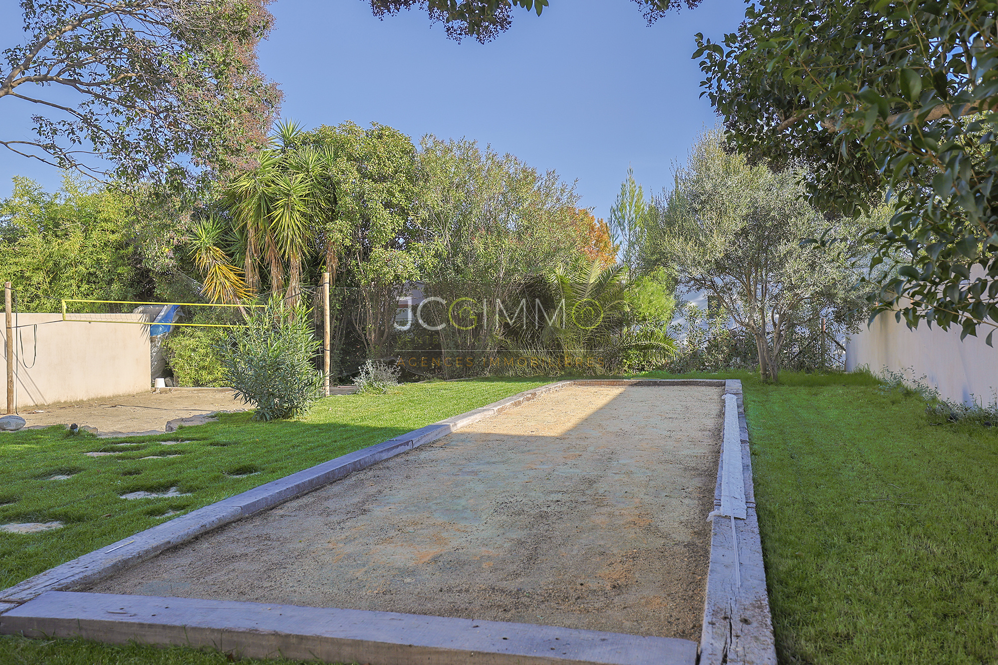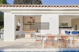 À l’extérieur, la piscine est superbe et très graphique, couloir de nage de 2.5m x 10.5m. La villa dispose également d’un boulodrome et d’un terrain de Beach volley, parfaits pour des moments de détente en plein air. Belle terrasse en bord de piscine avec store électrique.