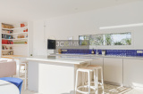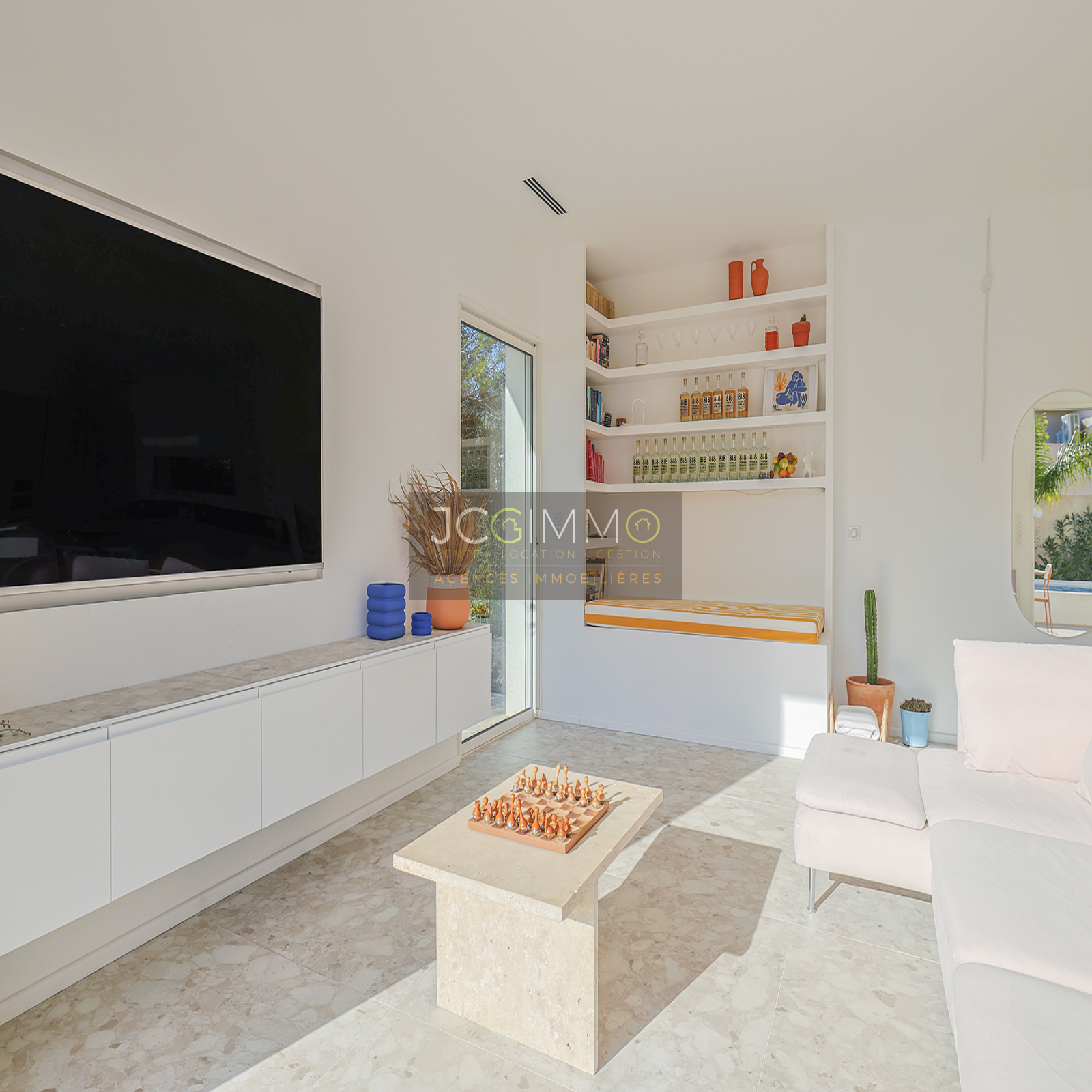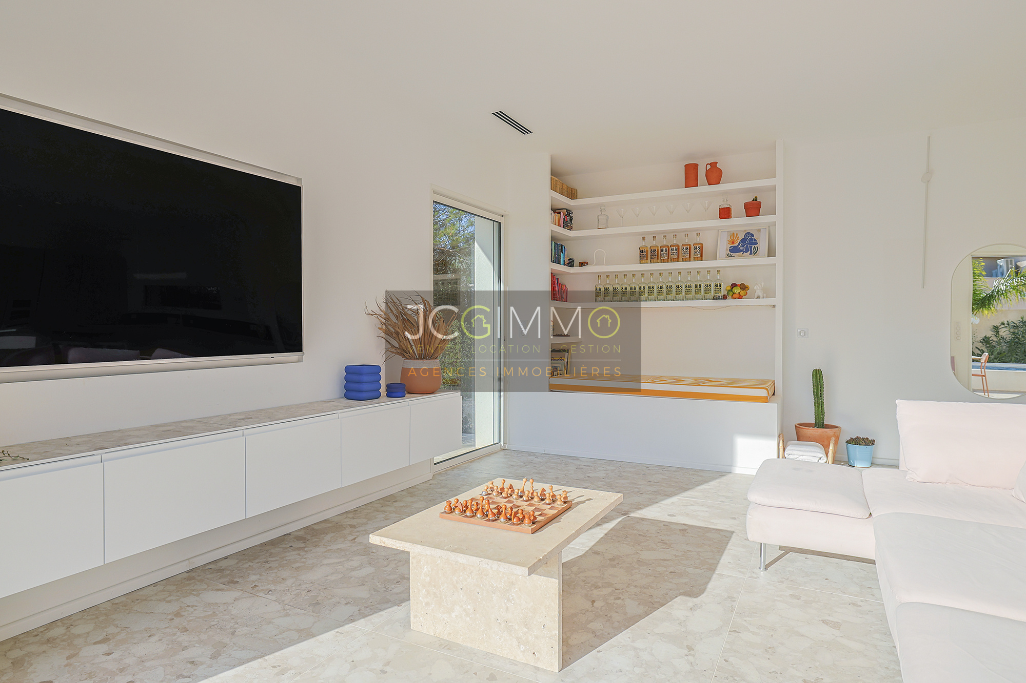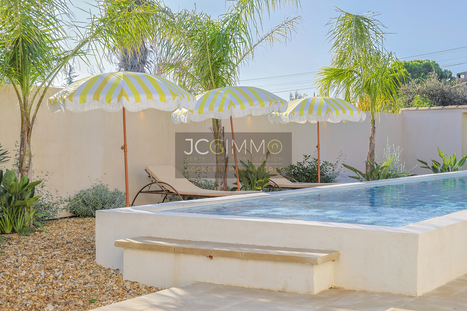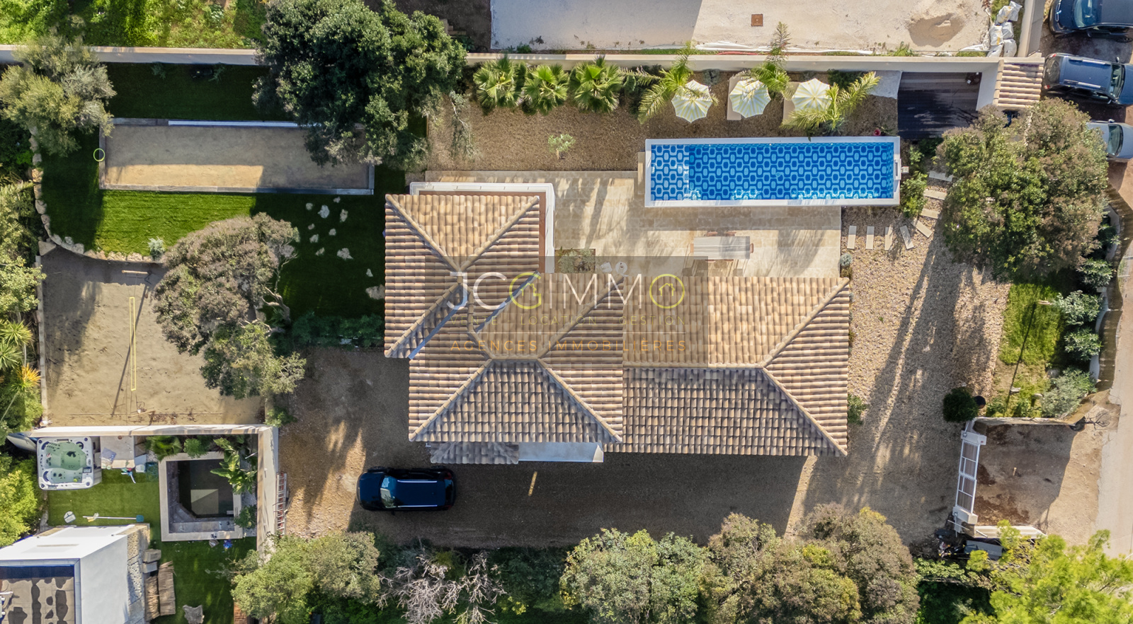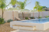 À l’extérieur, la piscine est superbe et très graphique, couloir de nage de 2.5m x 10.5m. La villa dispose également d’un boulodrome et d’un terrain de Beach volley, parfaits pour des moments de détente en plein air. Belle terrasse en bord de piscine avec store électrique.