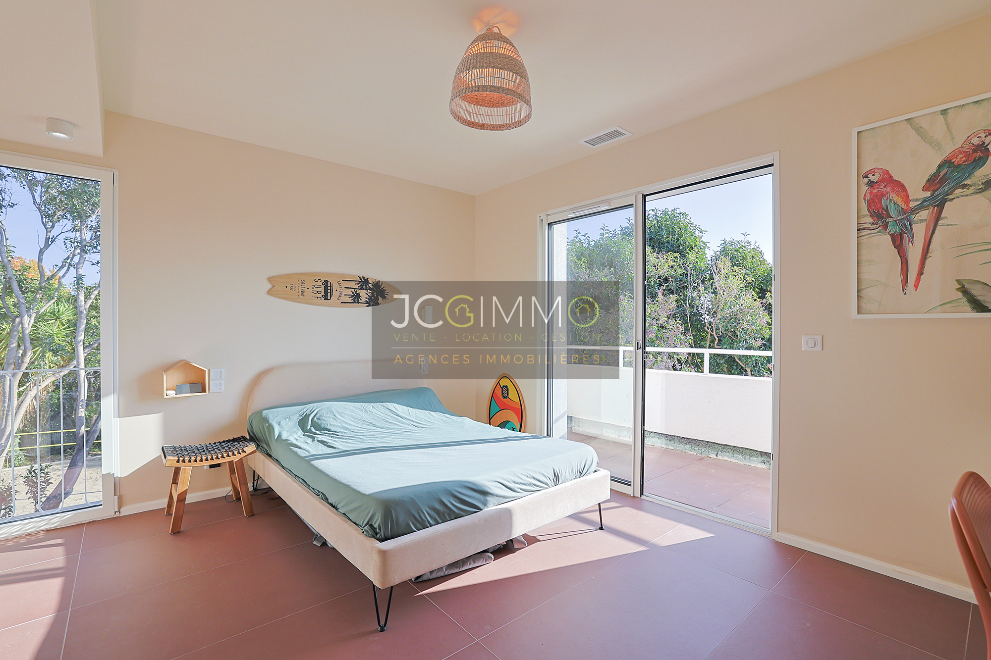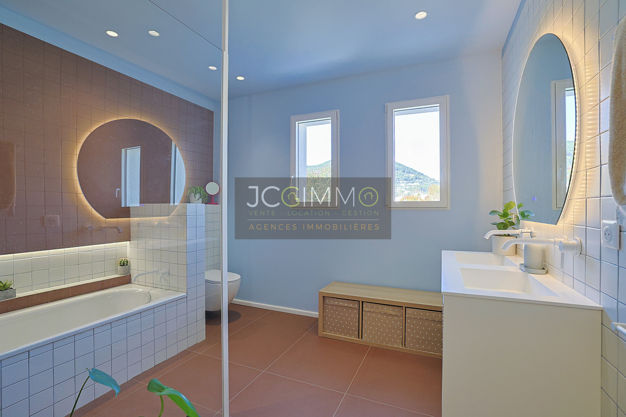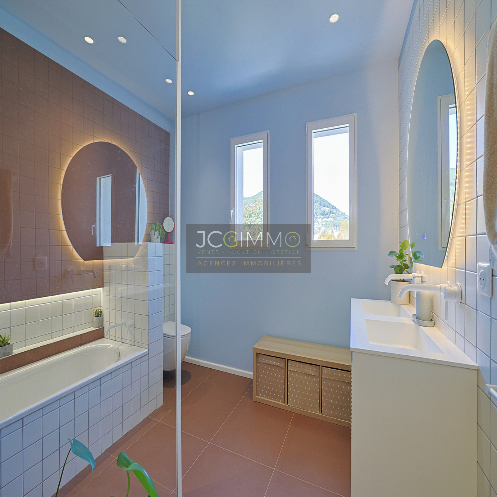 À l'étage, deux chambres spacieuses avec rangements dont l’une avec sa terrasse privative, une salle de bains avec baignoire, douche et WC.