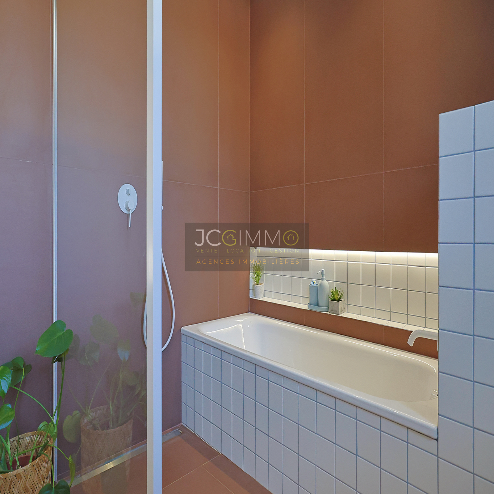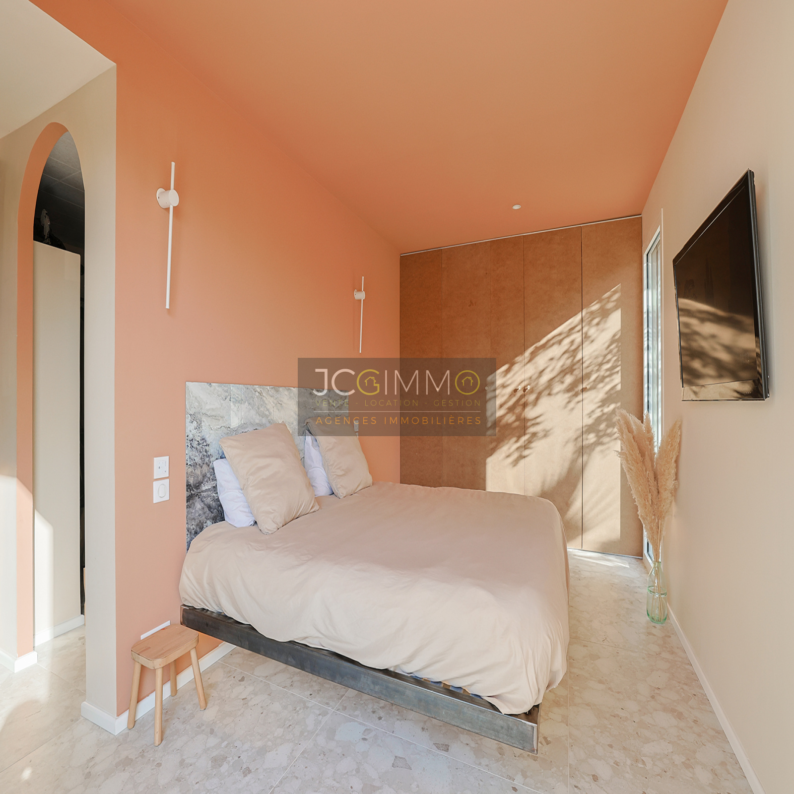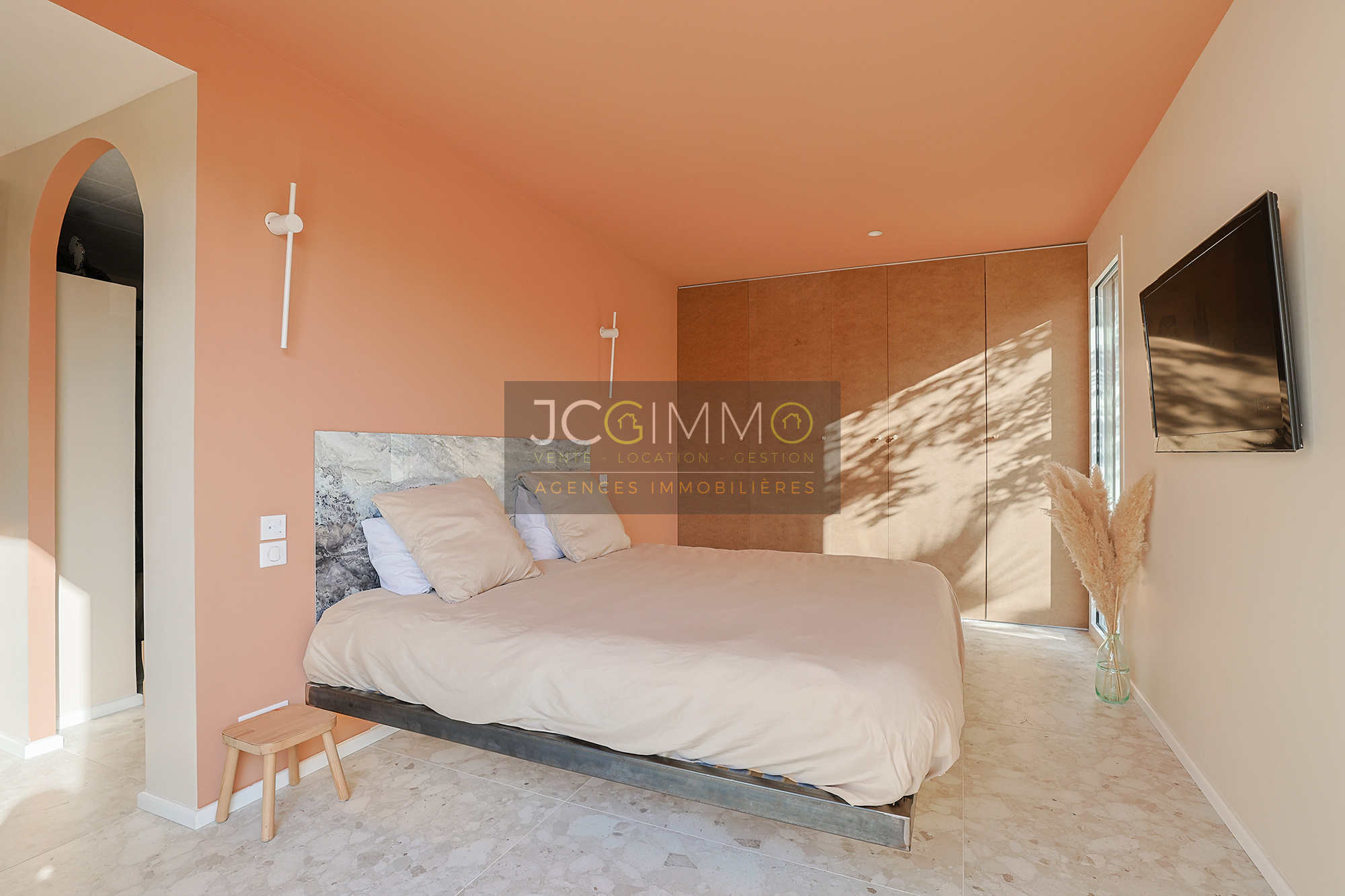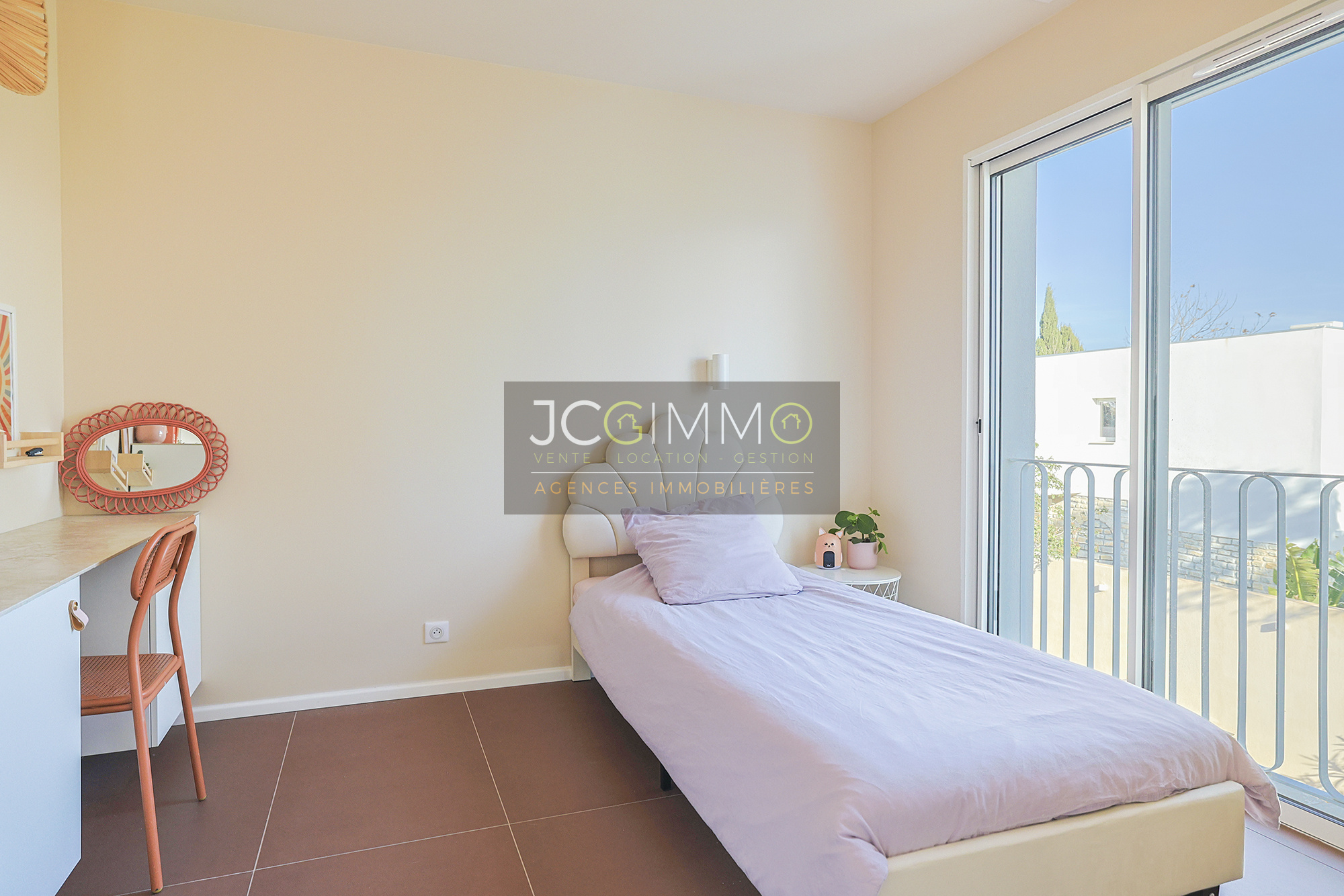 À l'étage, deux chambres spacieuses avec rangements dont l’une avec sa terrasse privative, une salle de bains avec baignoire, douche et WC.