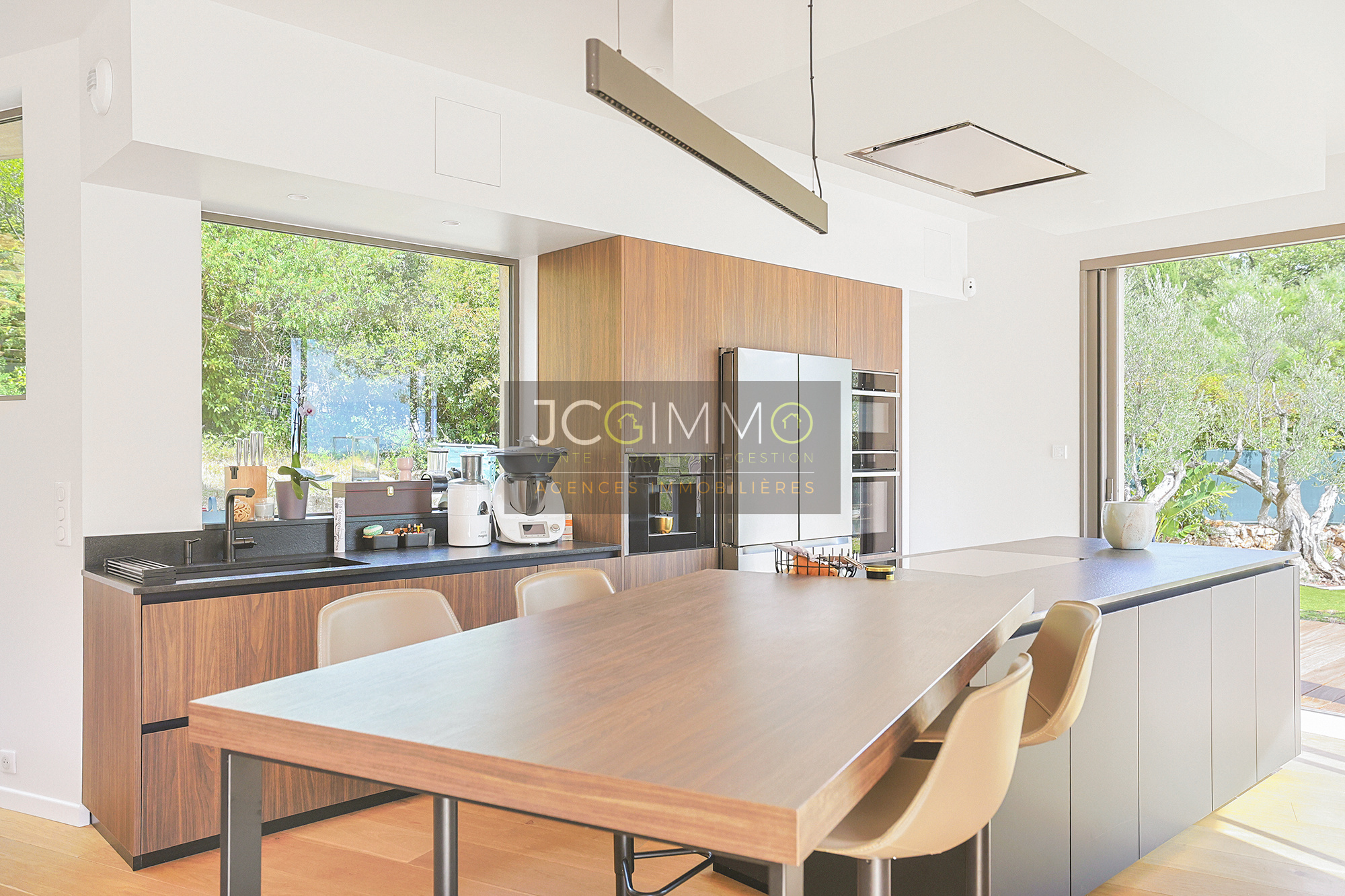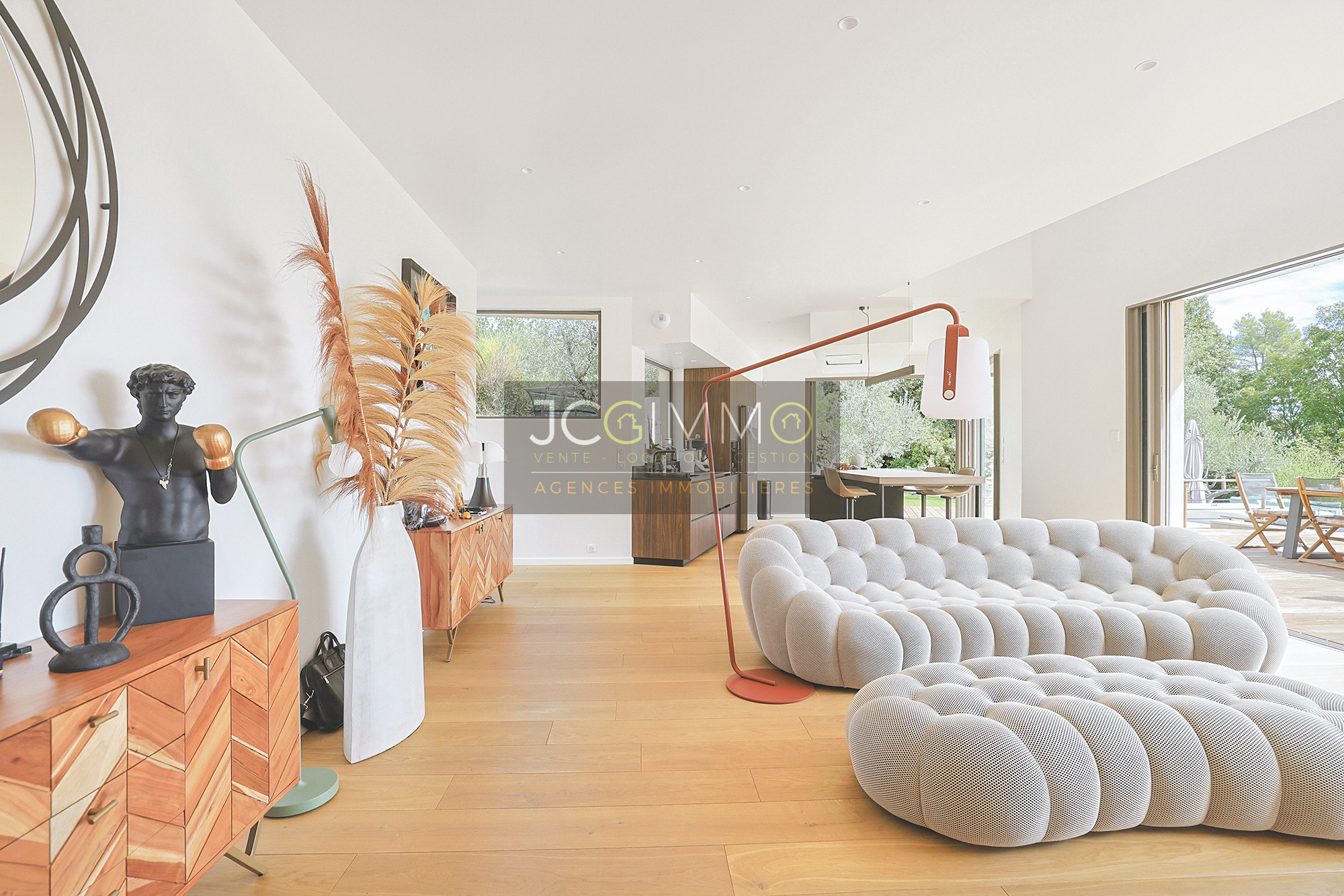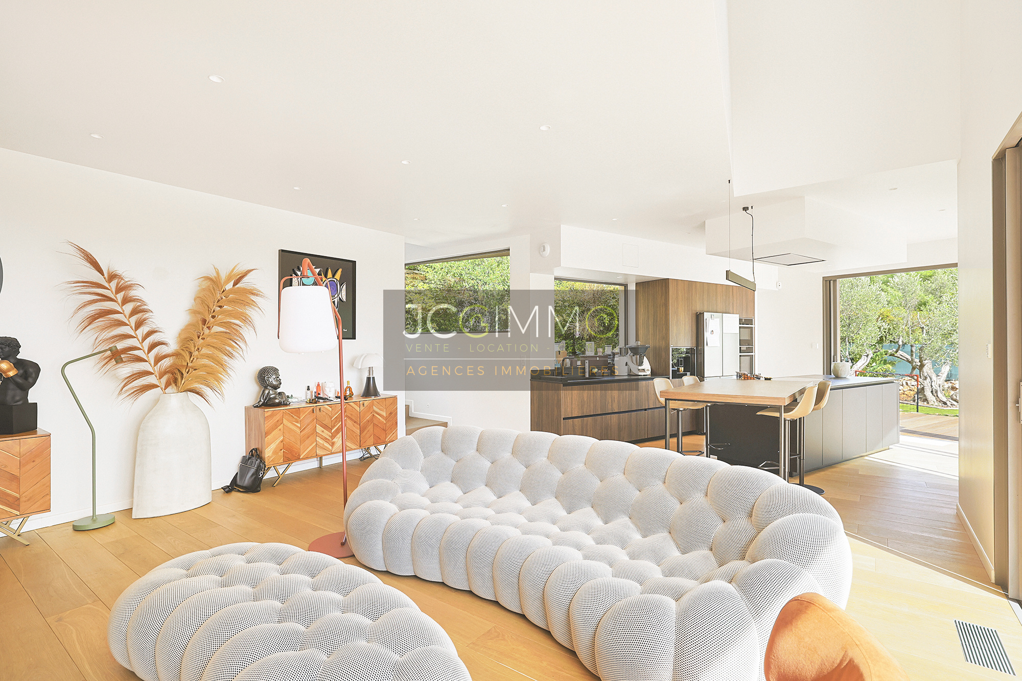 Édifiée sur un magnifique terrain paysager de 2 010 m², entièrement arboré d’oliviers, la propriété offre des volumes généreux et une luminosité exceptionnelle.