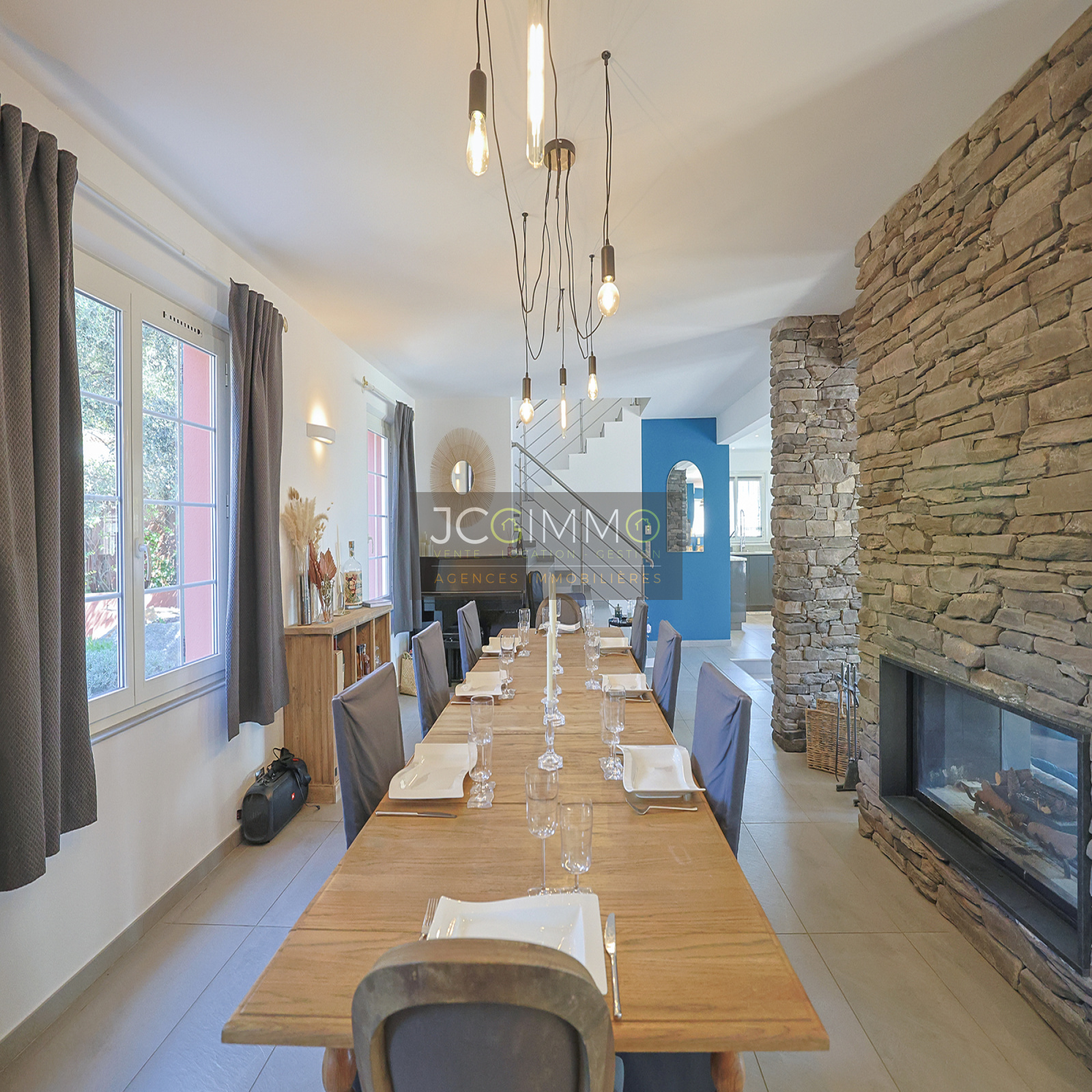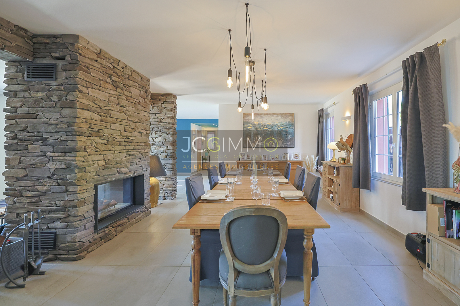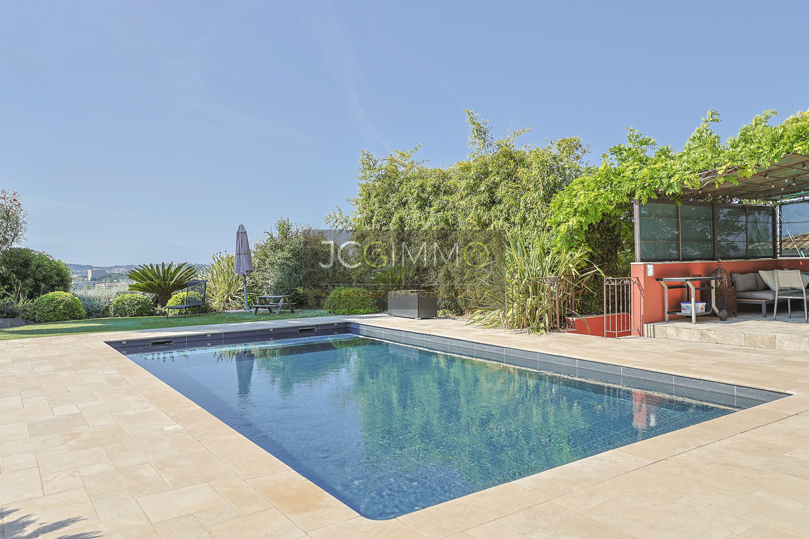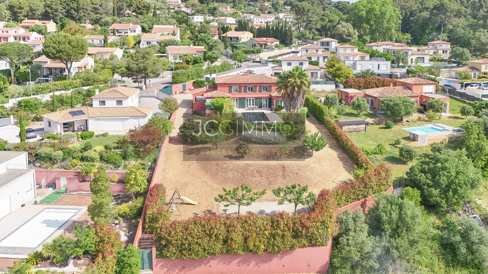 Plot of land with a surface area of 2142m², very well landscaped and planted with trees, with a lovely unobstructed view all the way to the sea. Enjoy the sunny days thanks to the 9m x 5m heated swimming pool. The terraces provide friendly spaces for outdoor dining or simply relaxing while admiring the garden surrounding the property. An automatic watering system ensures greenery in the garden all year round thanks to drilling.